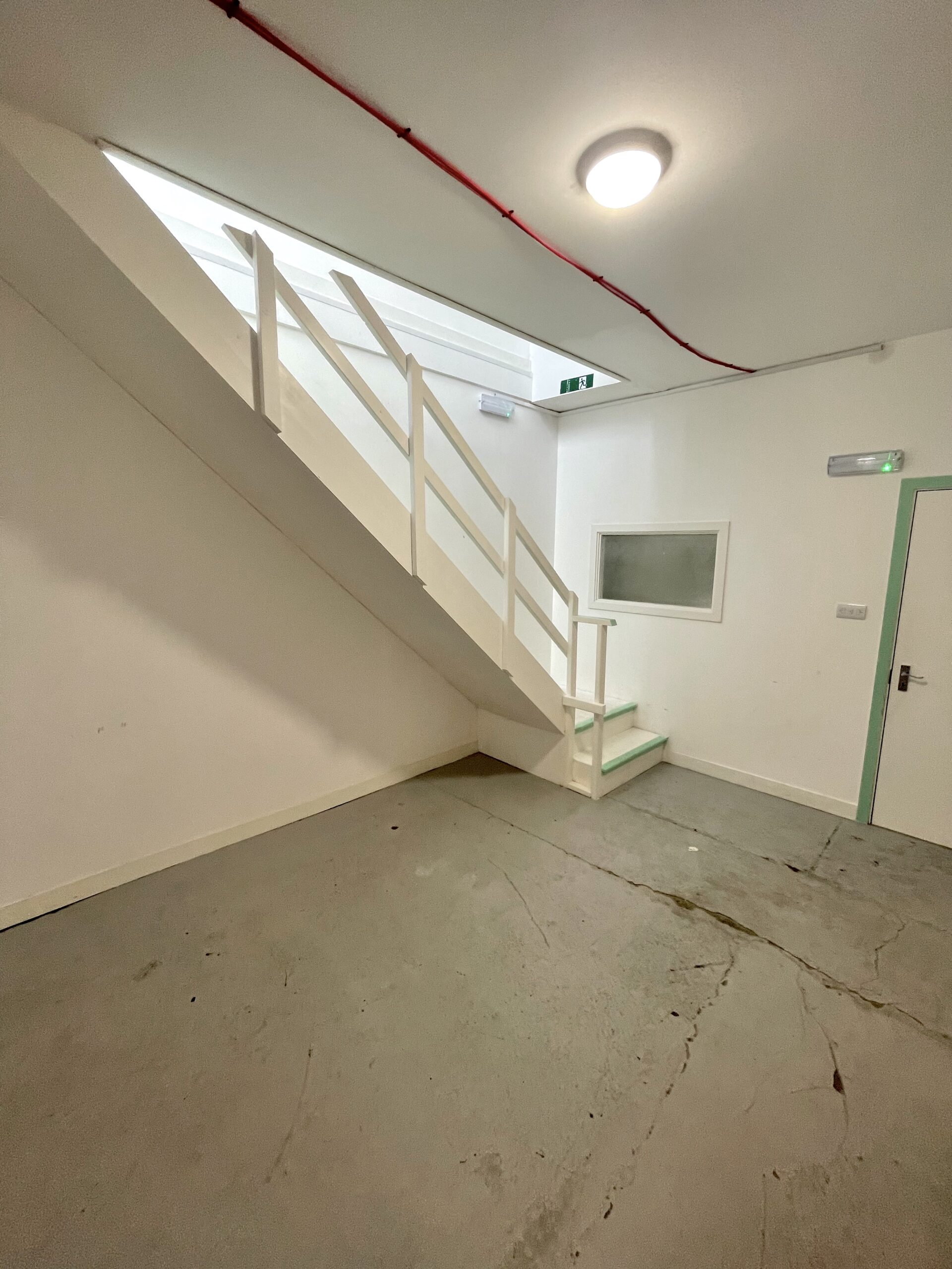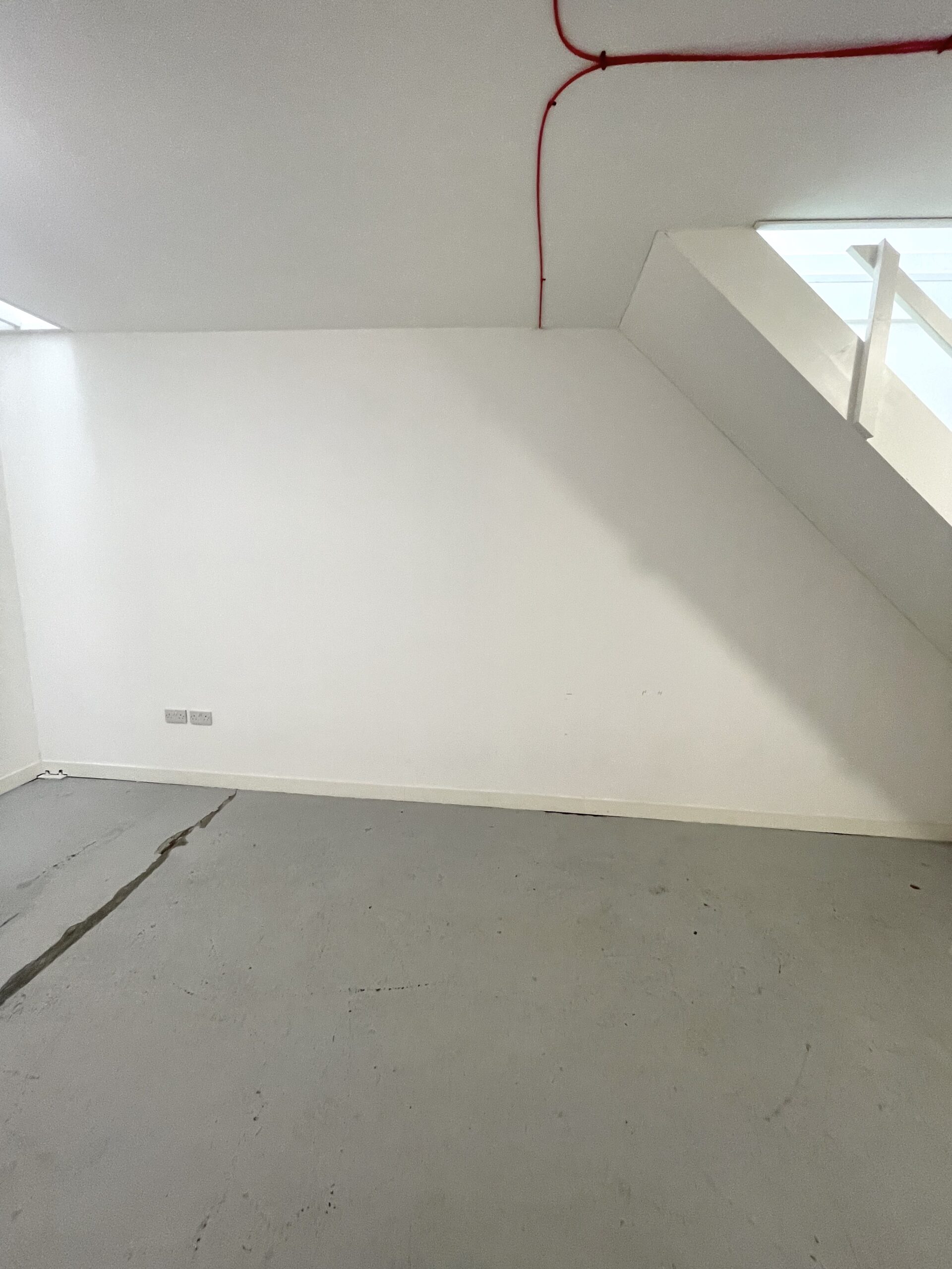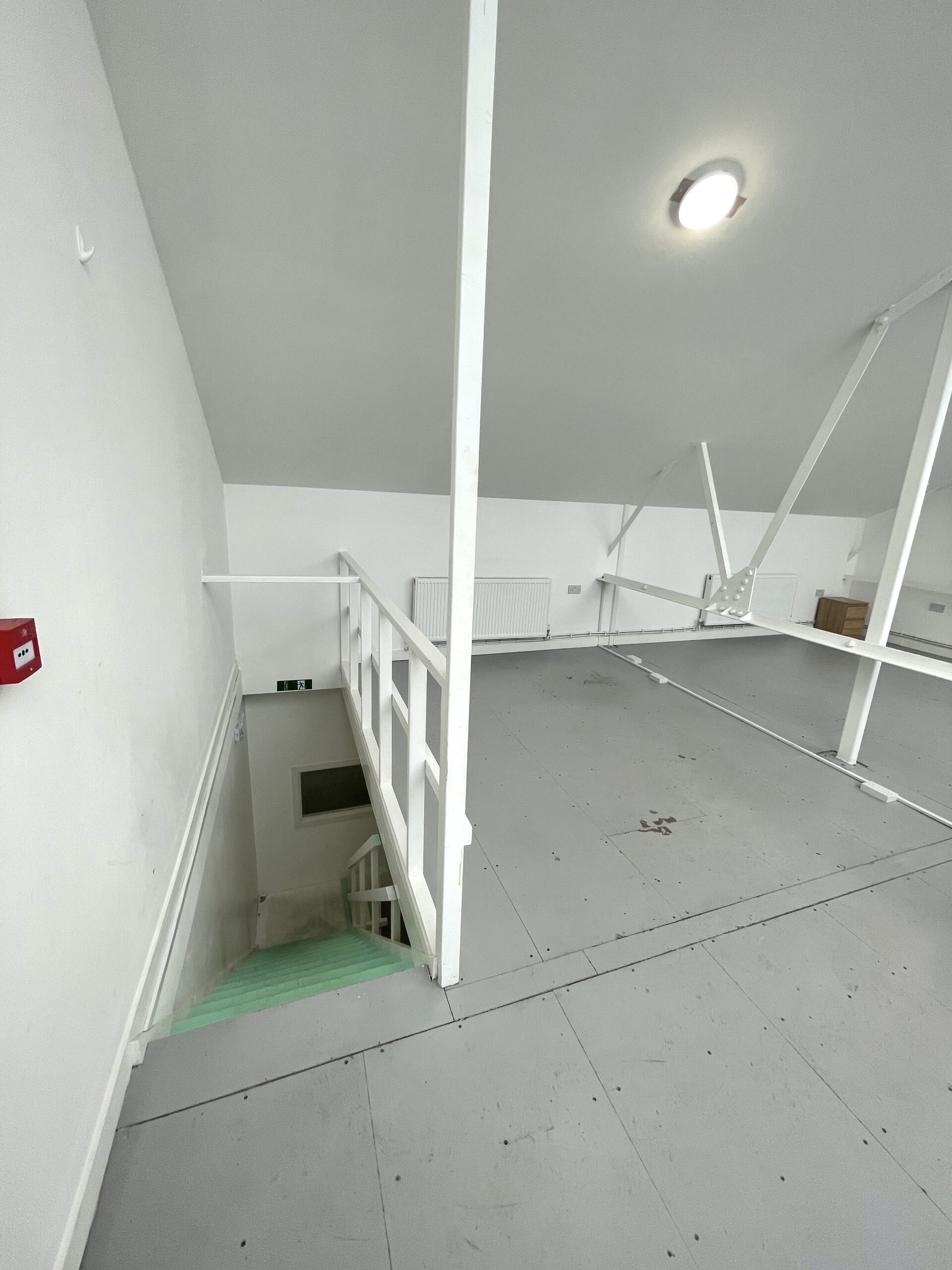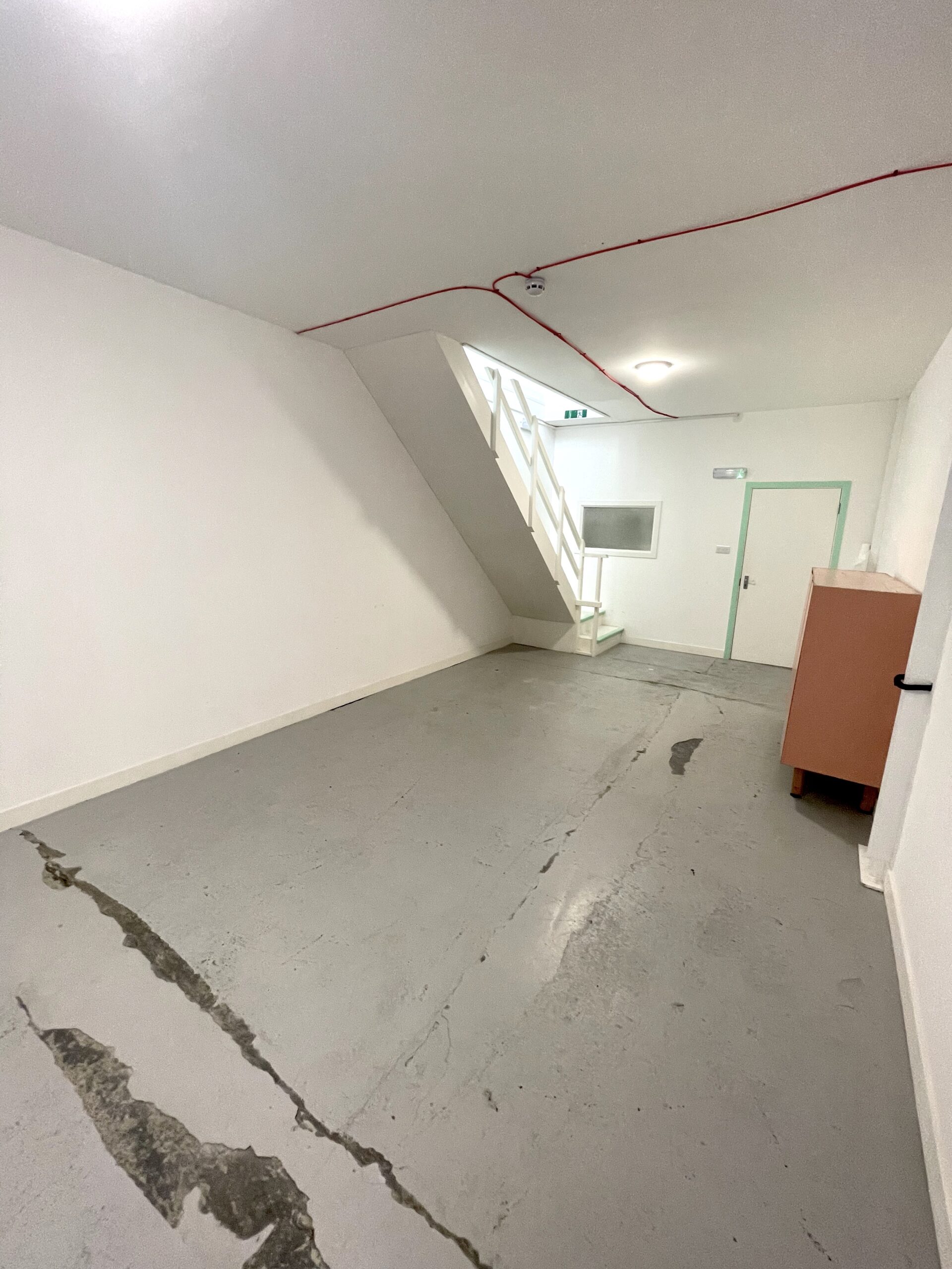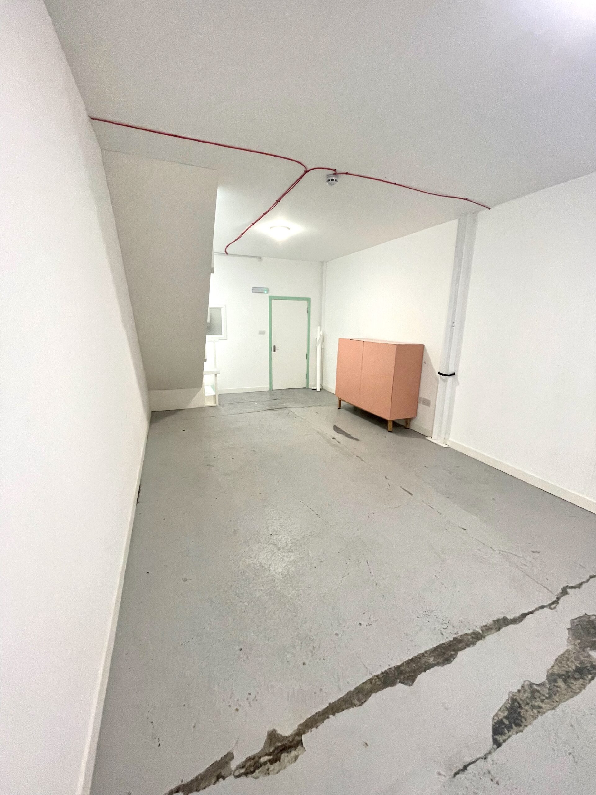 The ground floor is 300 sq ft and has a concrete floor painted flint grey, white walls with a 9ft high roof and a window for natural light.