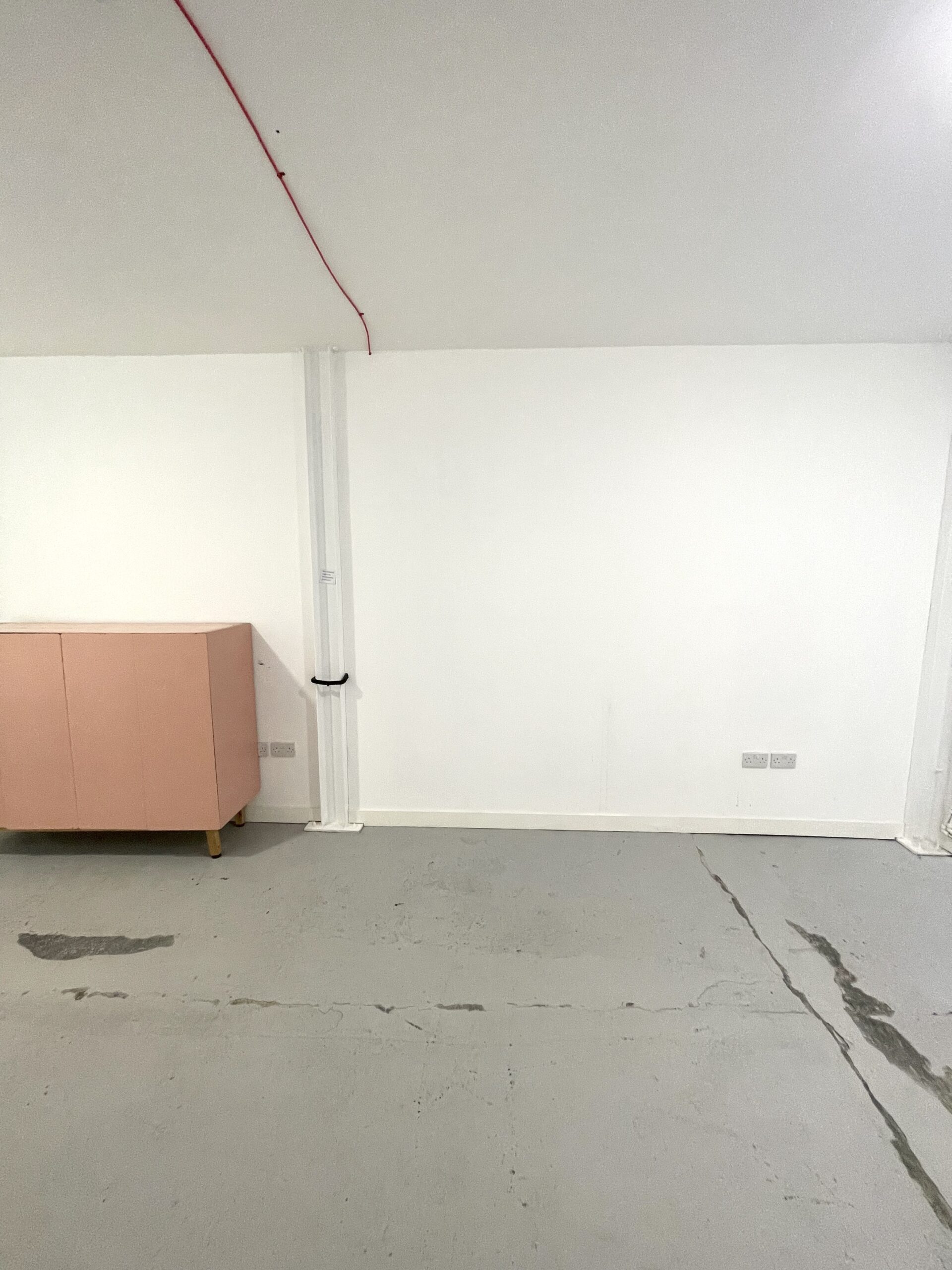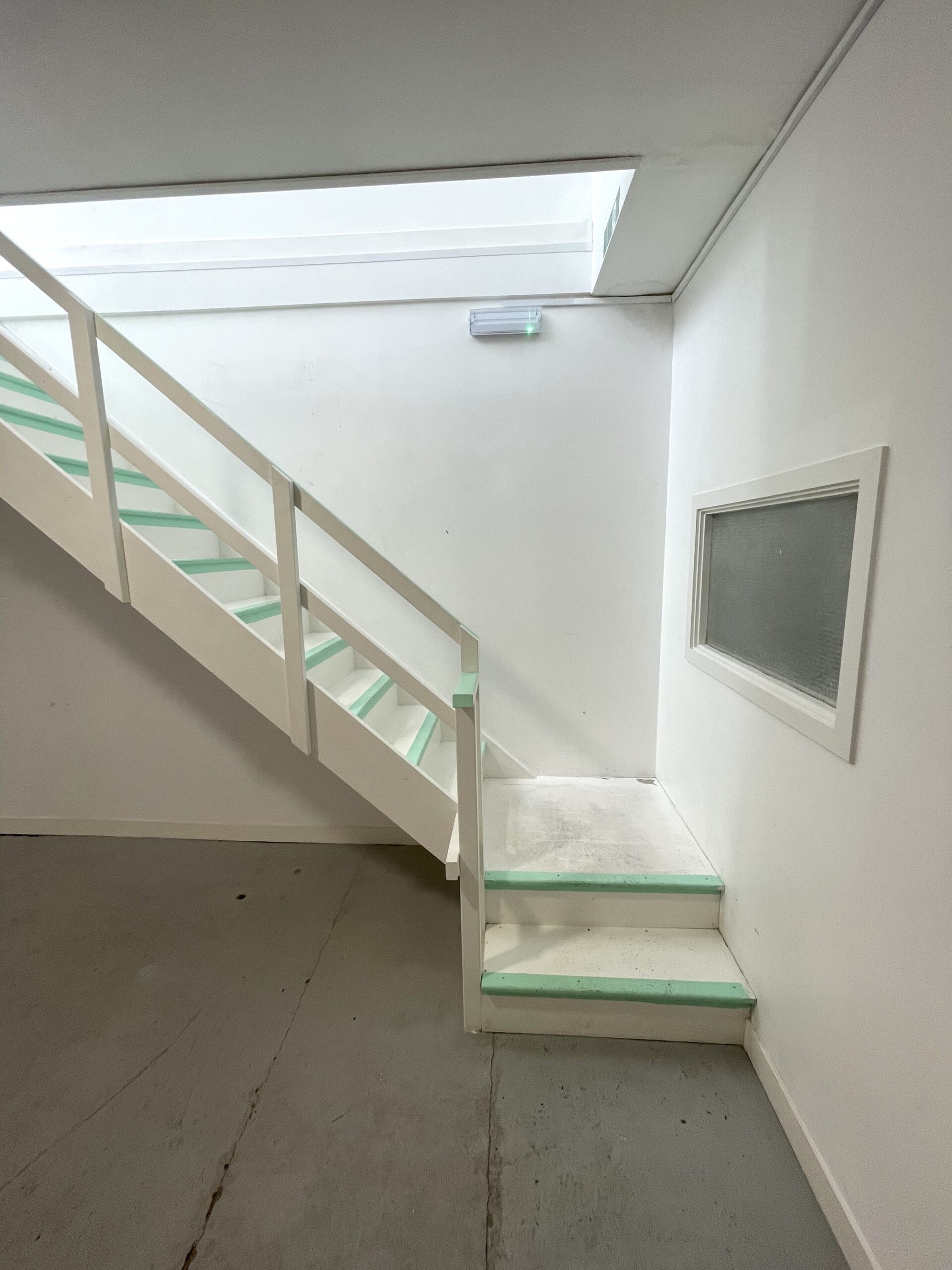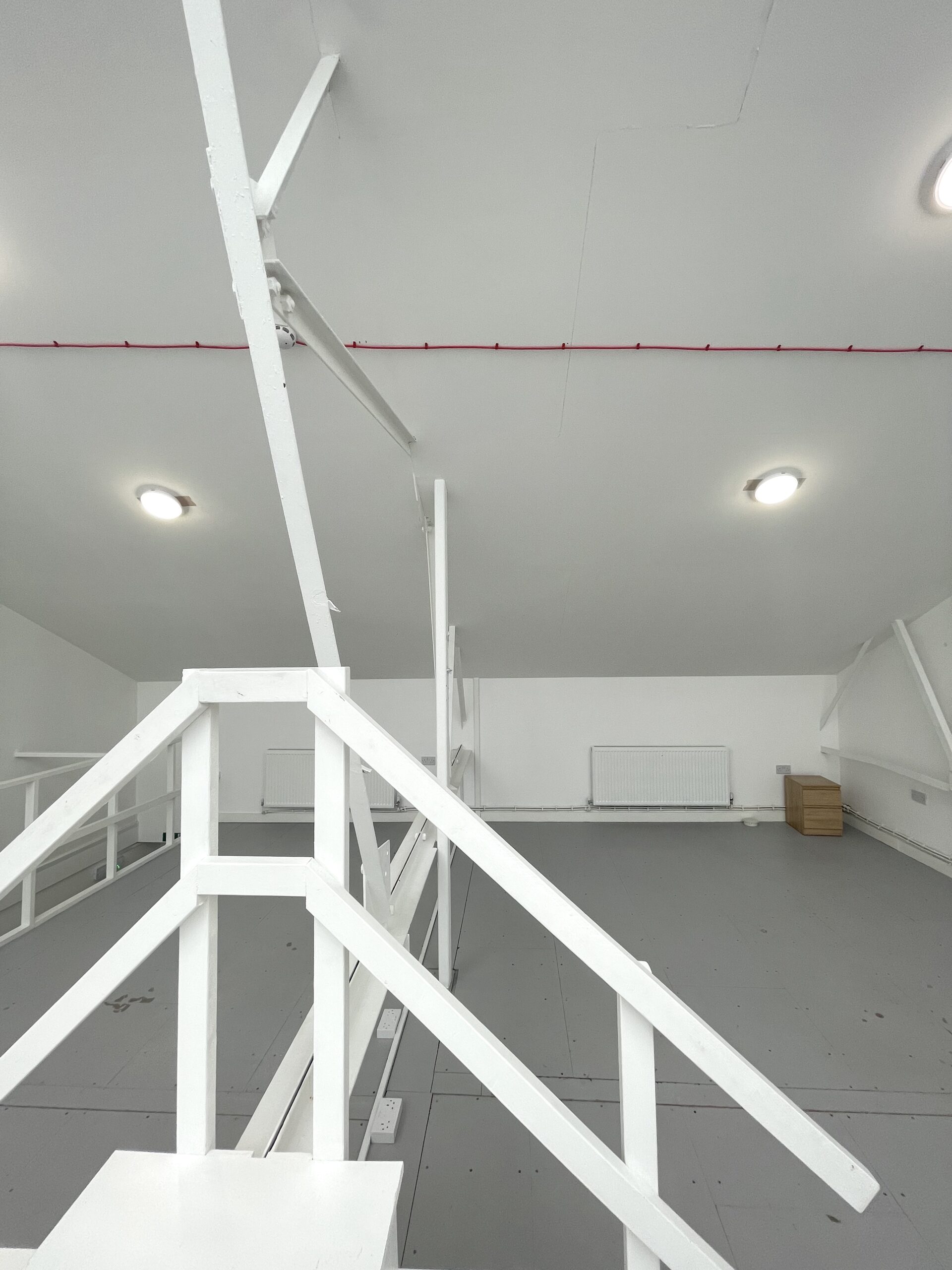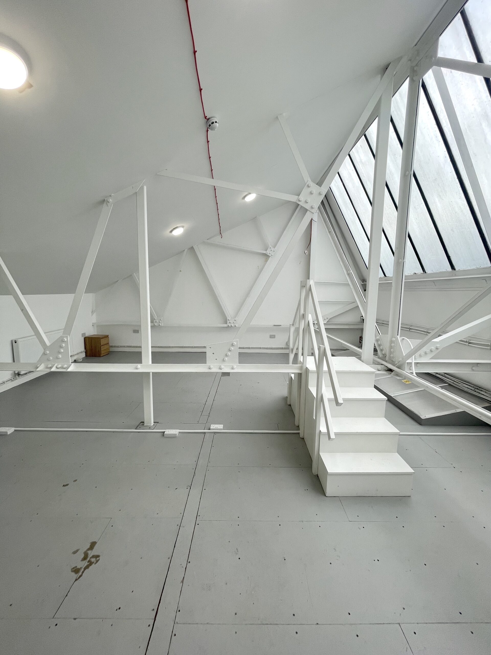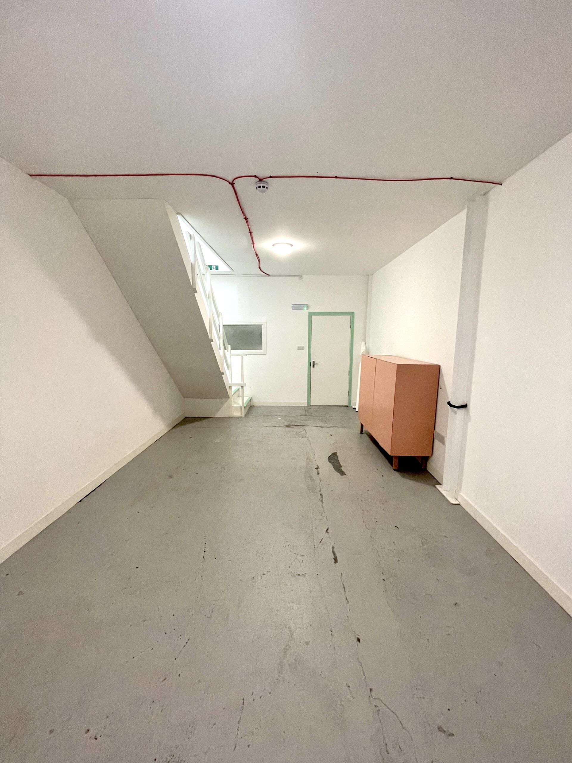 The ground floor is 300 sq ft and has a concrete floor painted flint grey, white walls with a 9ft high roof and a window for natural light.