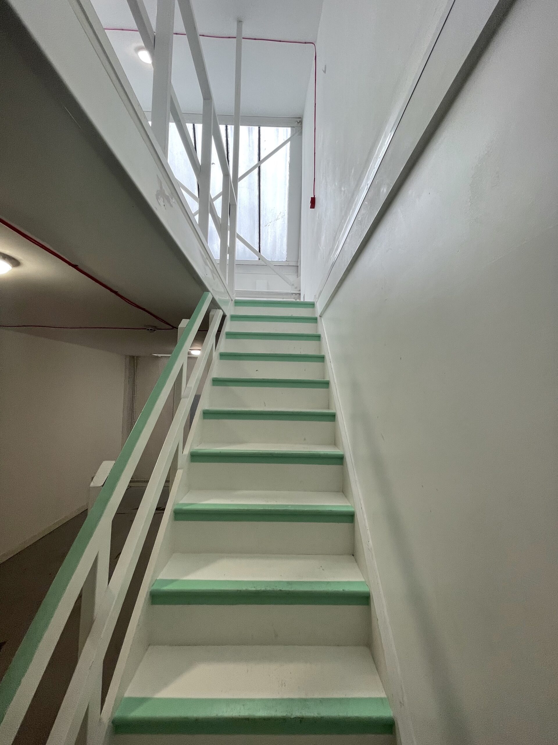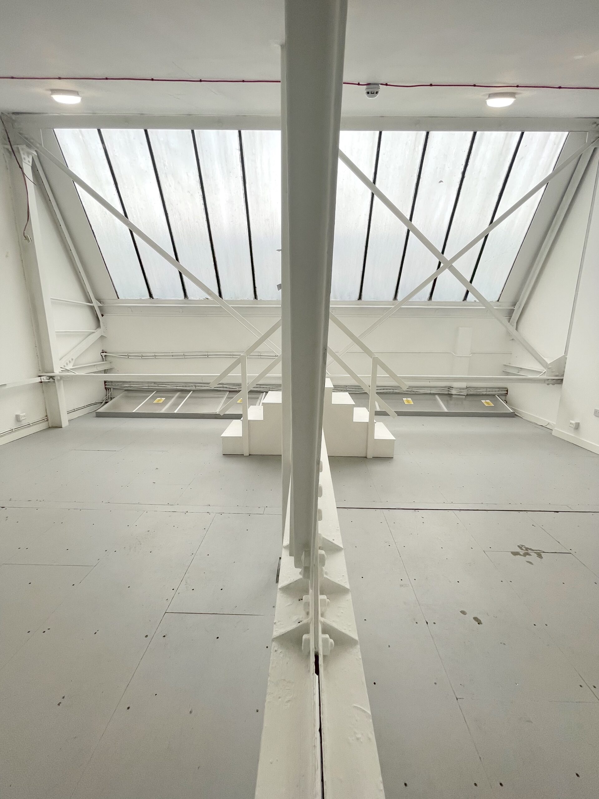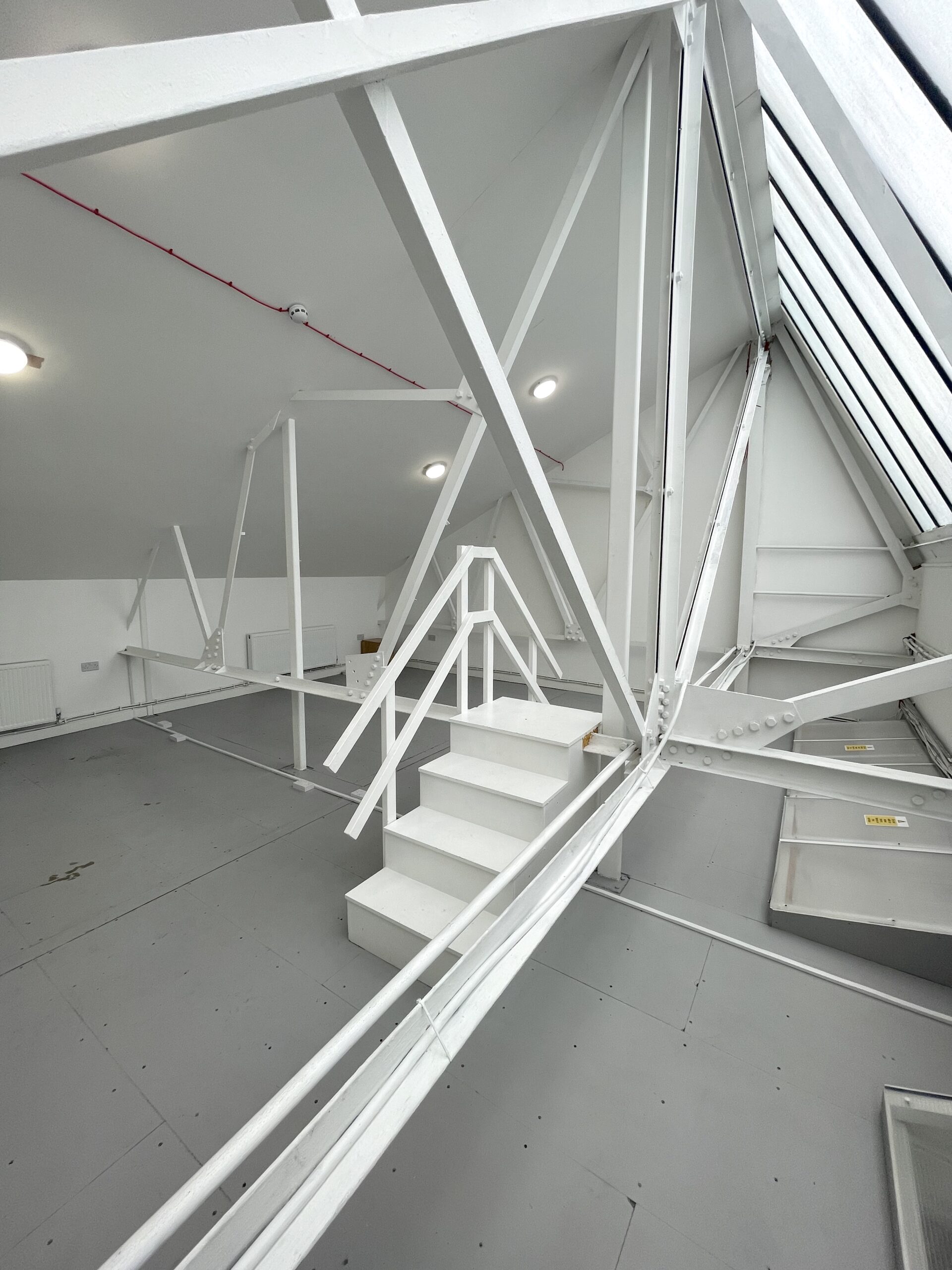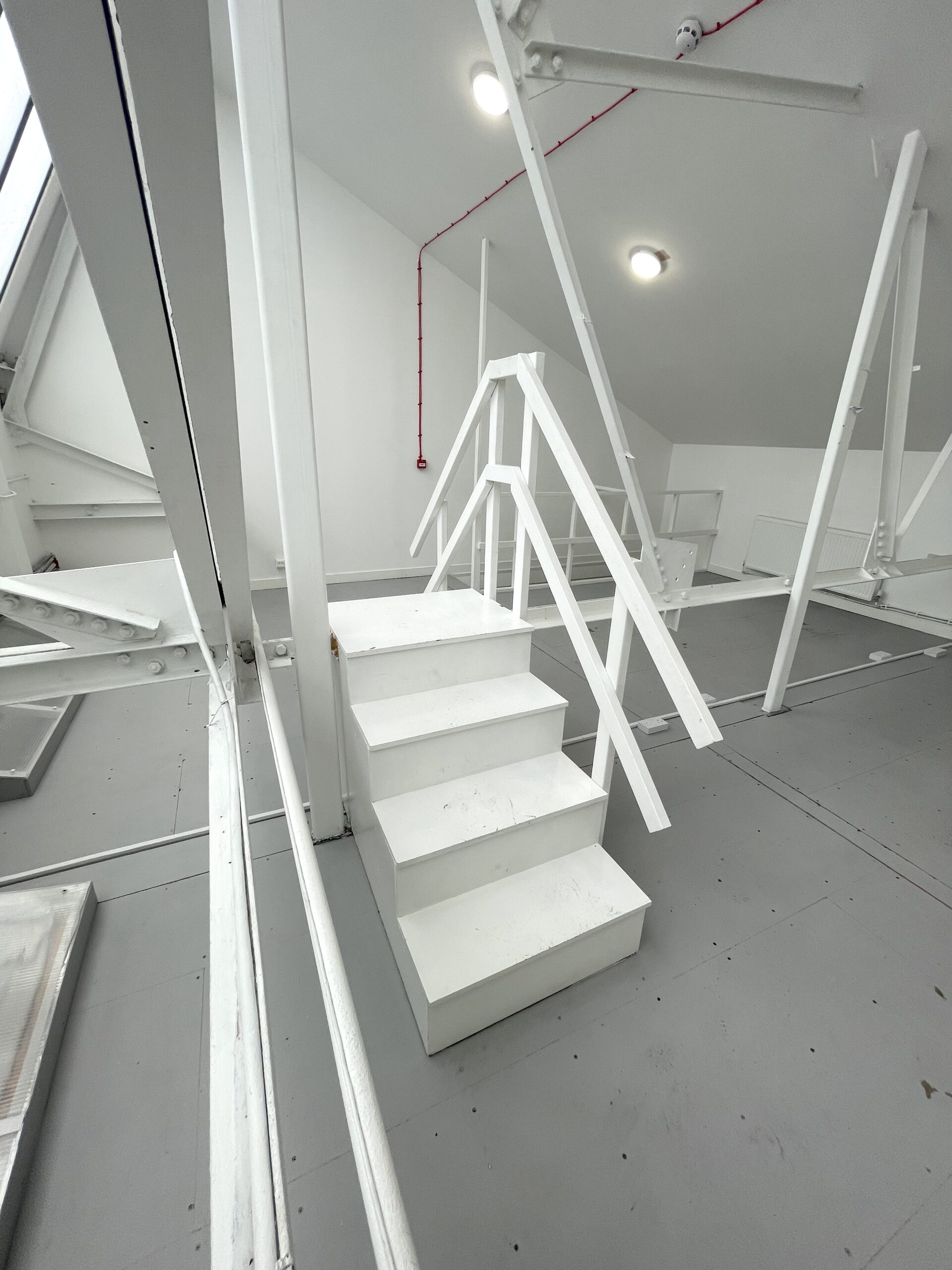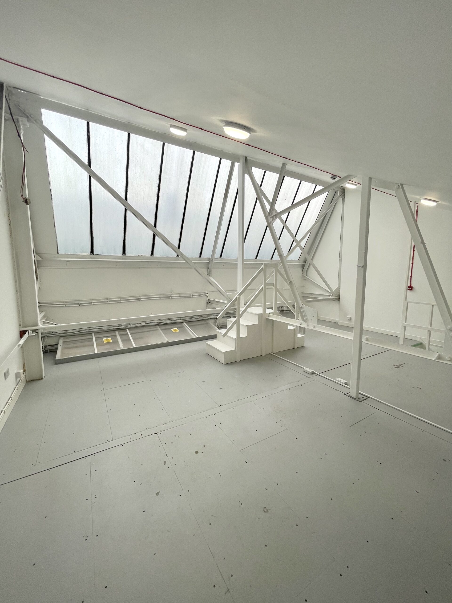 The ground floor is 300 sq ft and has a concrete floor painted flint grey, white walls with a 9ft high roof and a window for natural light.