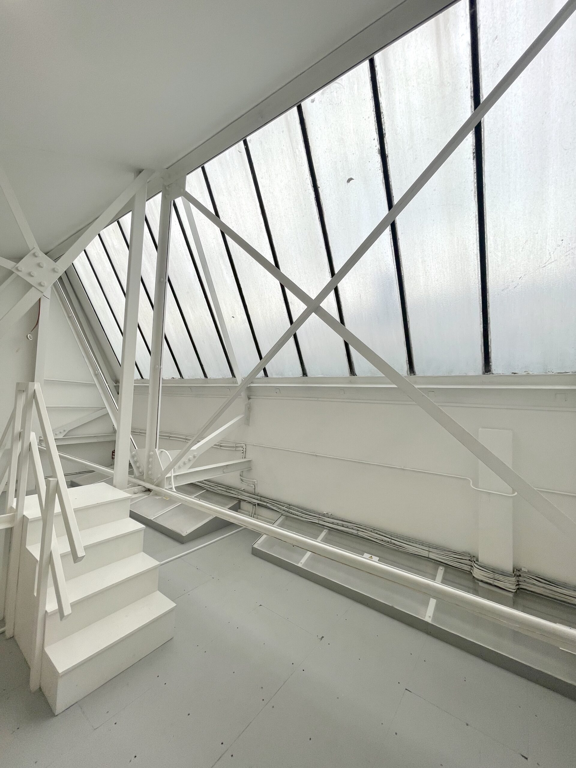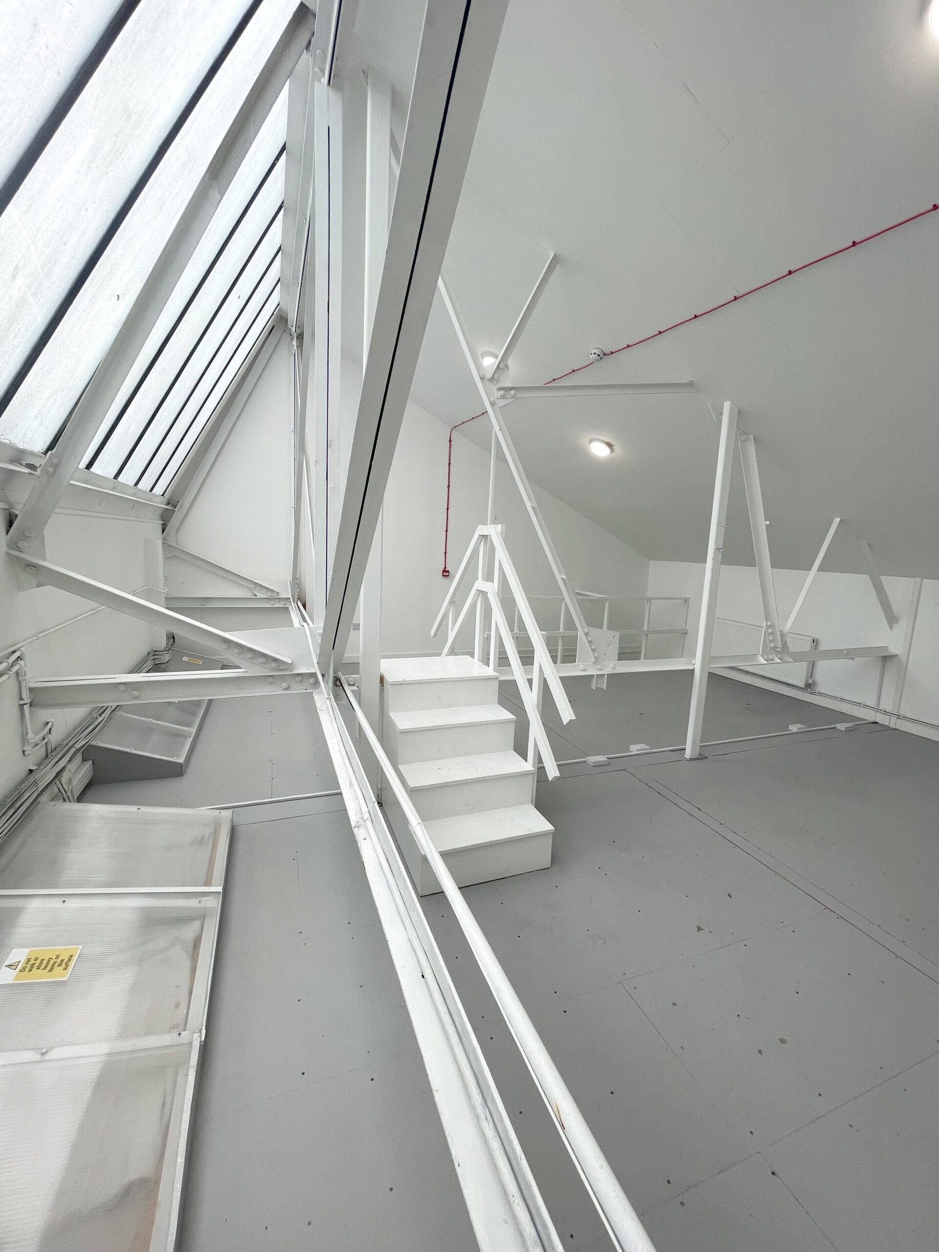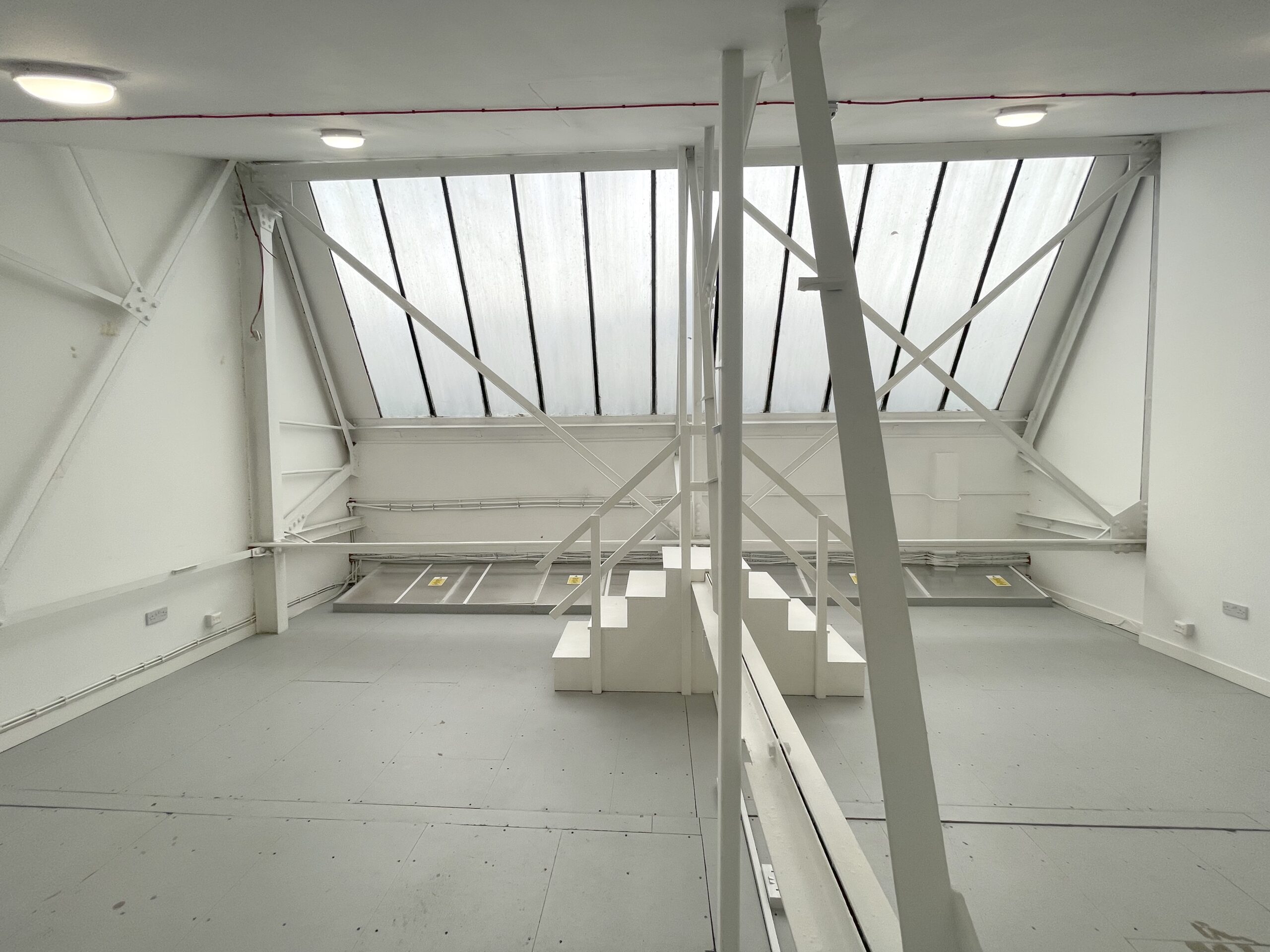The mezzanine floor is 600 sq ft and has bright white painted wall, huge industrial skylight windows throughout for natural light and a roof height of 14 ft.