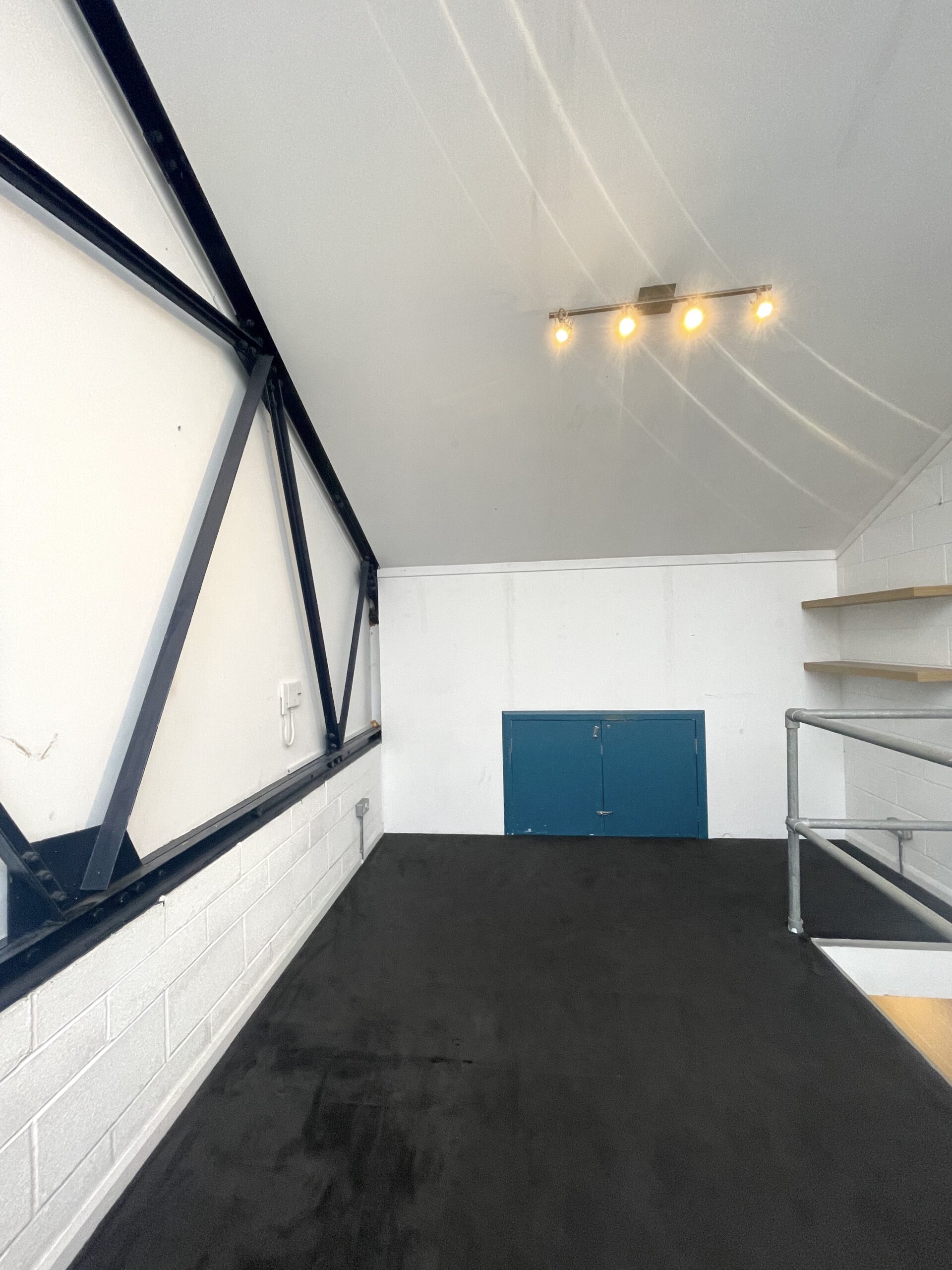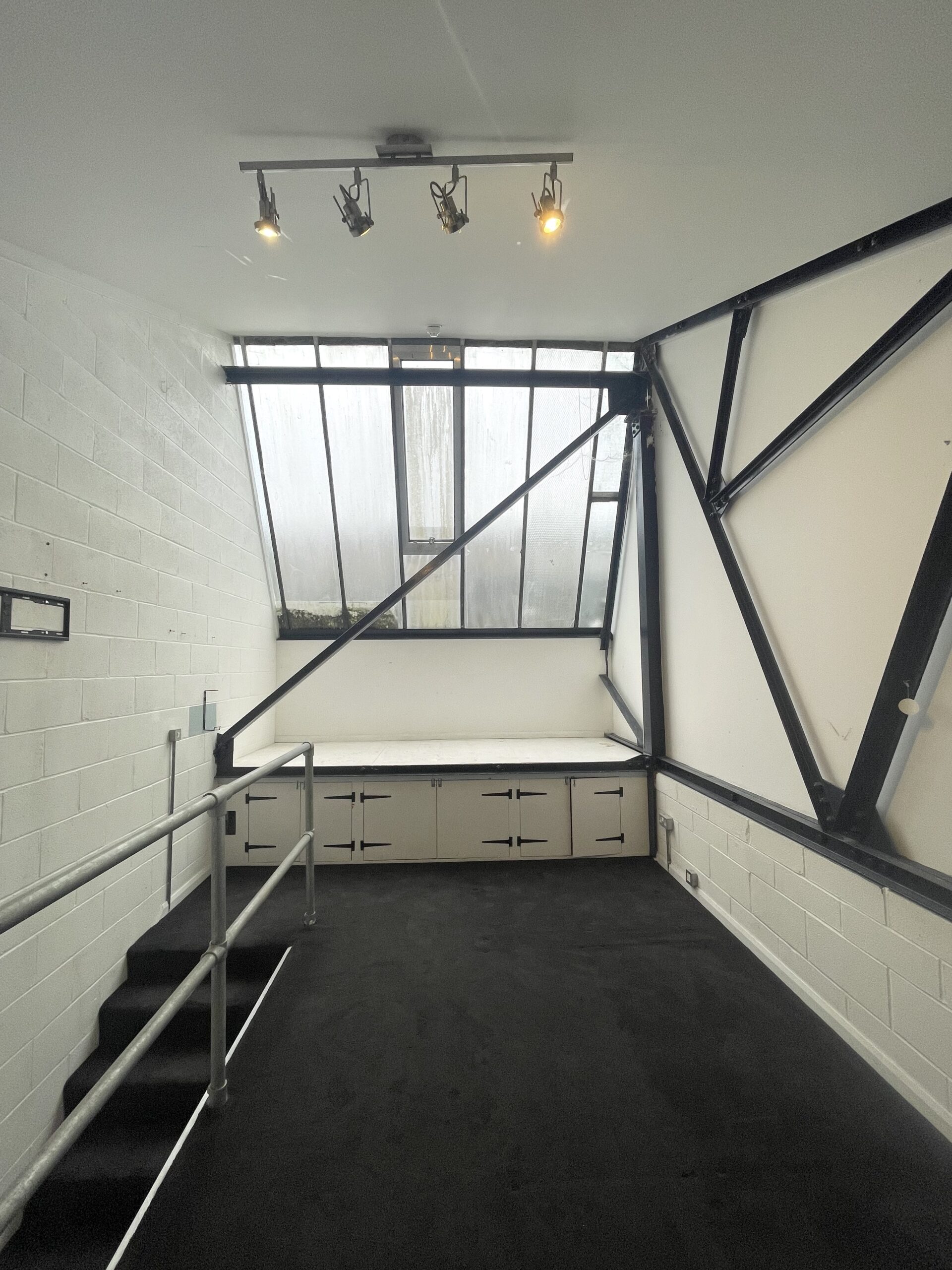 The studio is located on the first floor and is carpeted, with a pitched roof and skylights to let in natural light.