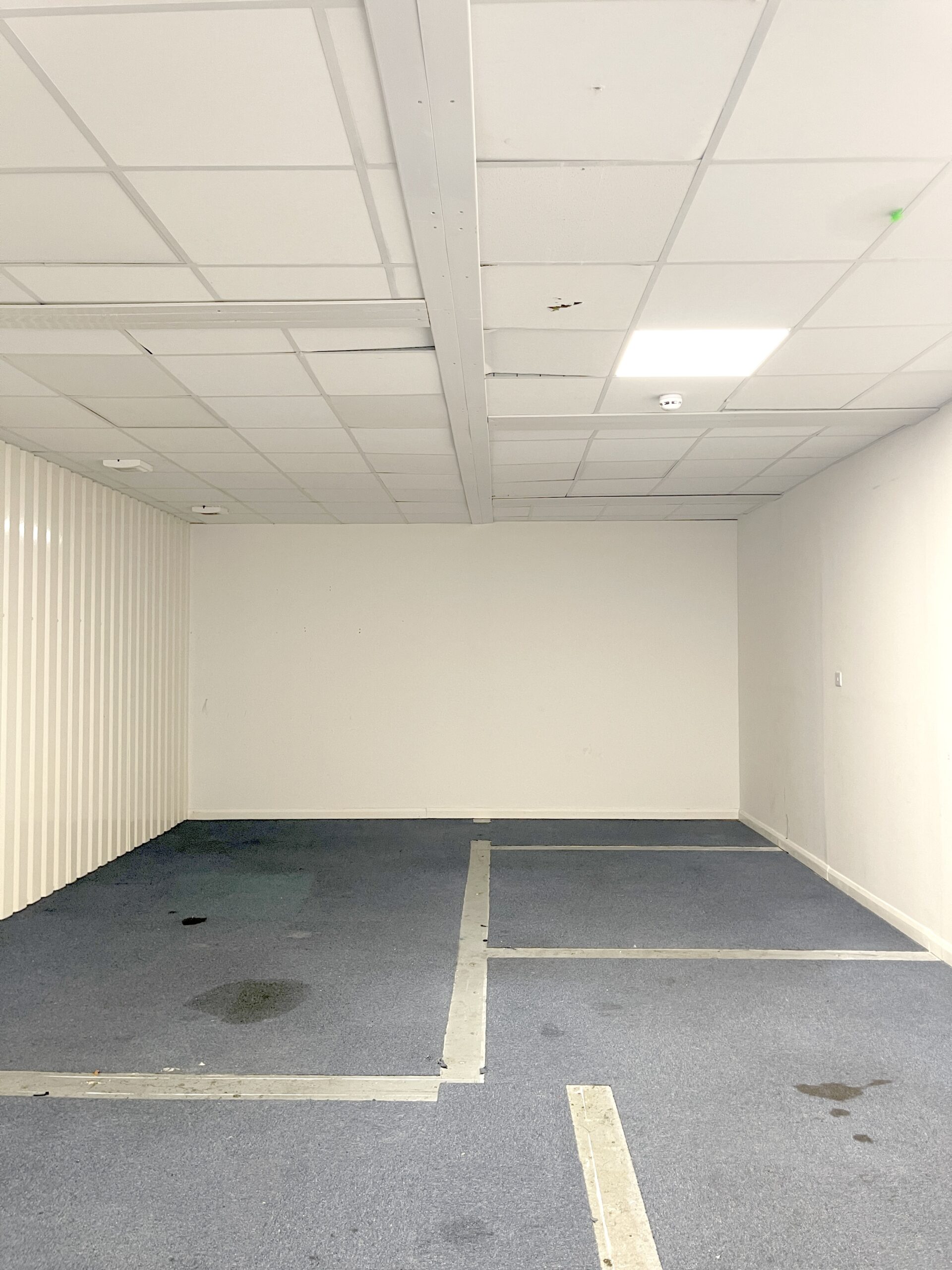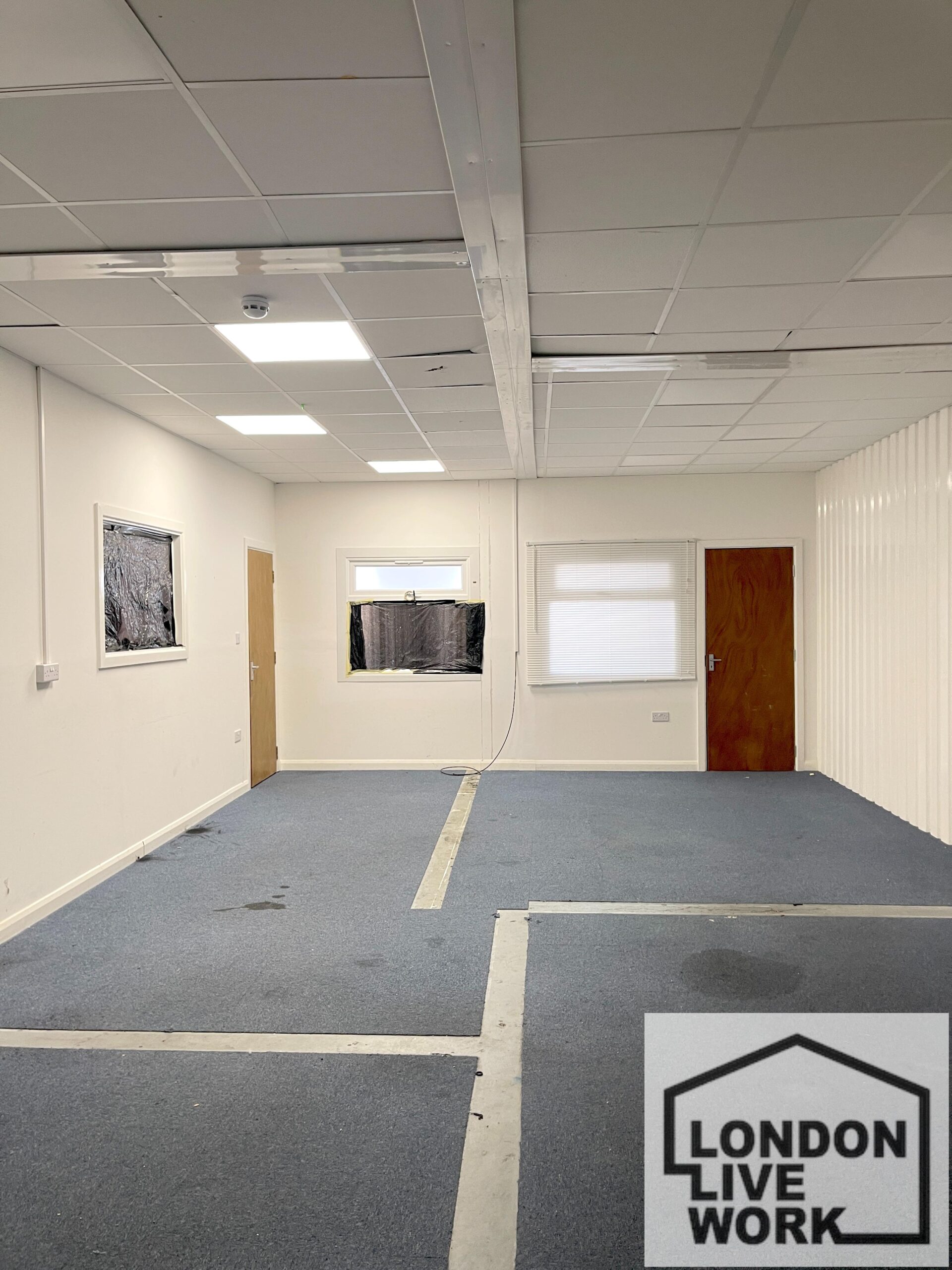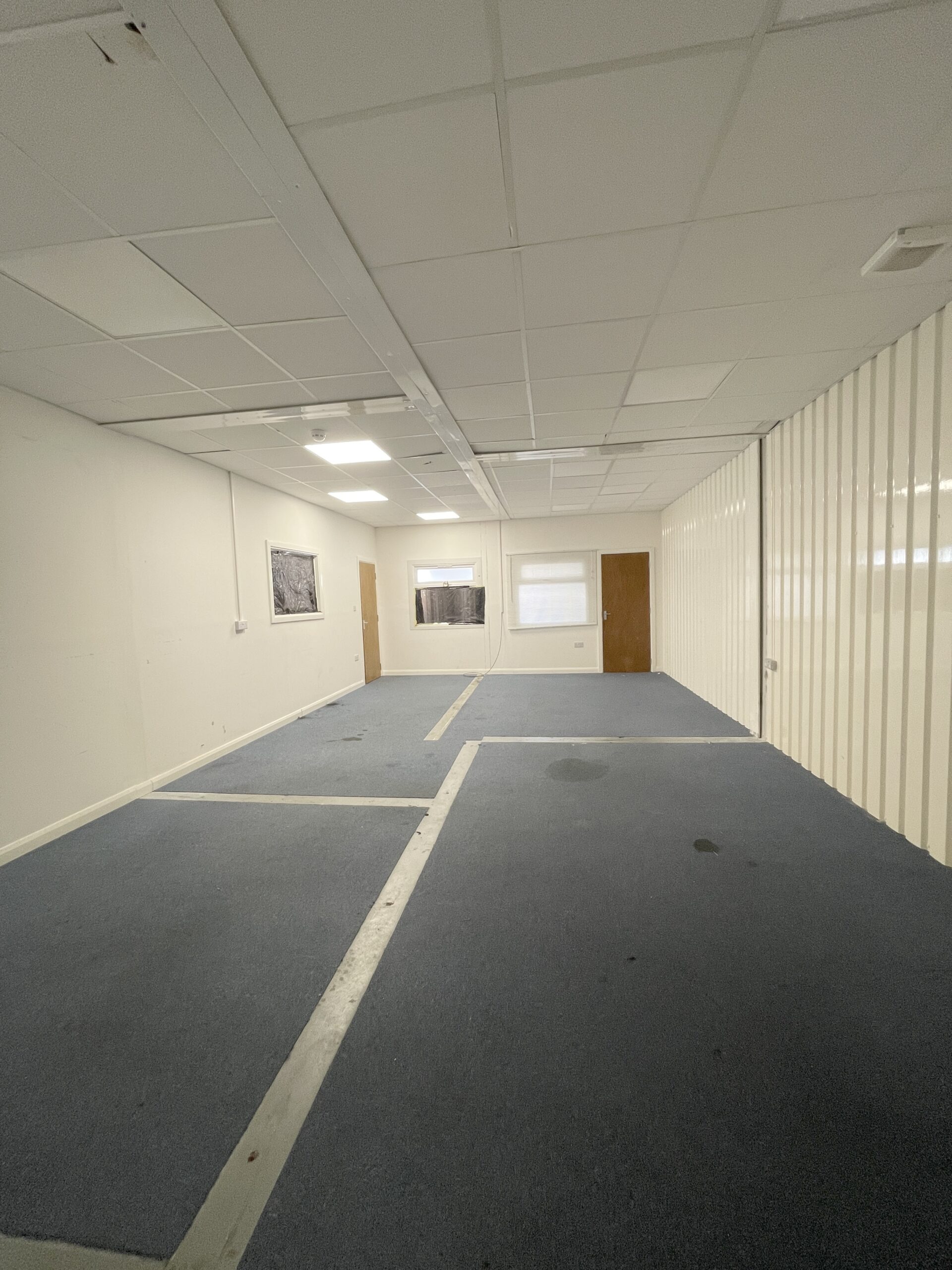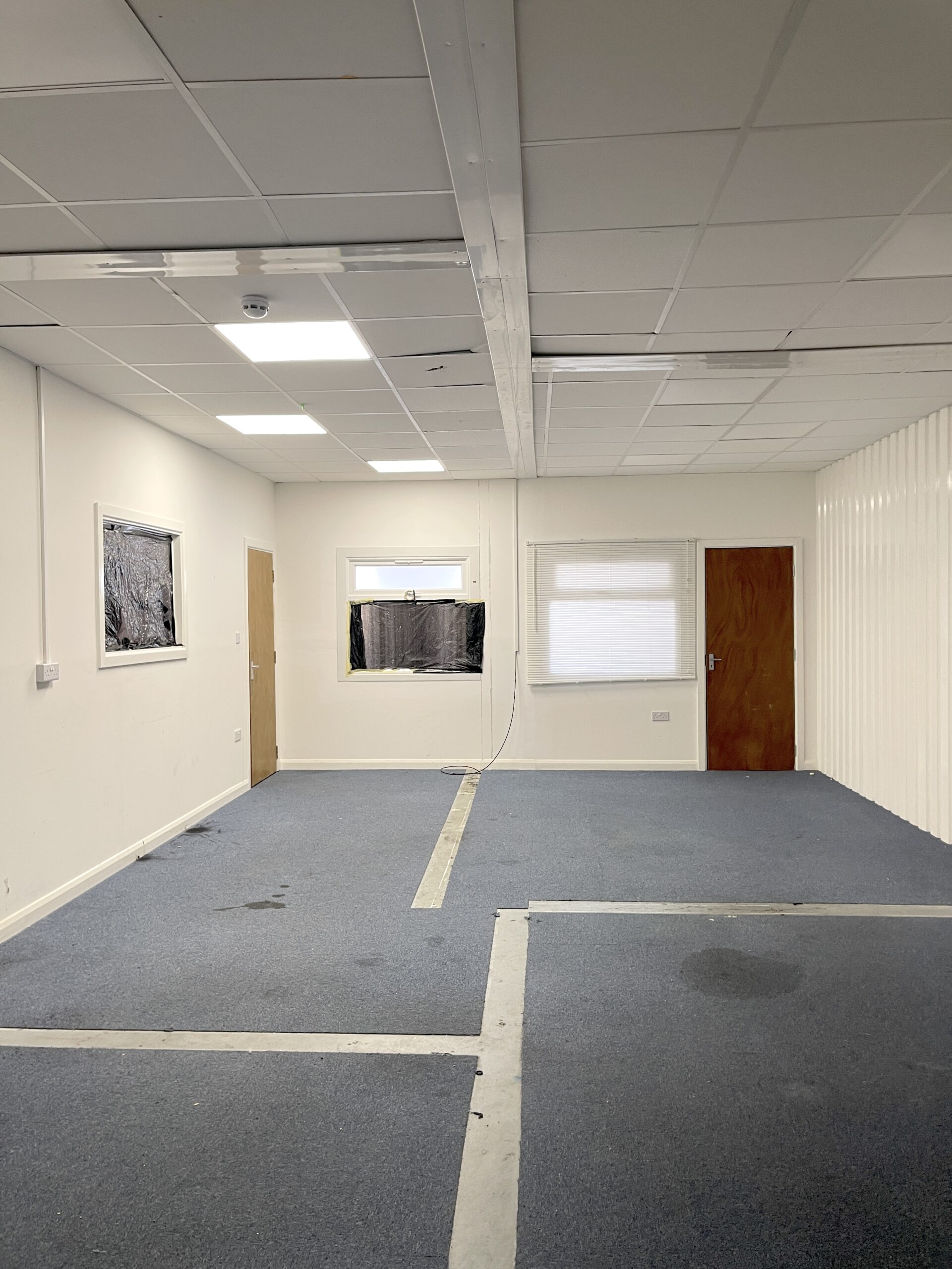 - White walls, blue carpeted flooring, and double-glazed windows for excellent natural light