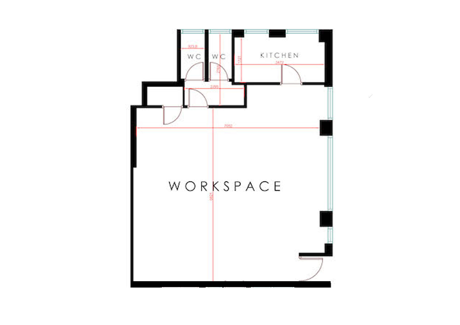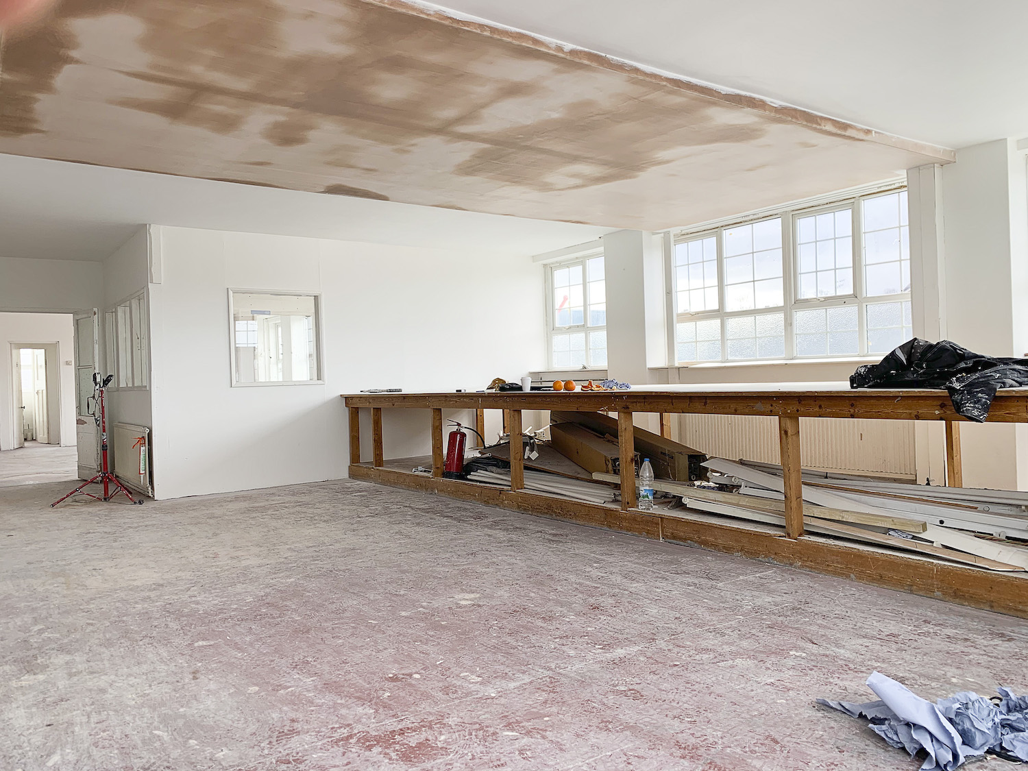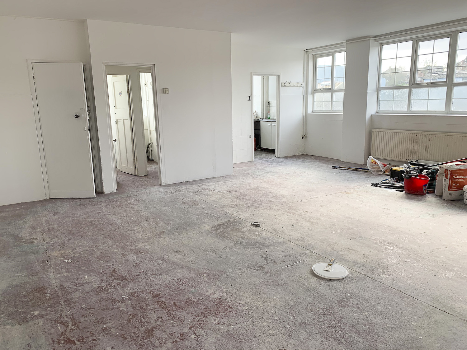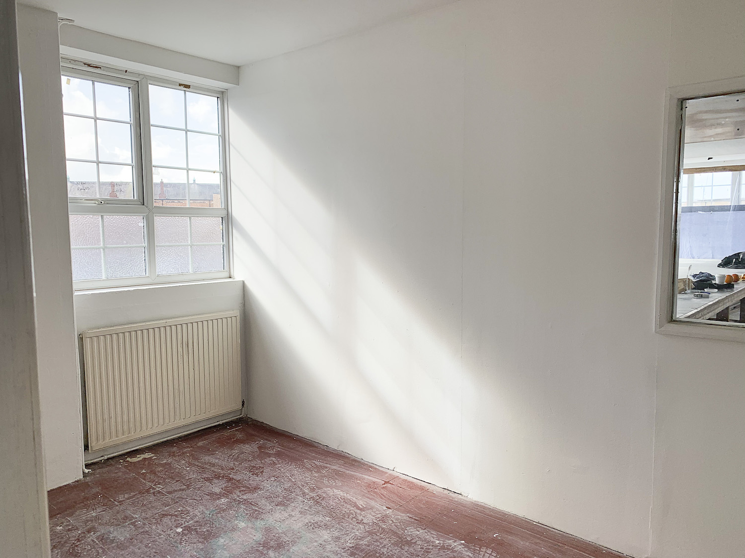 The unit has bright white painted walls, with a red concrete floor, huge paneled windows throughout the space for lots of natural light and a ceiling height of 8ft.