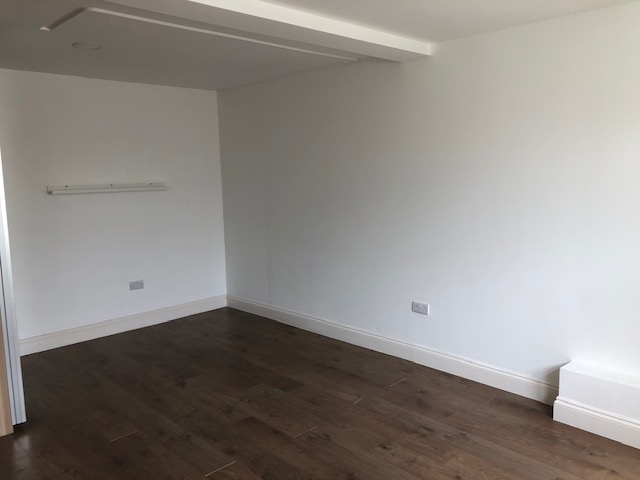 The flat has bright white painted walls, wooden laminate flooring and large double glazed windows throughout.