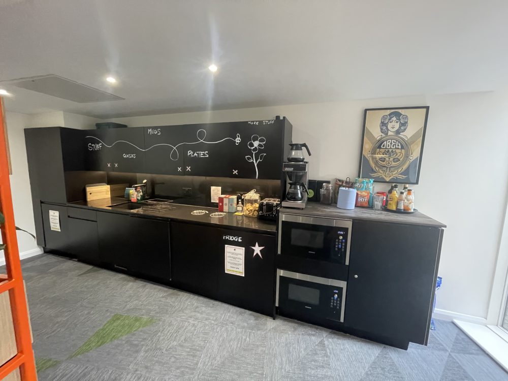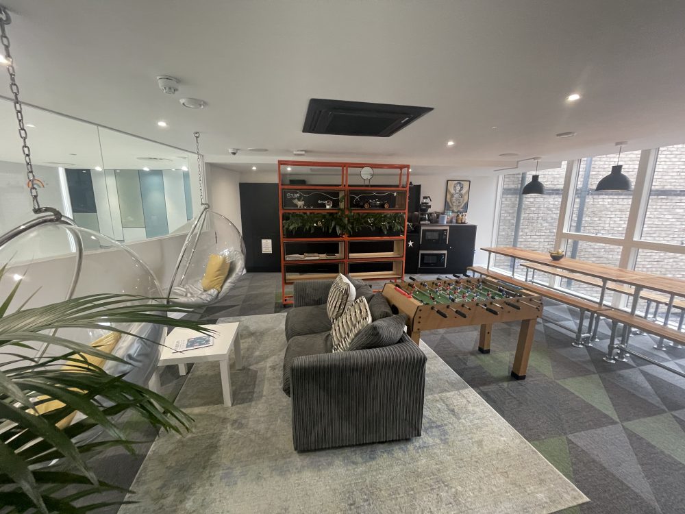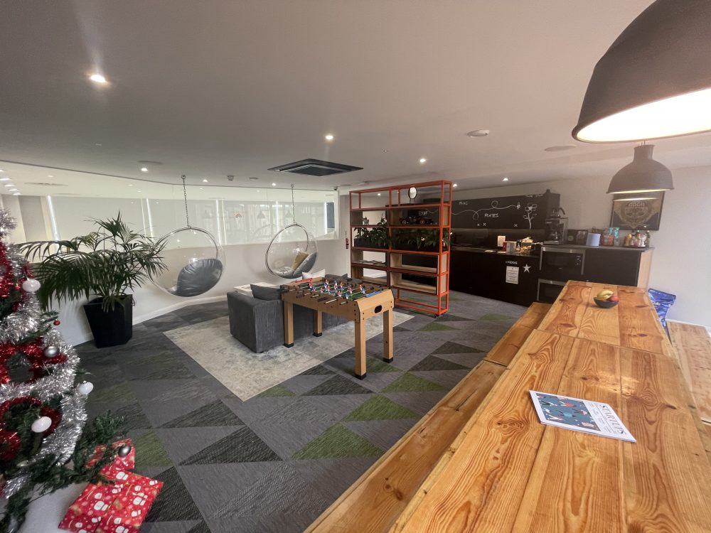The building has a separate communal break room area for lunch so you can take a break from your work and studio. the break room comes with lots of seats and tables and even has a table football table.