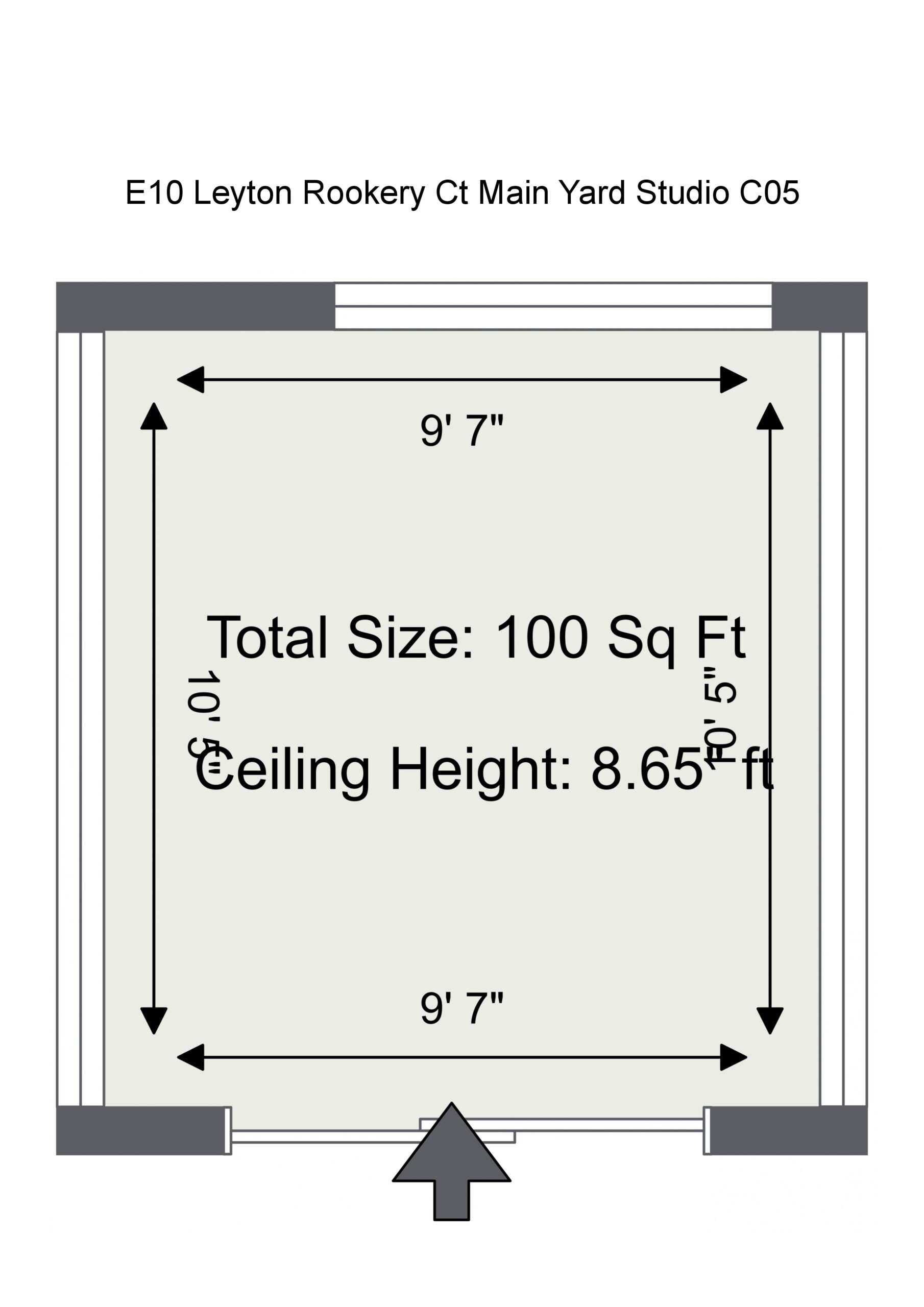 The studio is 100 sq ft in size with a 8.65″ ft high ceiling, there are windows all around the studio for lots of natural light. The front wall is painted white, however the window beams around the studio are black. The space has grey carpet flooring and an air conditioning unit.