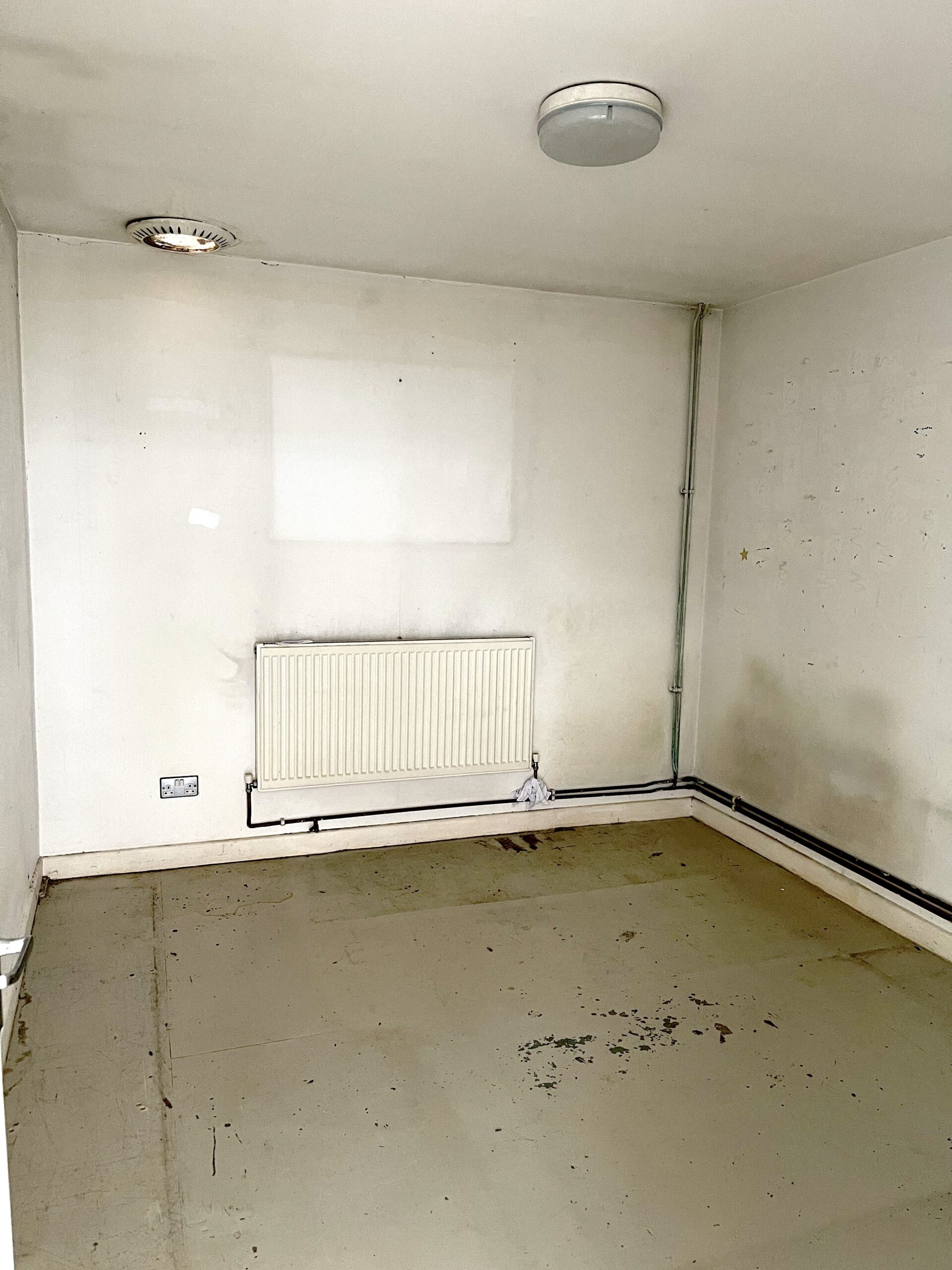 The unit is on the second floor of a converted warehouse, and consists of a large open area, with a concrete floor (painted flint grey), and a very high roof. The walls have all been painted white.