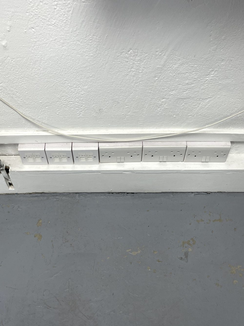 The studio has bright white painted walls, flint grey concrete flooring, multiple windows for natural light.