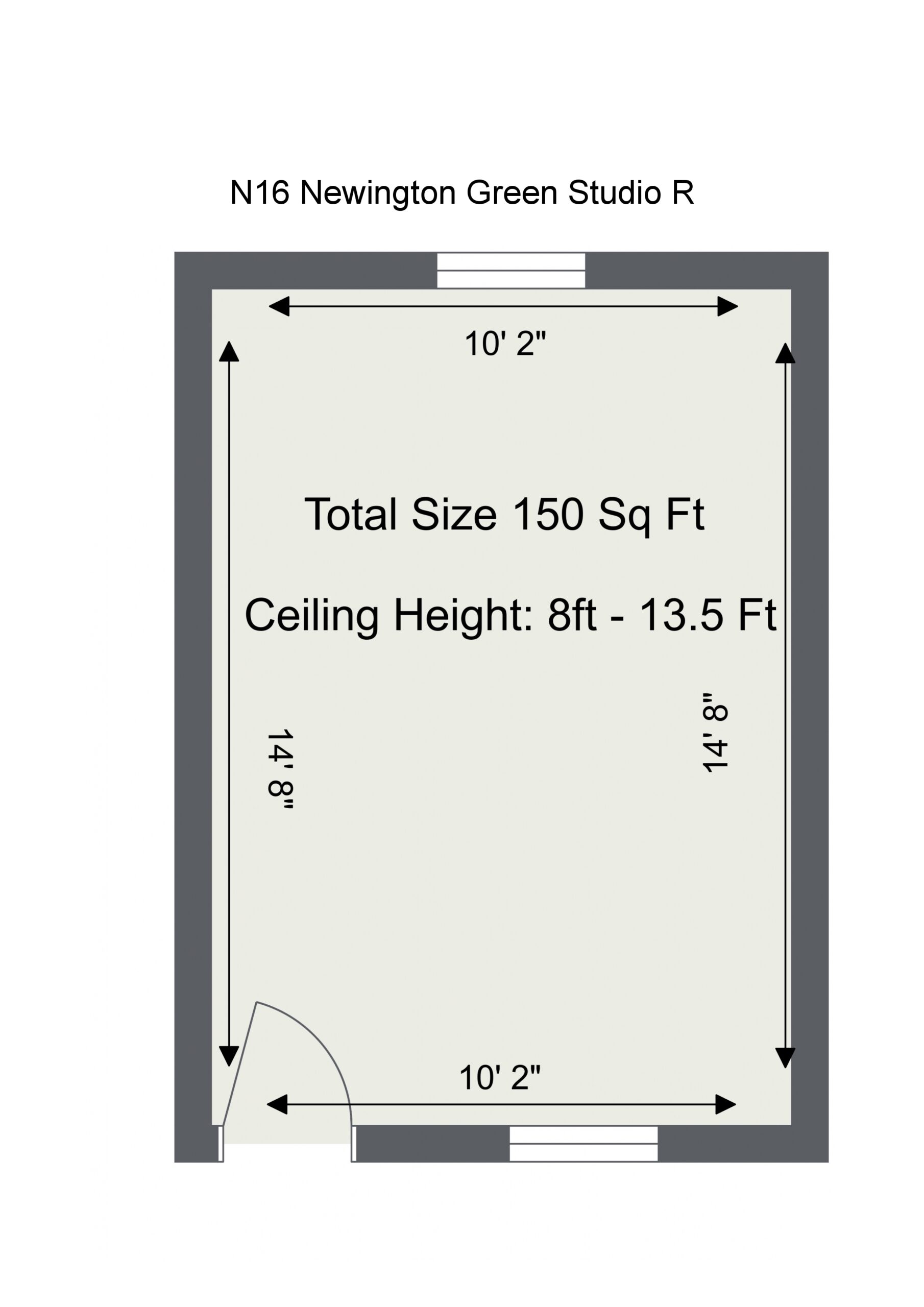 The studio is 150 sq ft in total and has a slanted ceiling height of 8 ft to 13.4 ft at it’s apex.