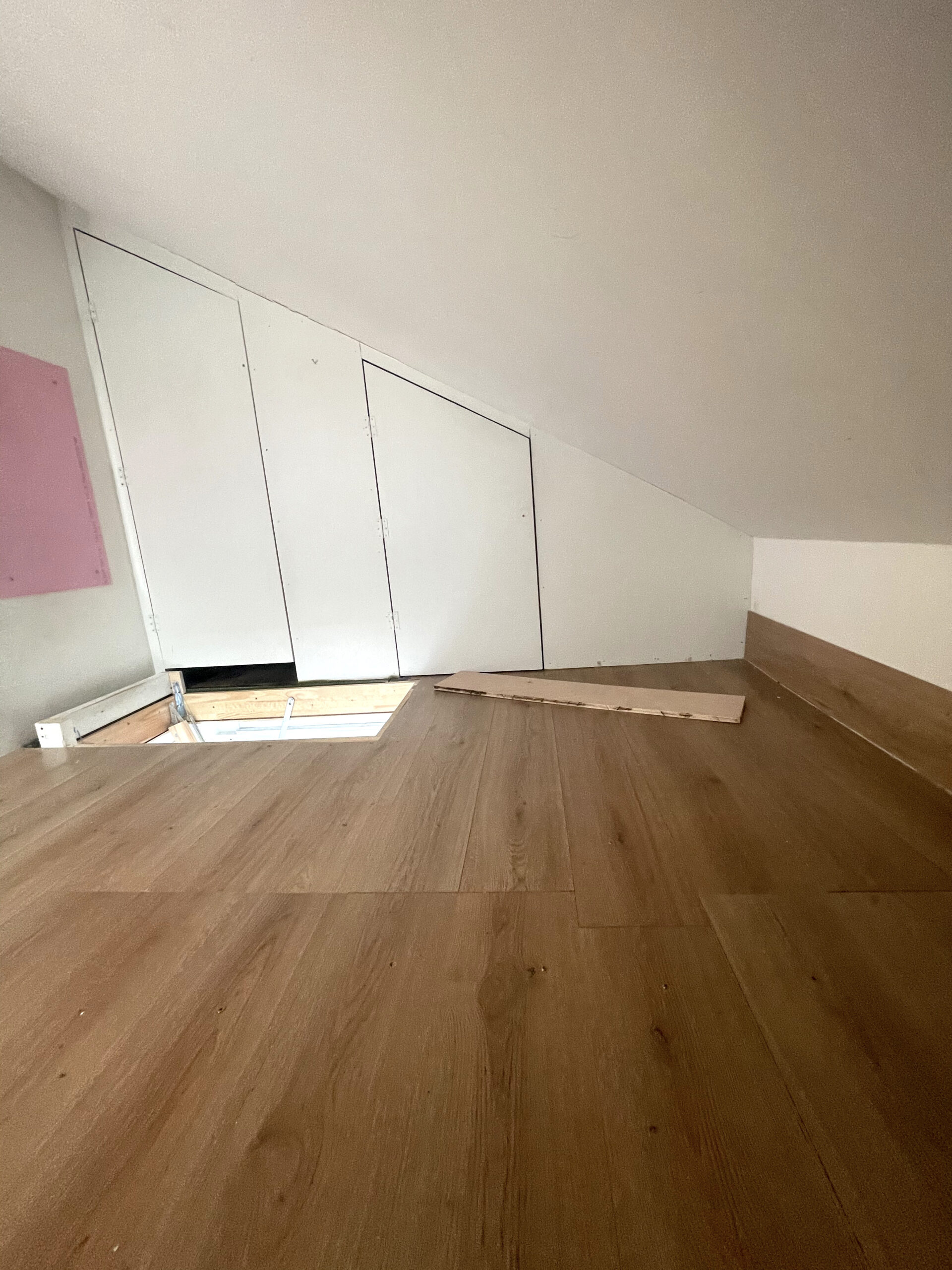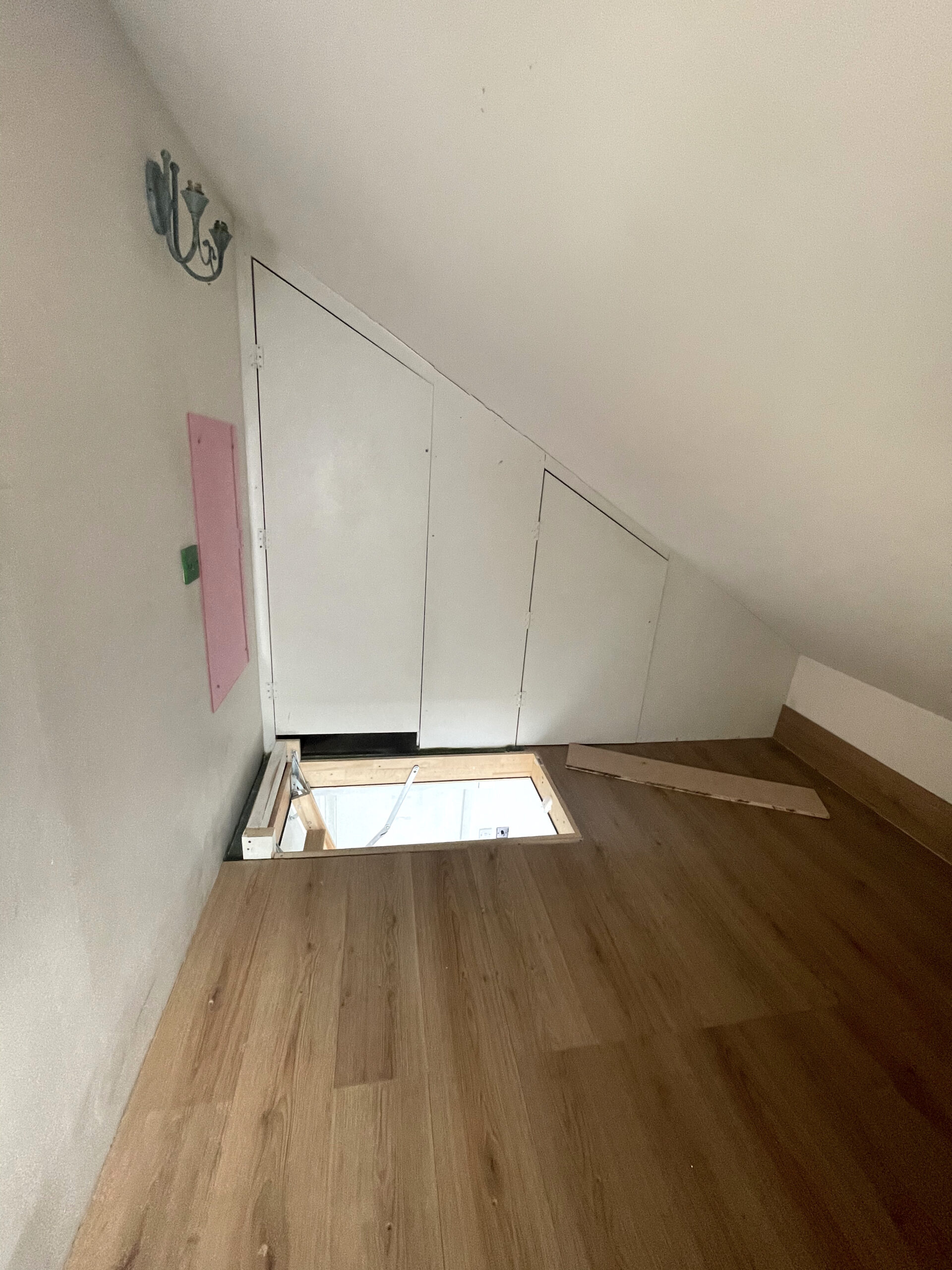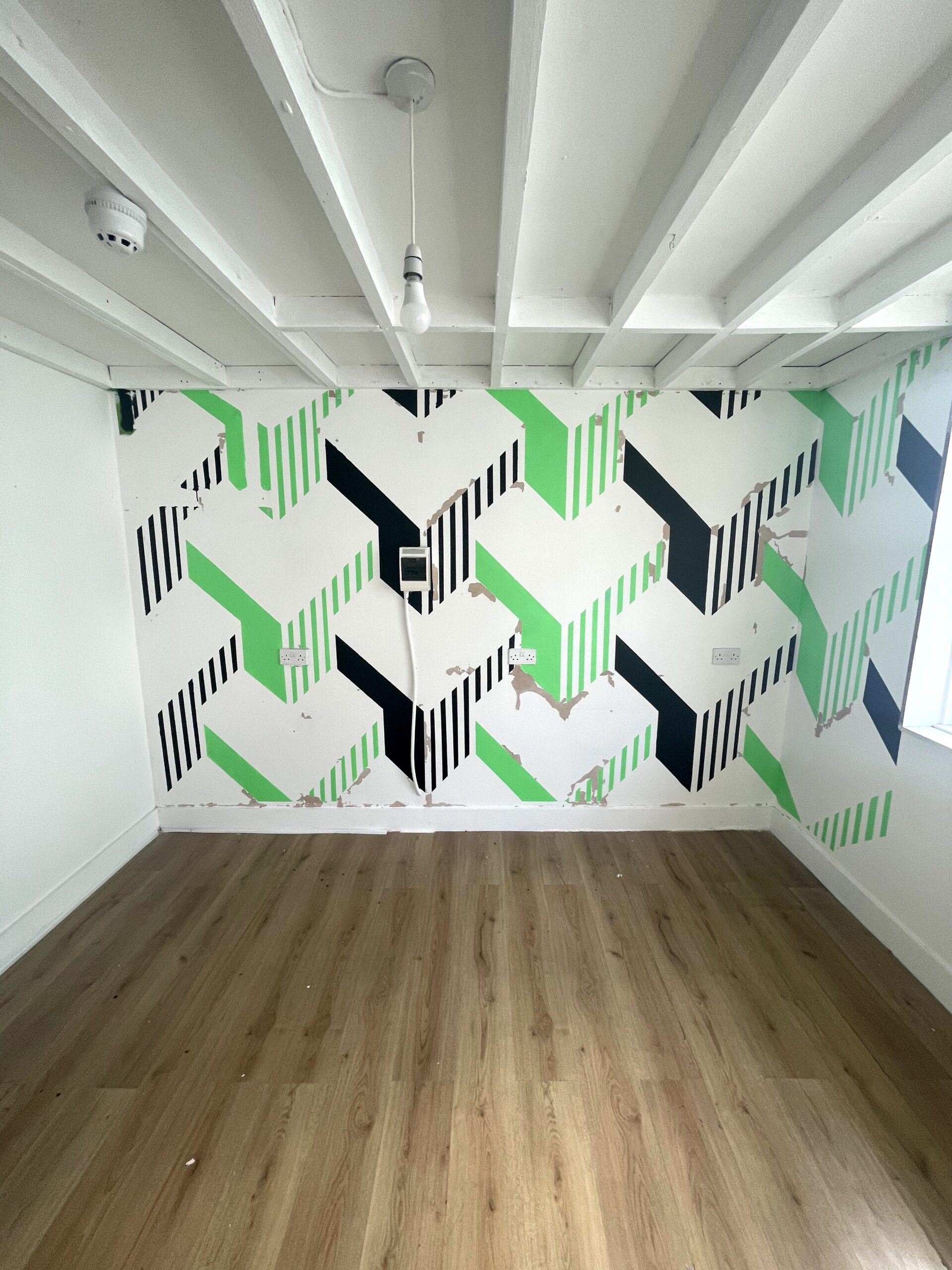 Studio has a wooden laminate flooring, bright green / white walls and huge openable windows for natural light and ventilation.