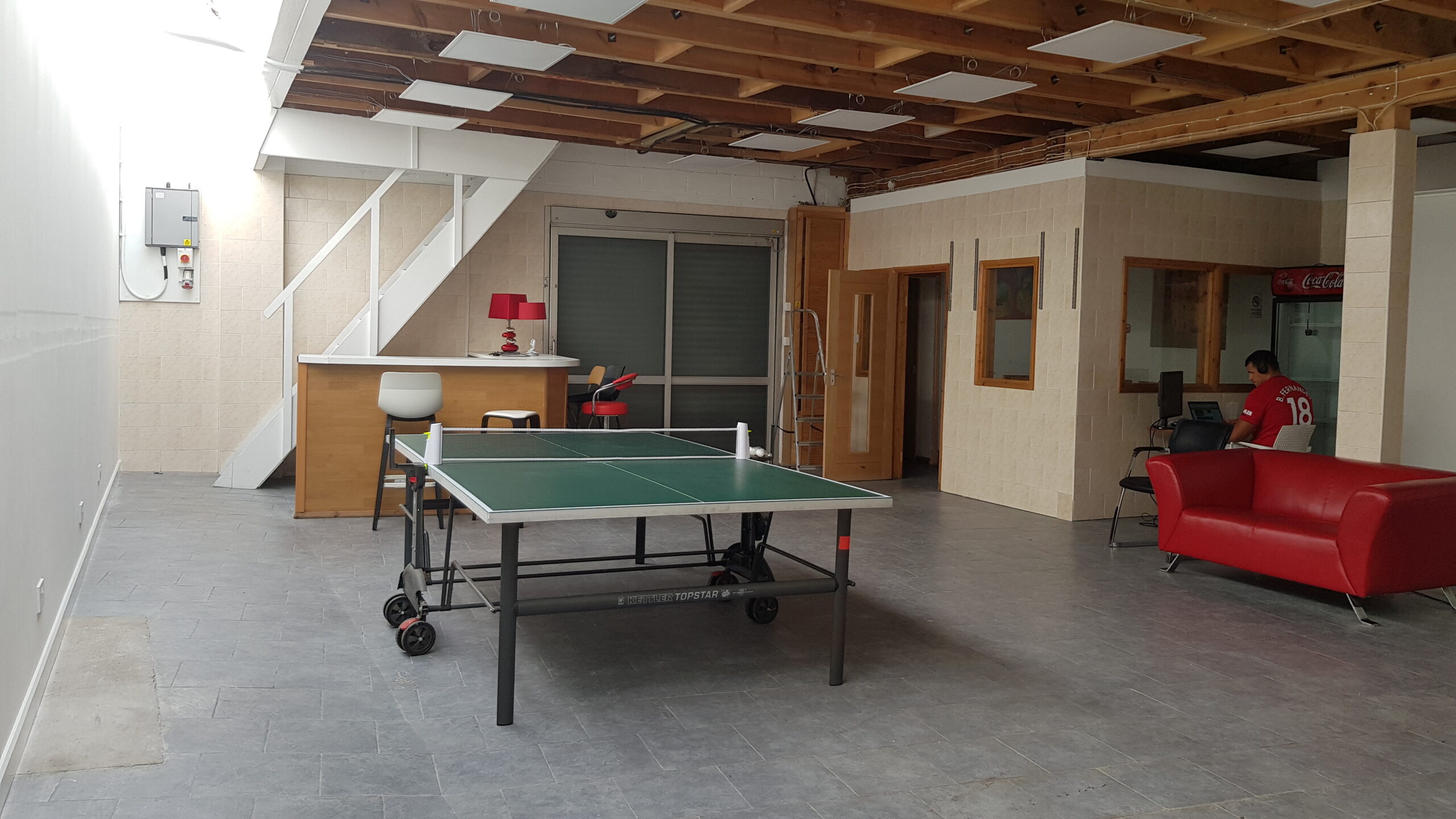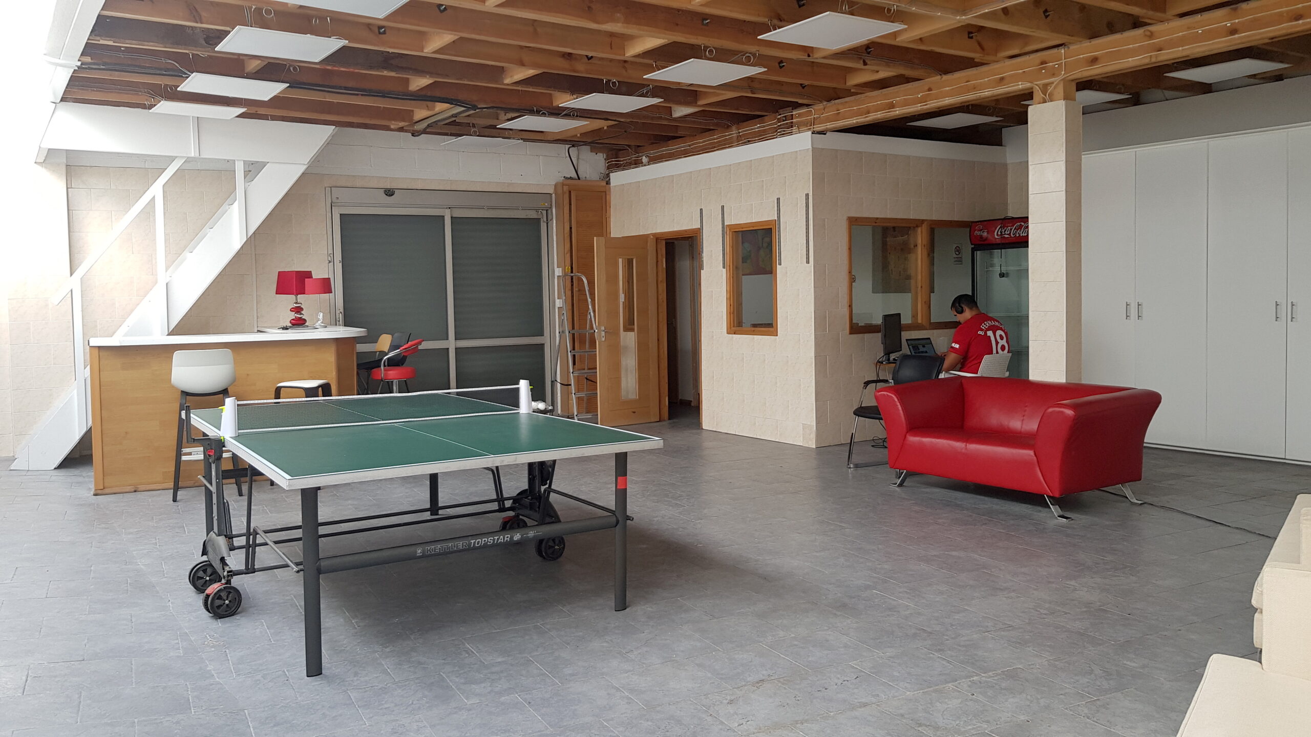 A huge open area / workspace (with tiled floor), high roof and skylights letting in lots of natural light