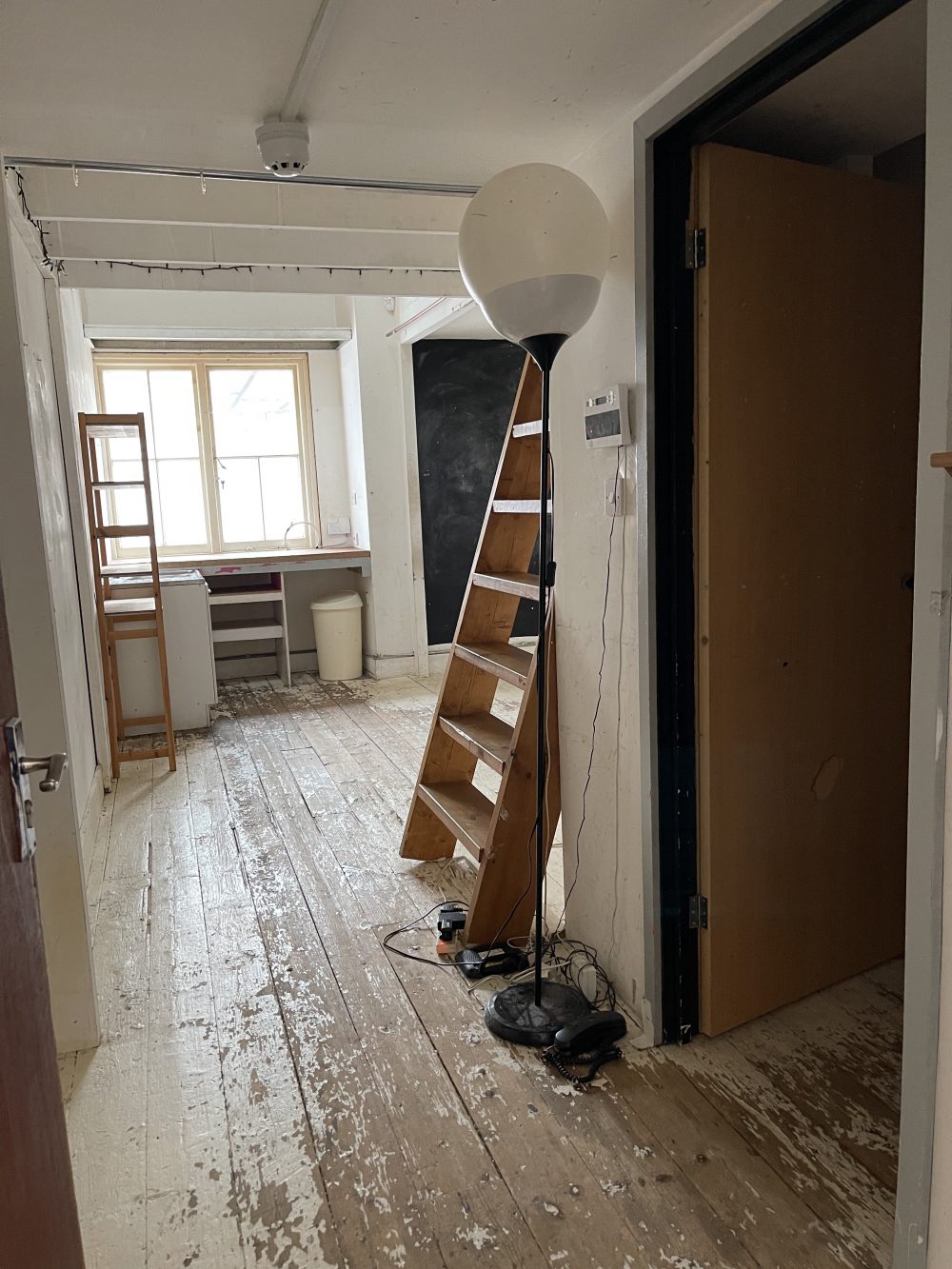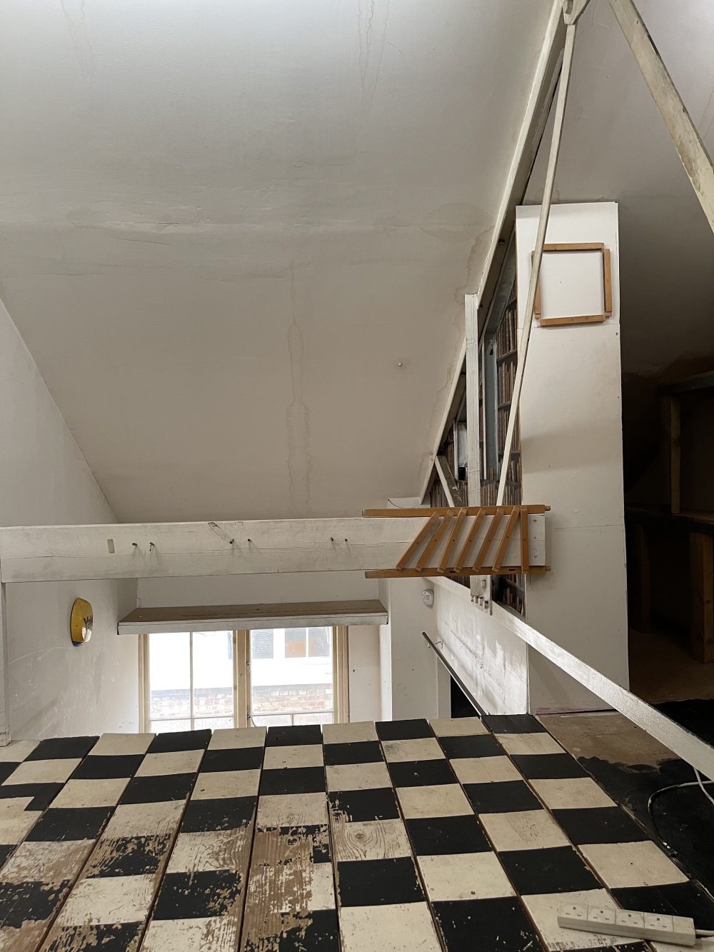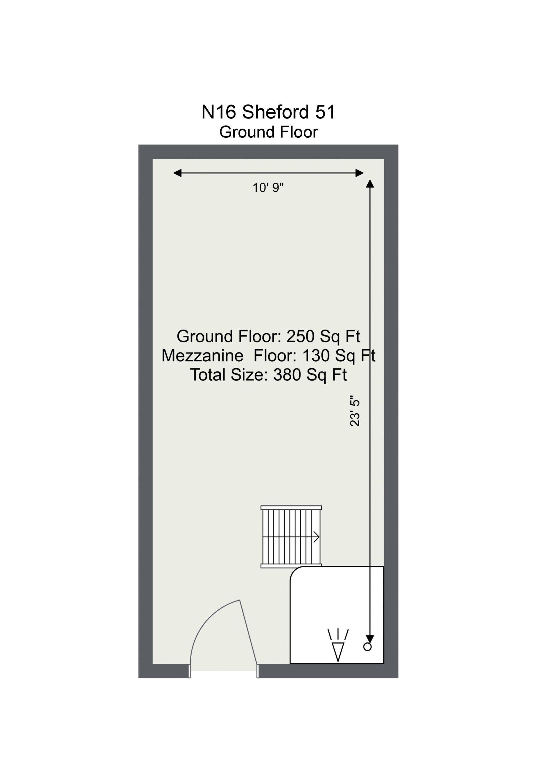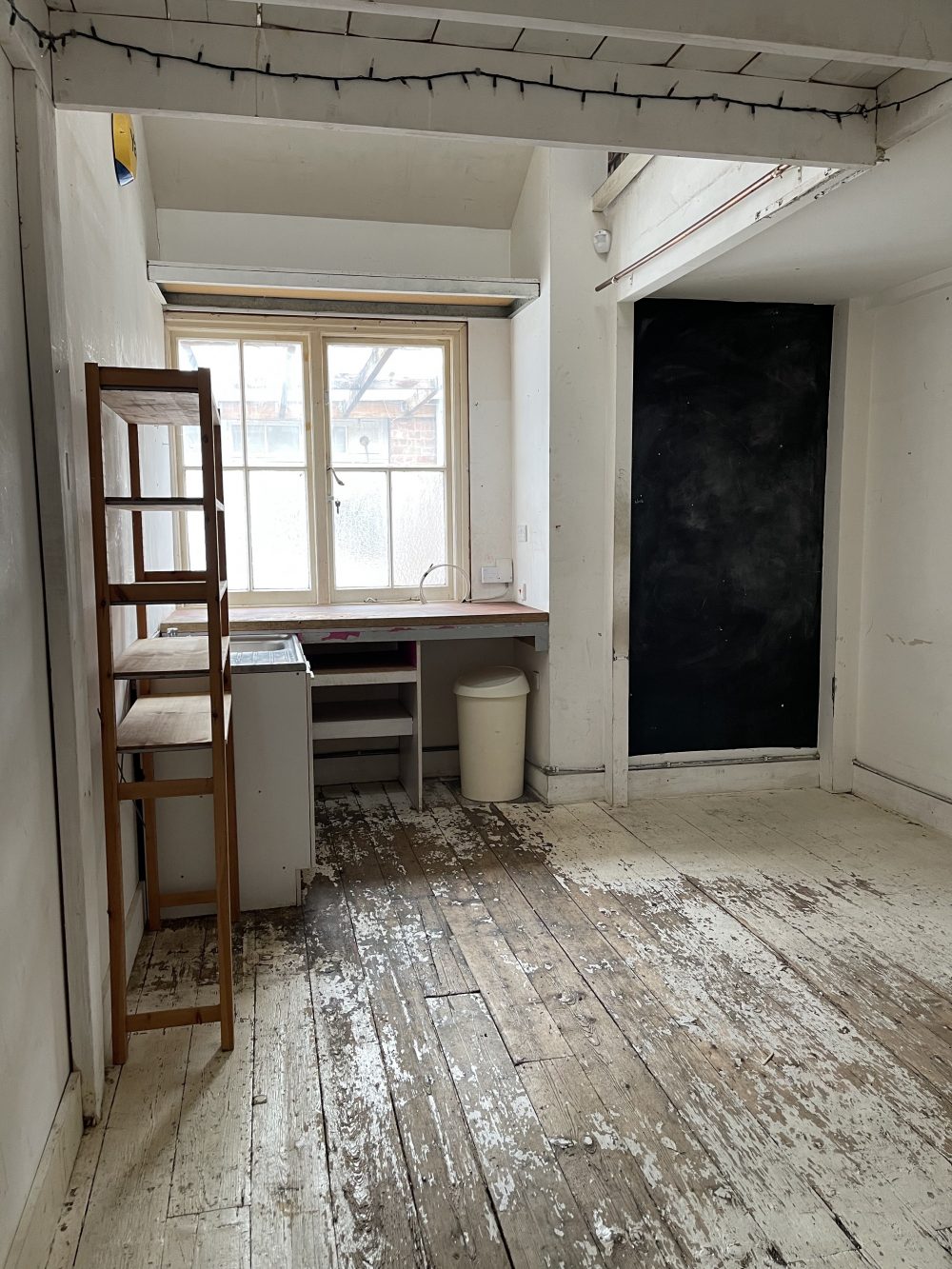 The studio is 380 sq ft in total size which consists of a 250 sq ft ground floor and a 130 sq ft mezzanine floor with a roof height of 10 to 16 ft.