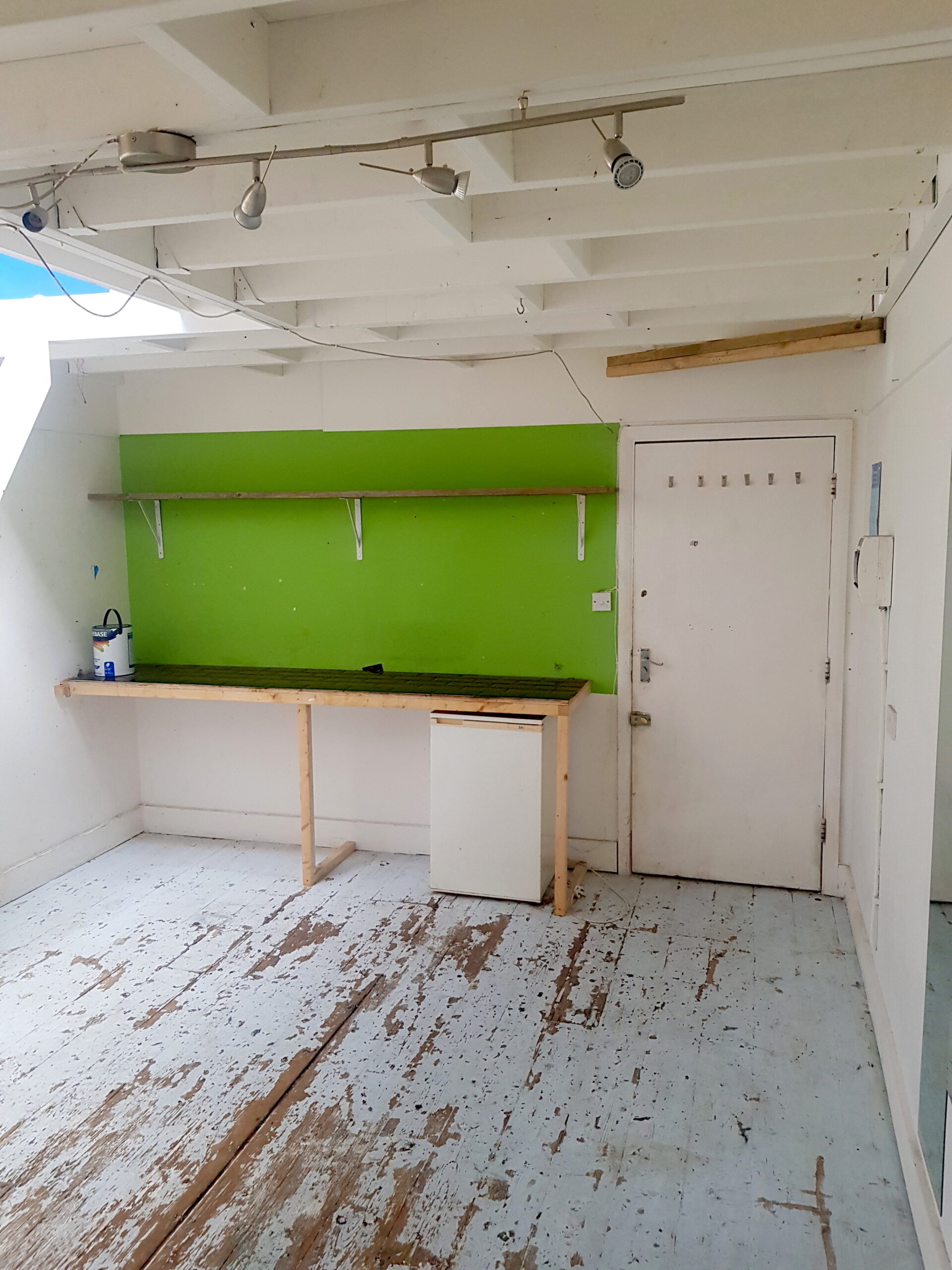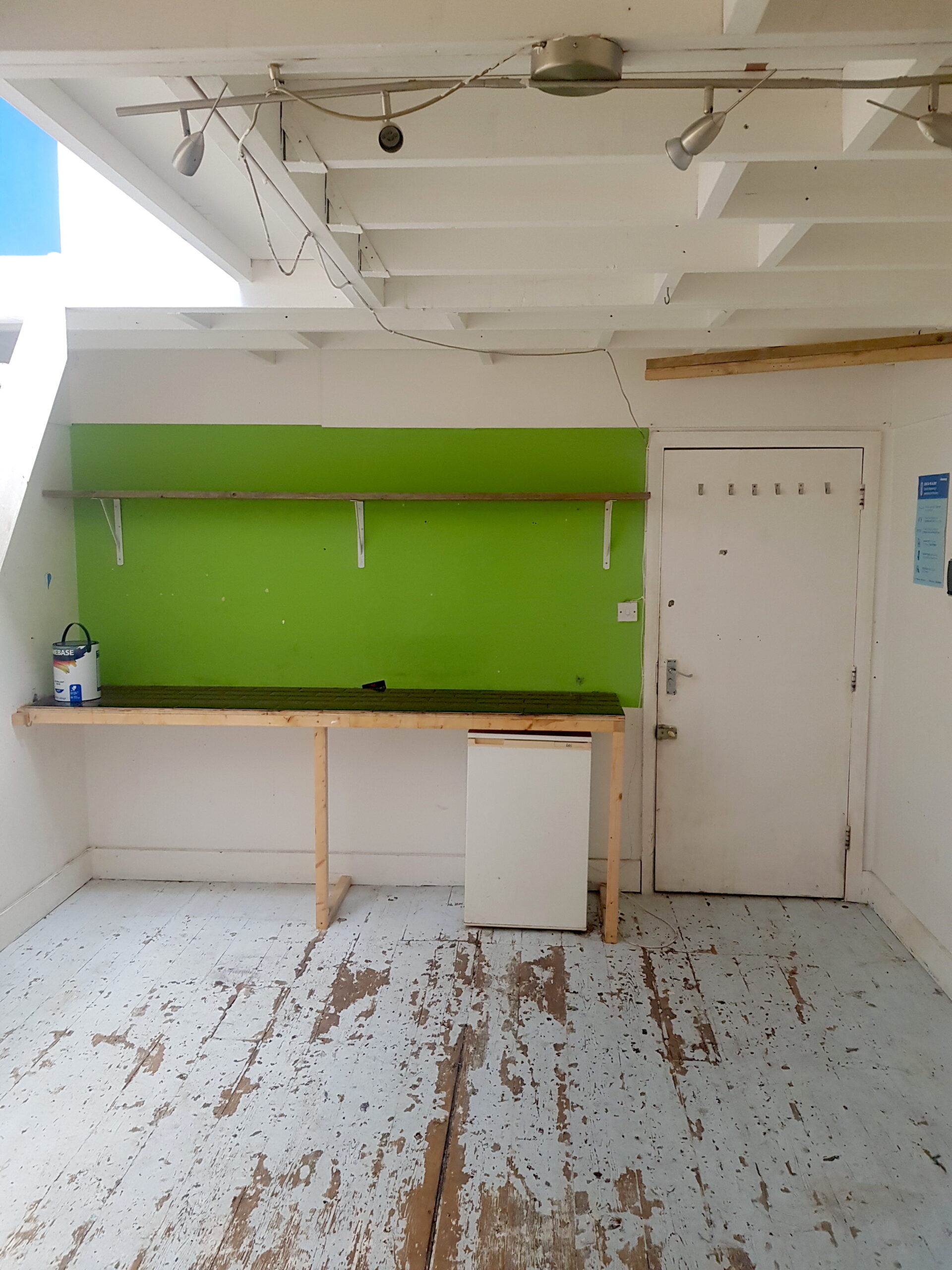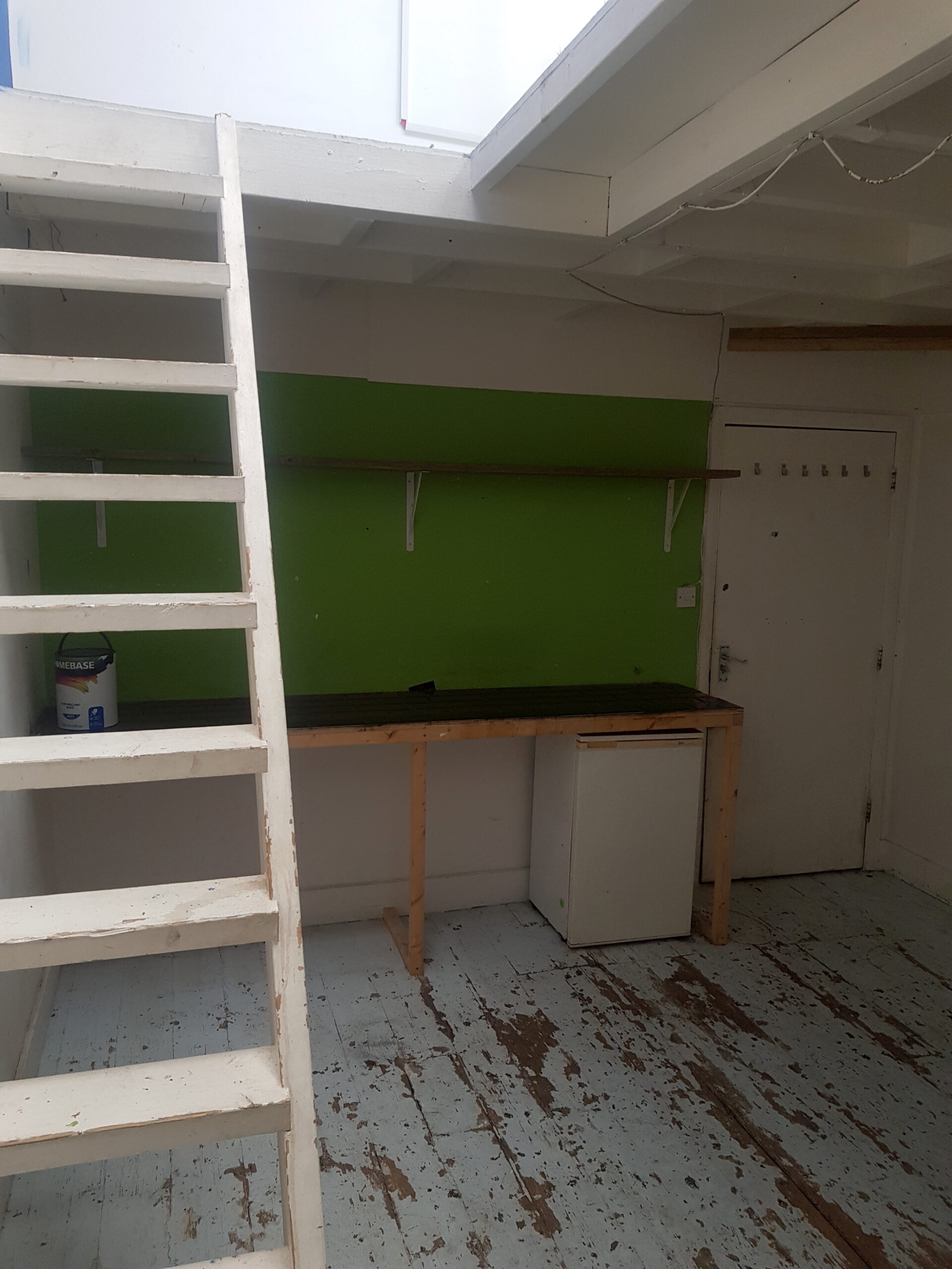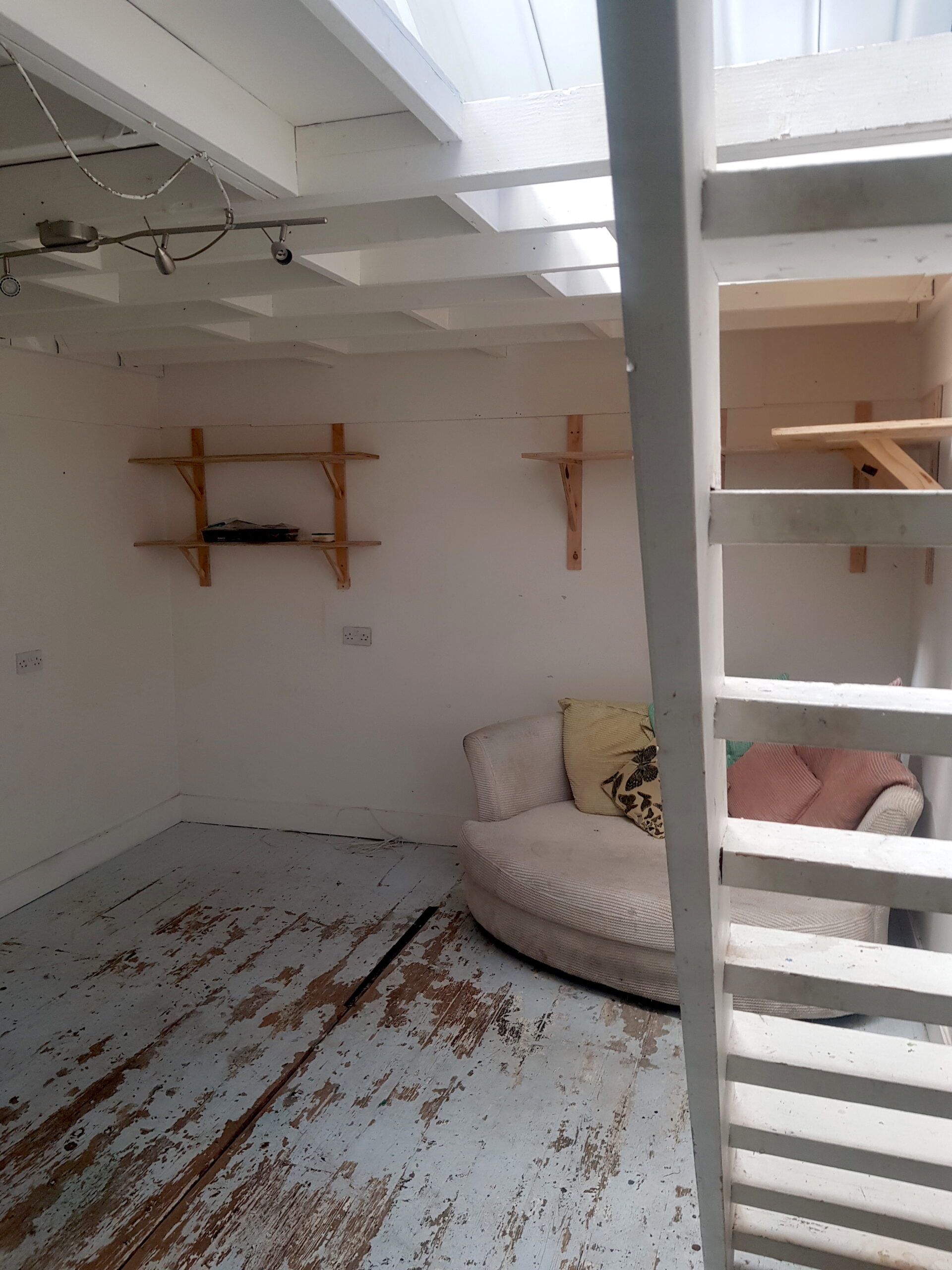 The studio is 380 sq ft in  total size which consists of a 200 sq ft ground floor and a 180 sq ft mezzanine floor with a roof height of 8’2 ft.