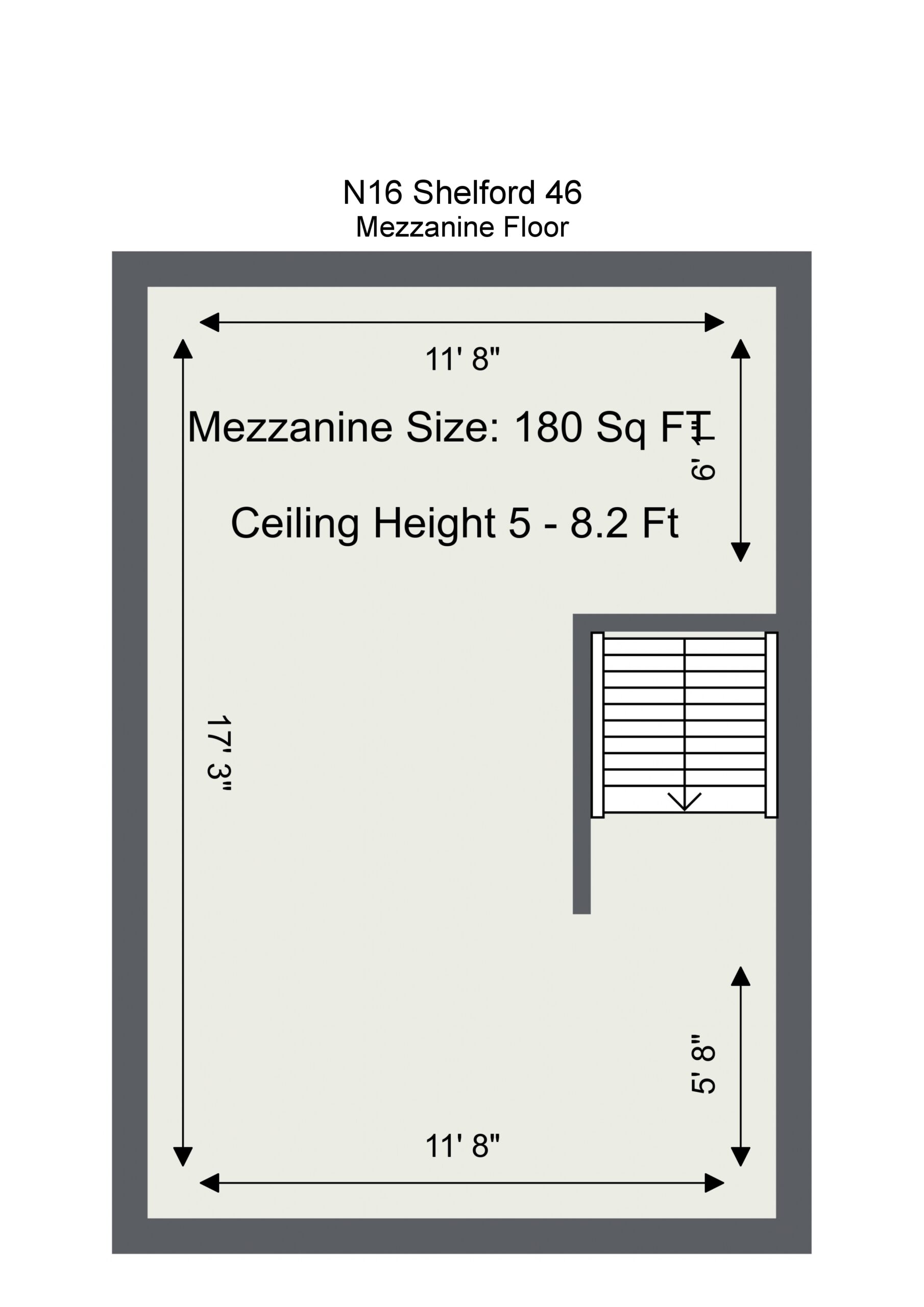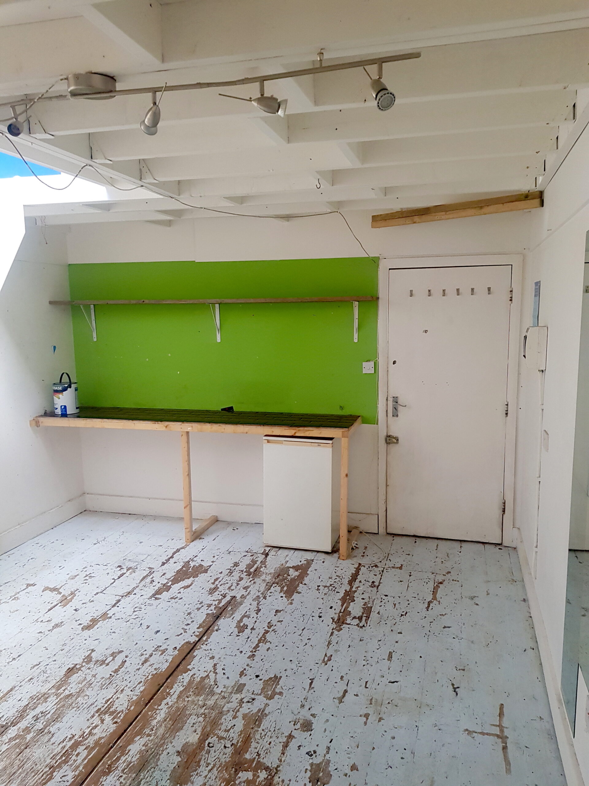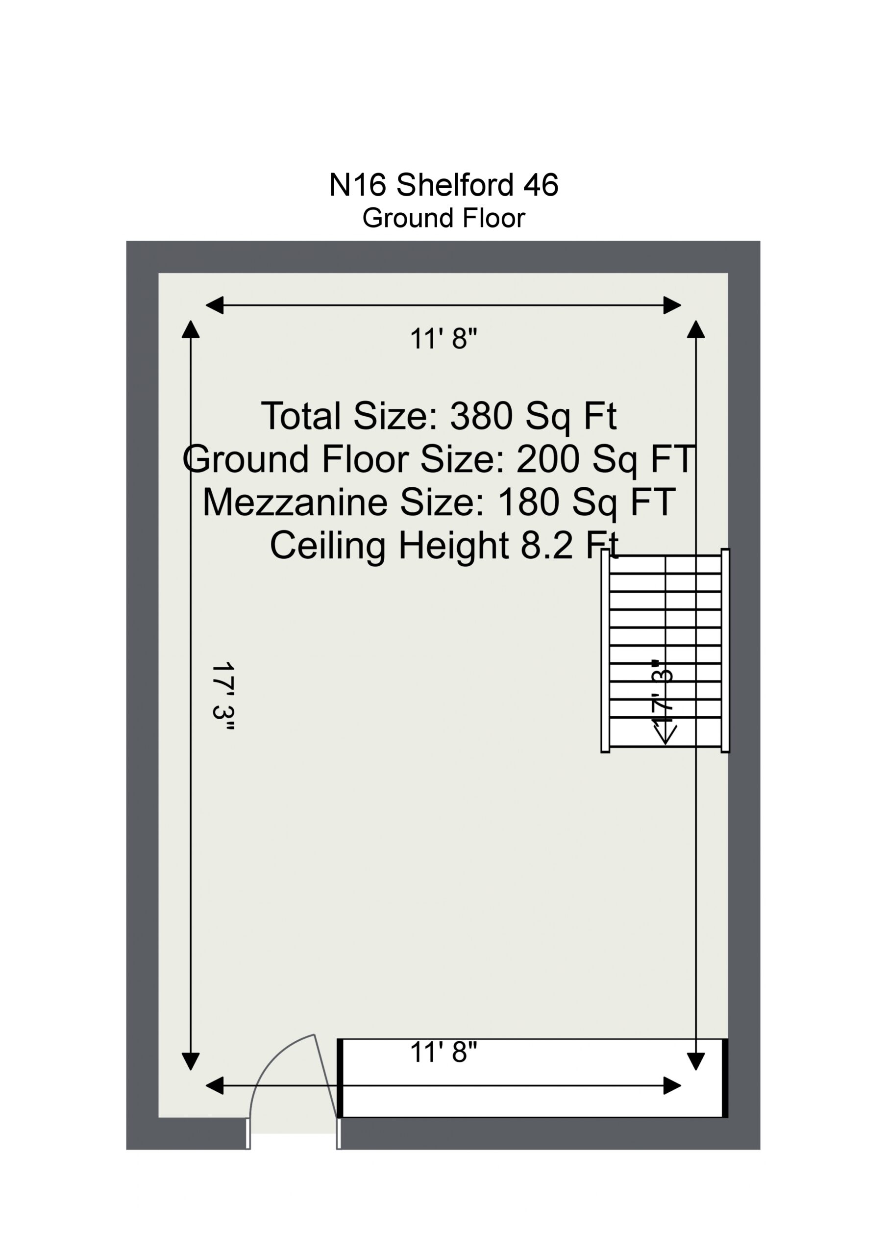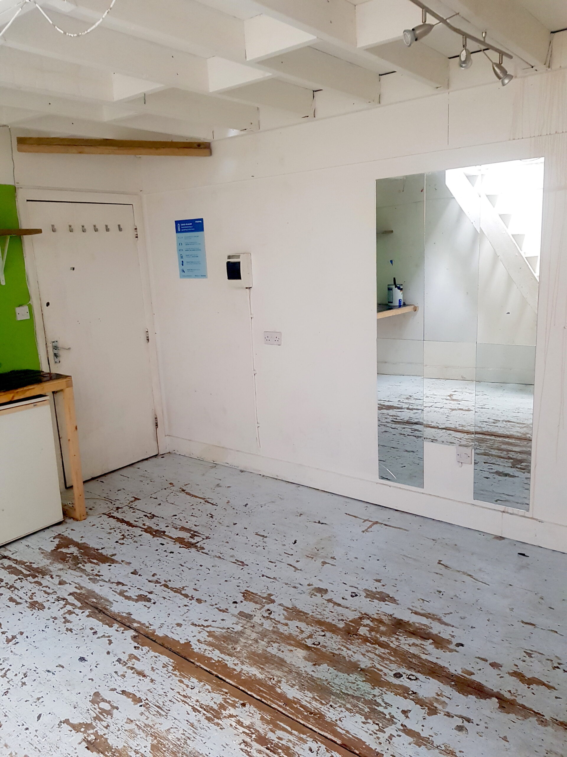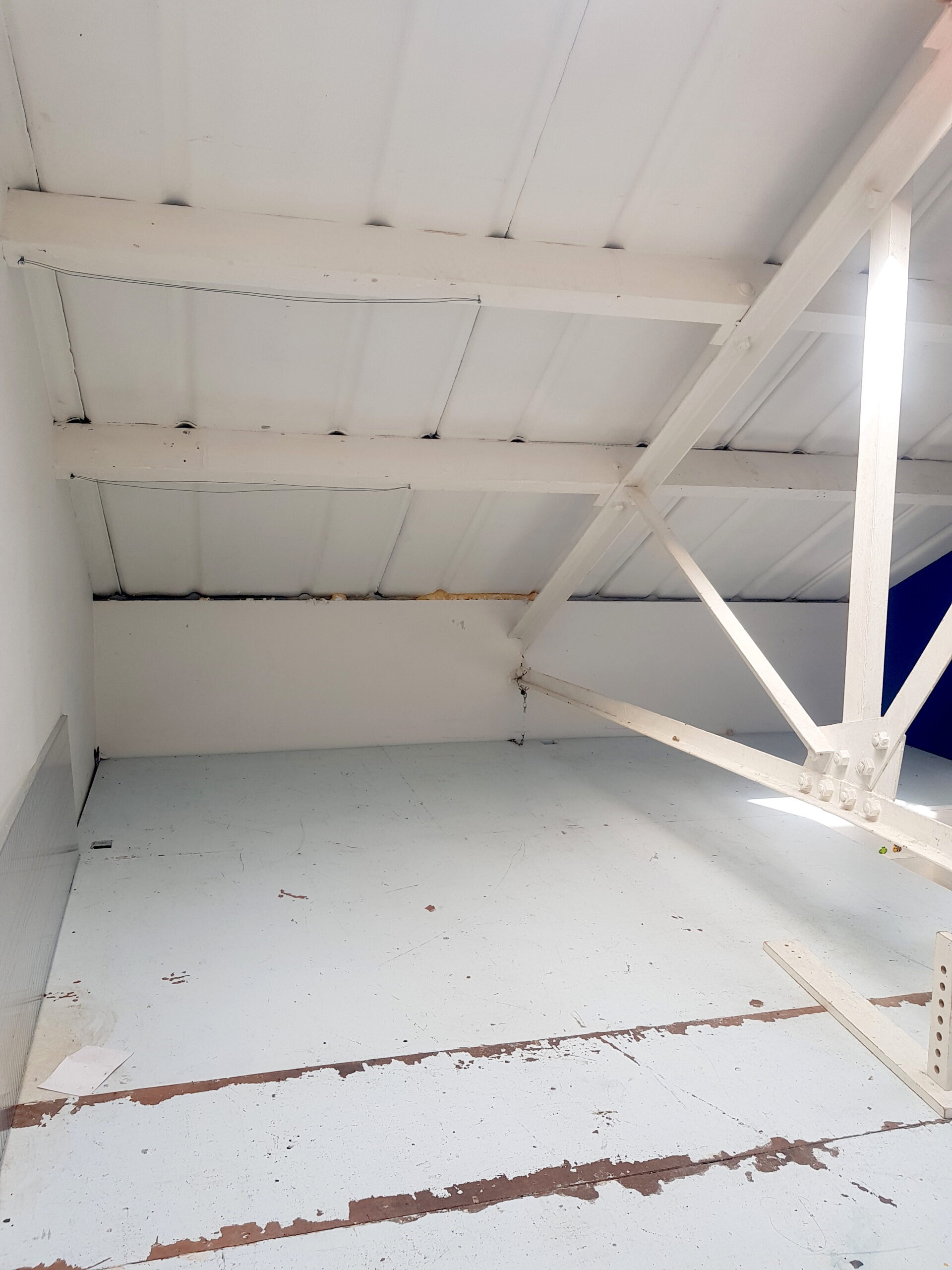 The studio is 380 sq ft in  total size which consists of a 200 sq ft ground floor and a 180 sq ft mezzanine floor with a roof height of 8’2 ft.