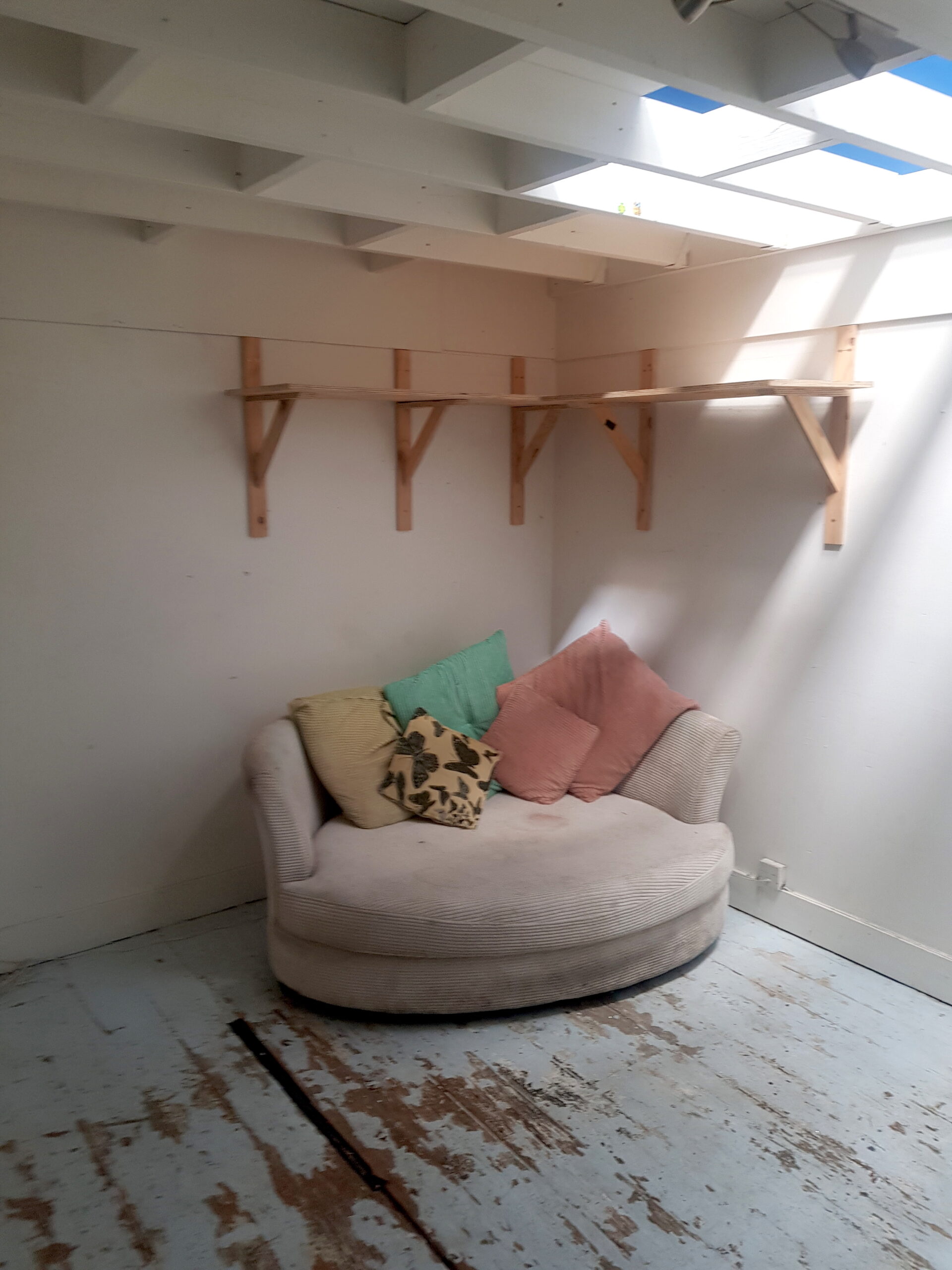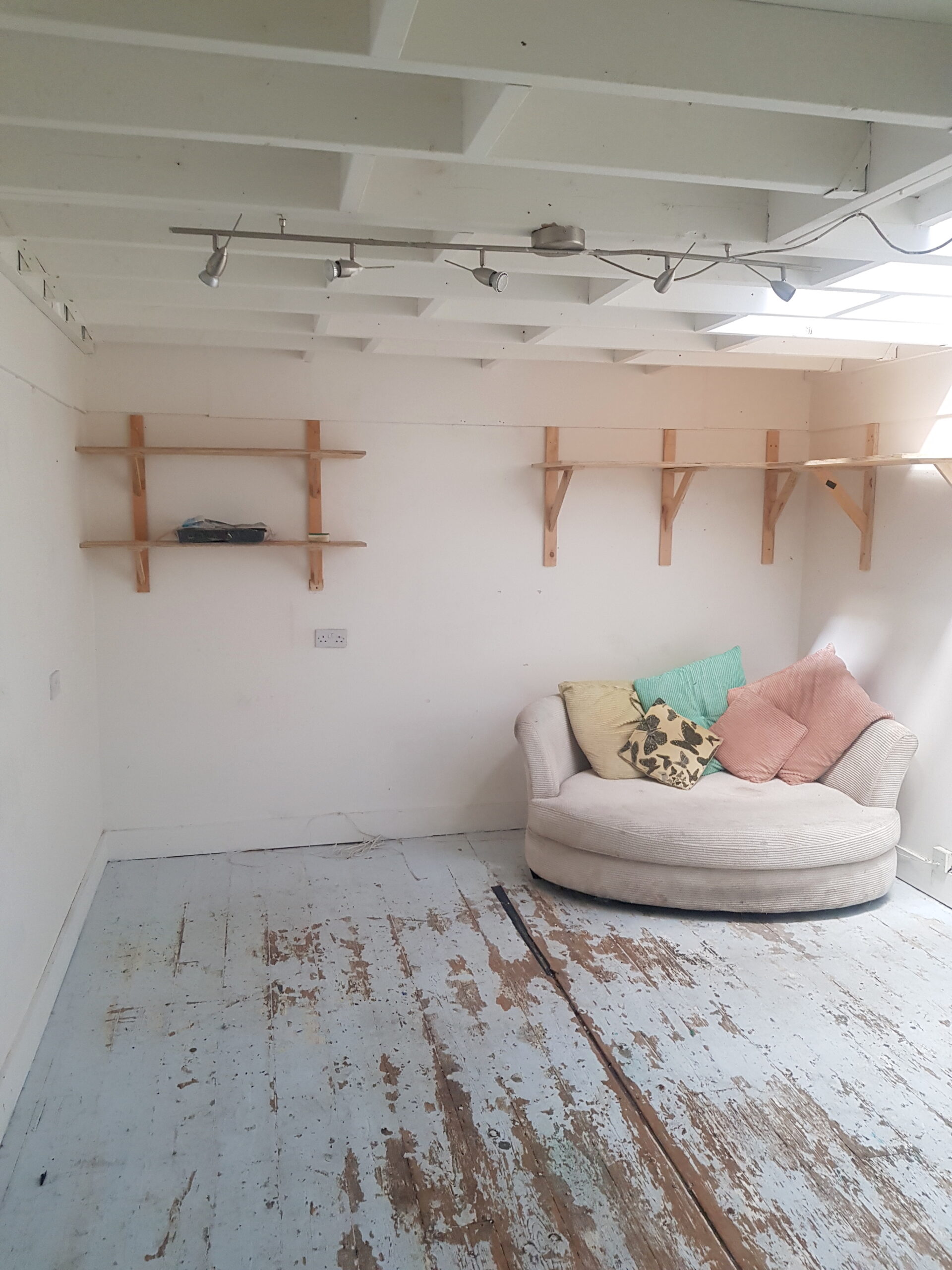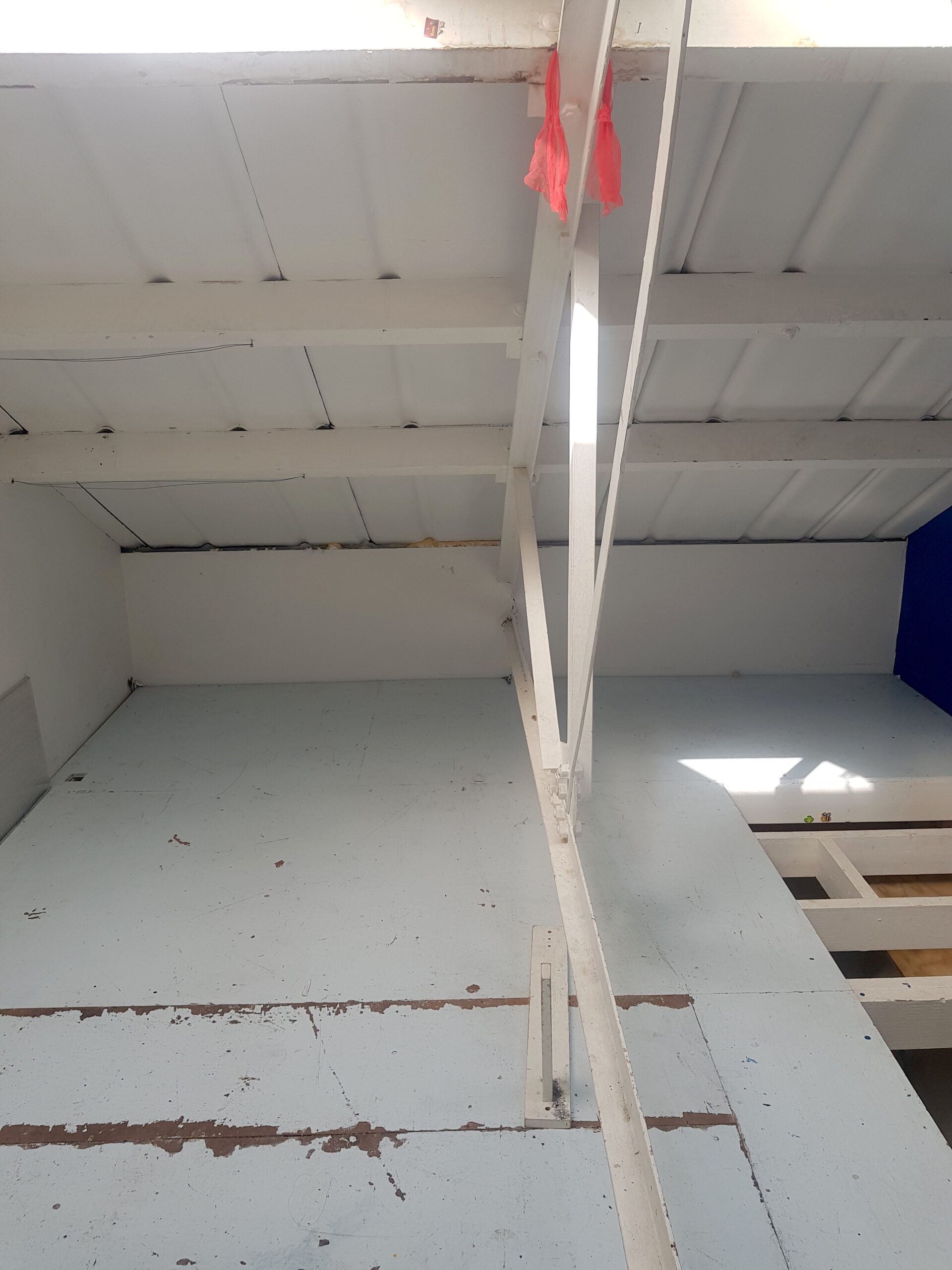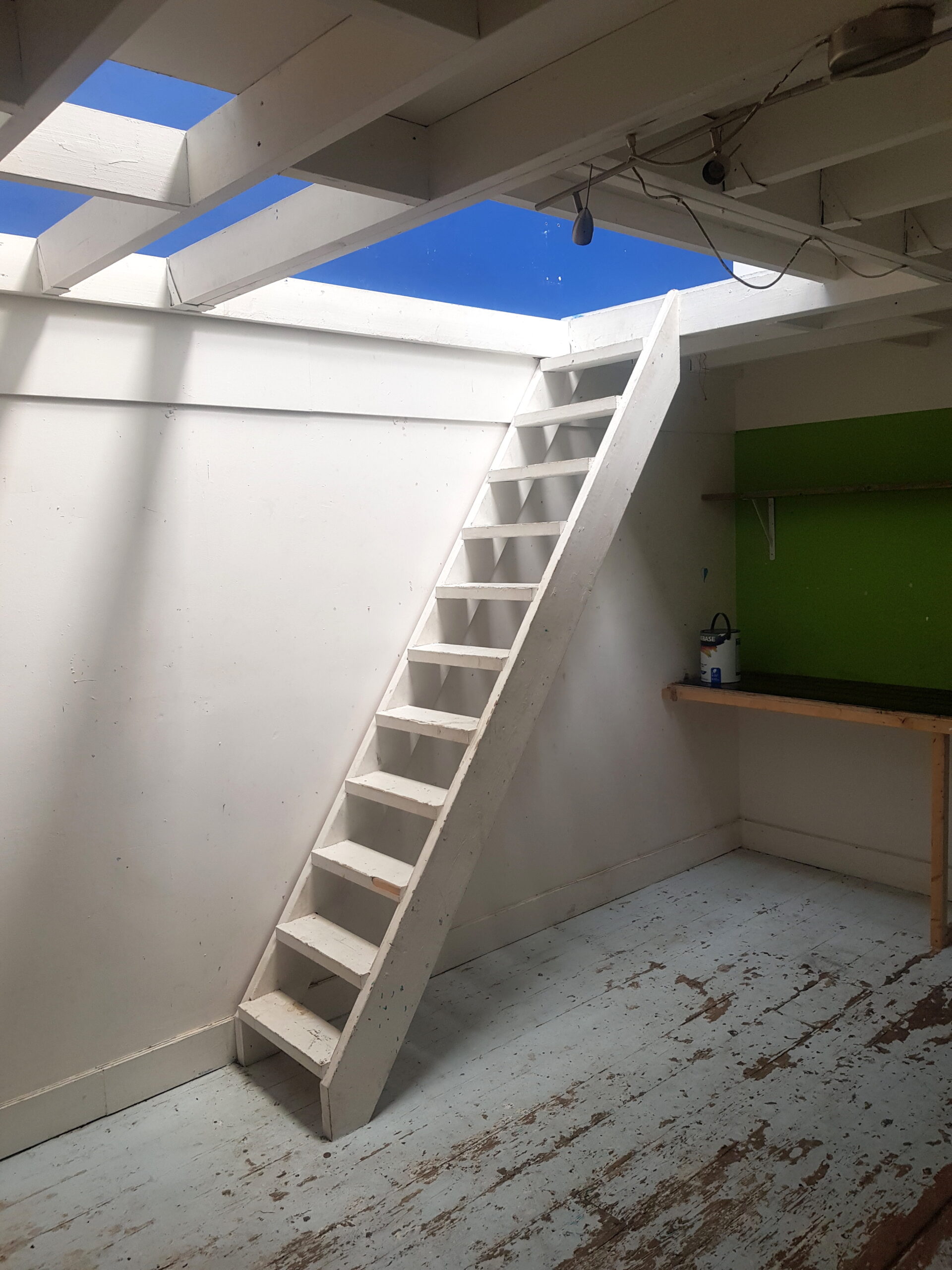 The studio is 380 sq ft in  total size which consists of a 200 sq ft ground floor and a 180 sq ft mezzanine floor with a roof height of 8’2 ft.