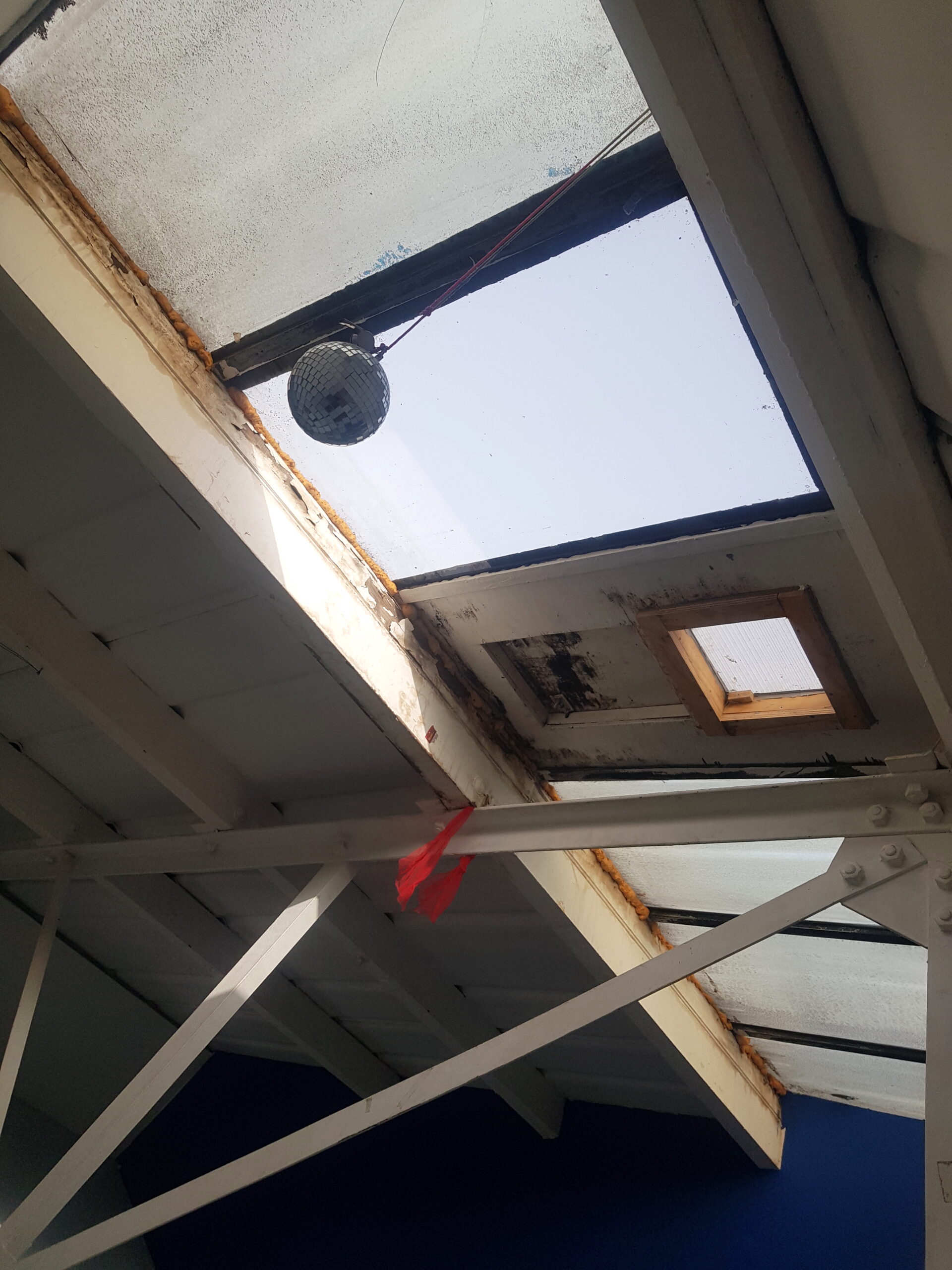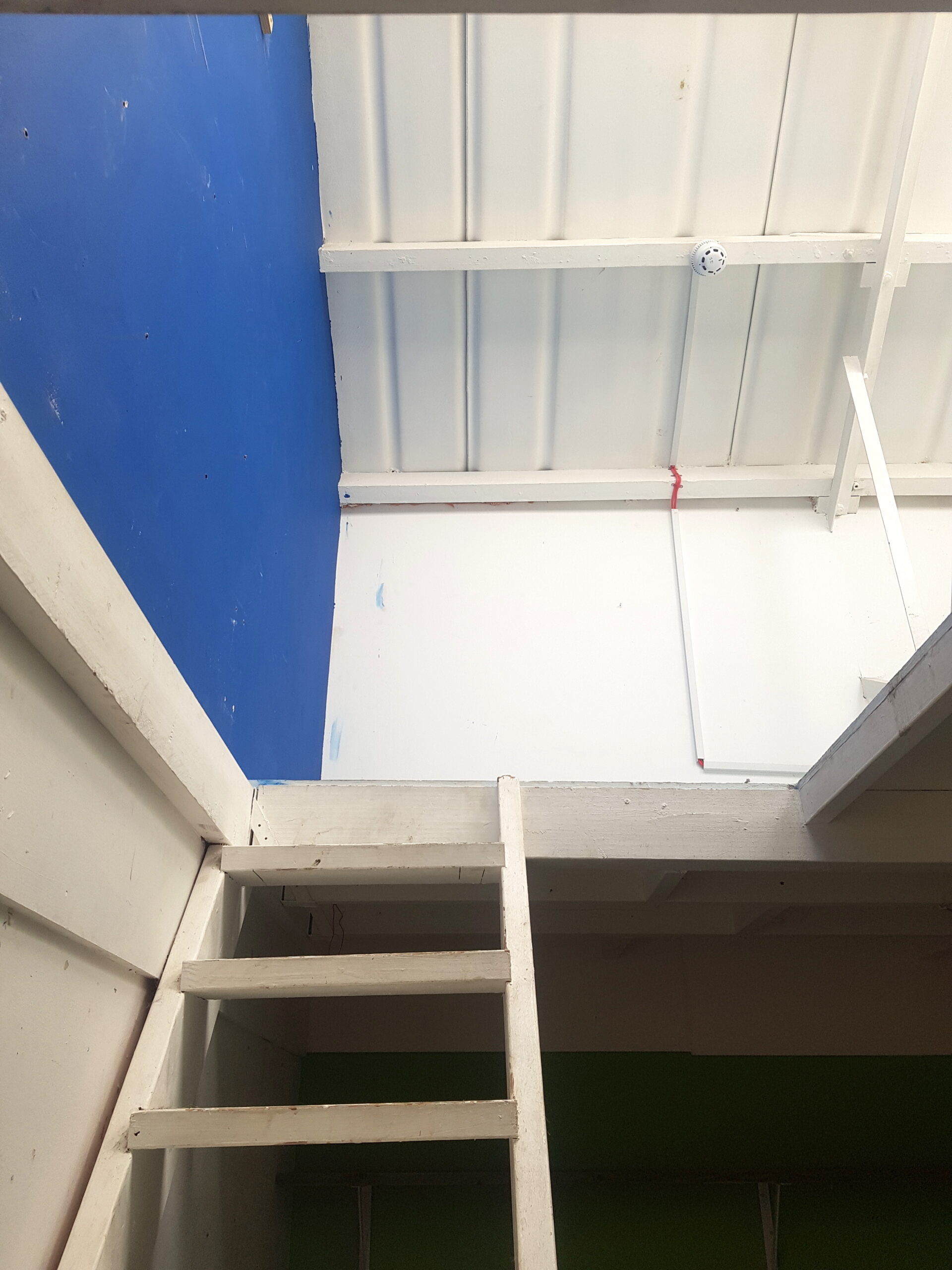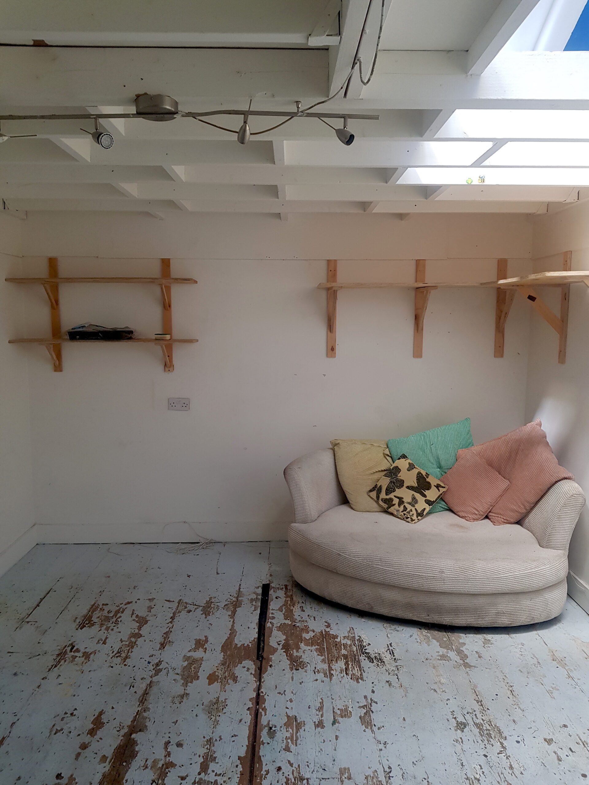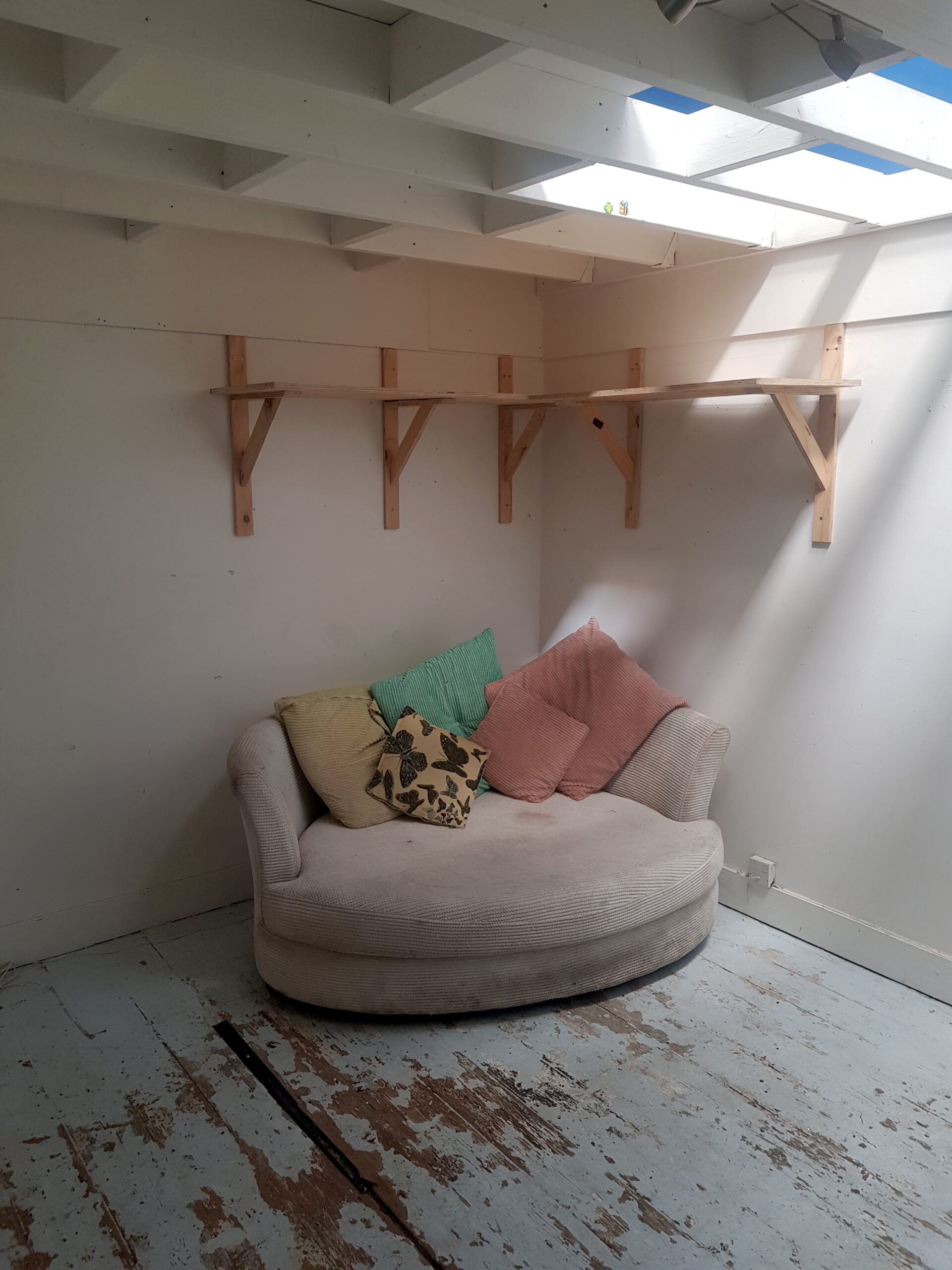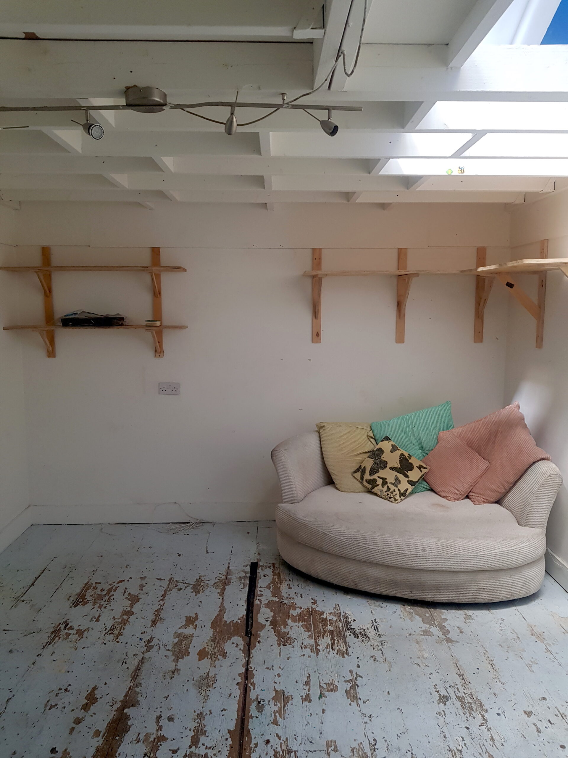 The studio is 380 sq ft in  total size which consists of a 200 sq ft ground floor and a 180 sq ft mezzanine floor with a roof height of 8’2 ft.