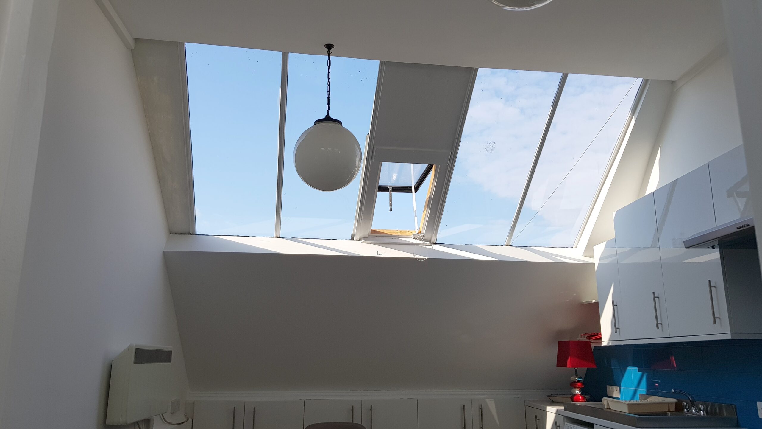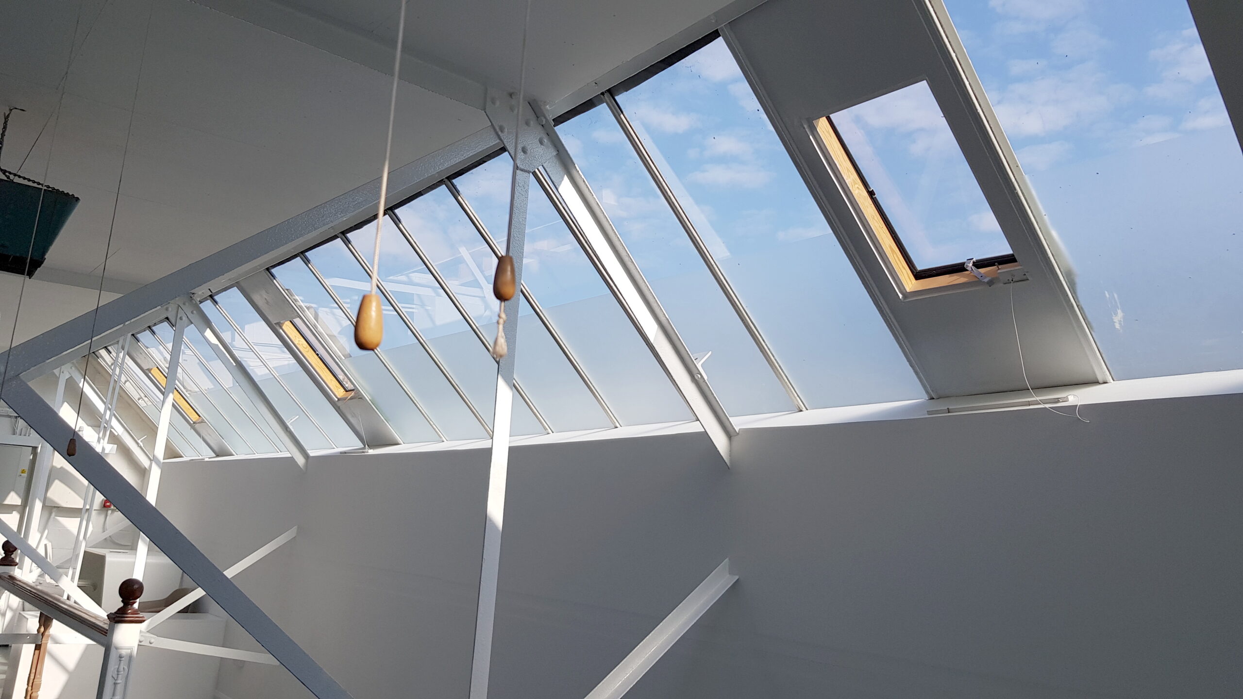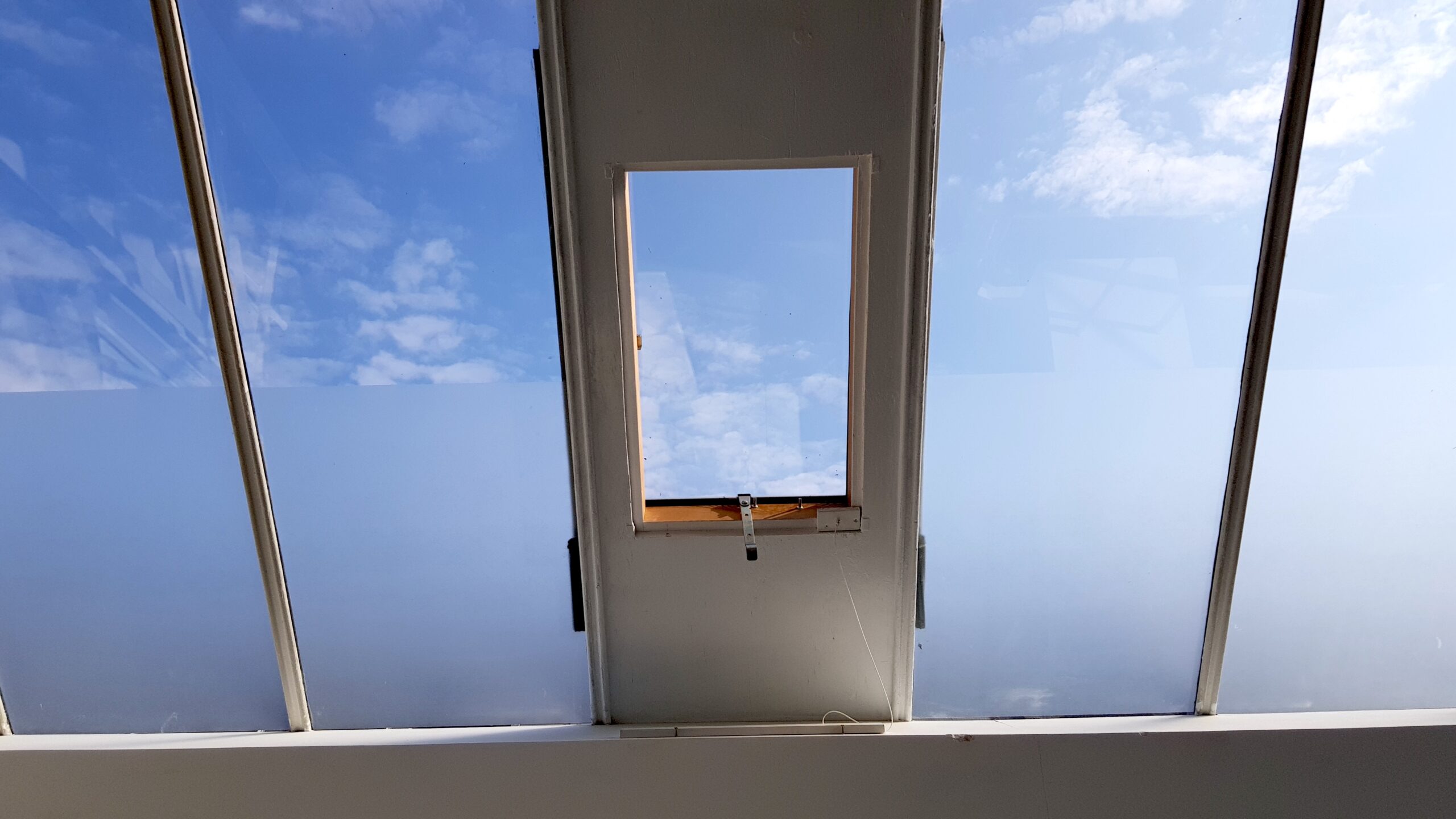 A huge open area / workspace (with tiled floor), high roof and skylights letting in lots of natural light
