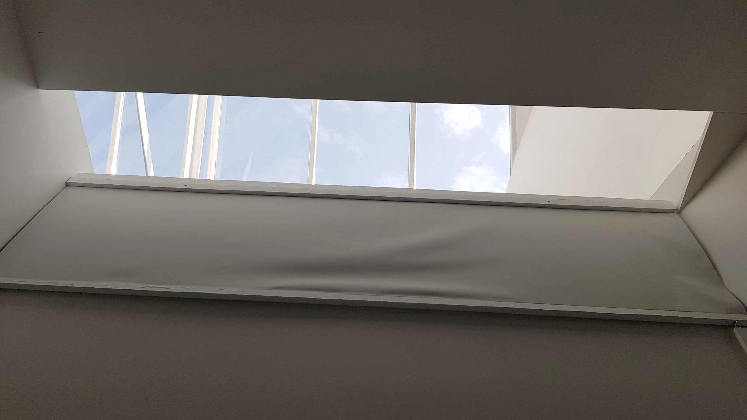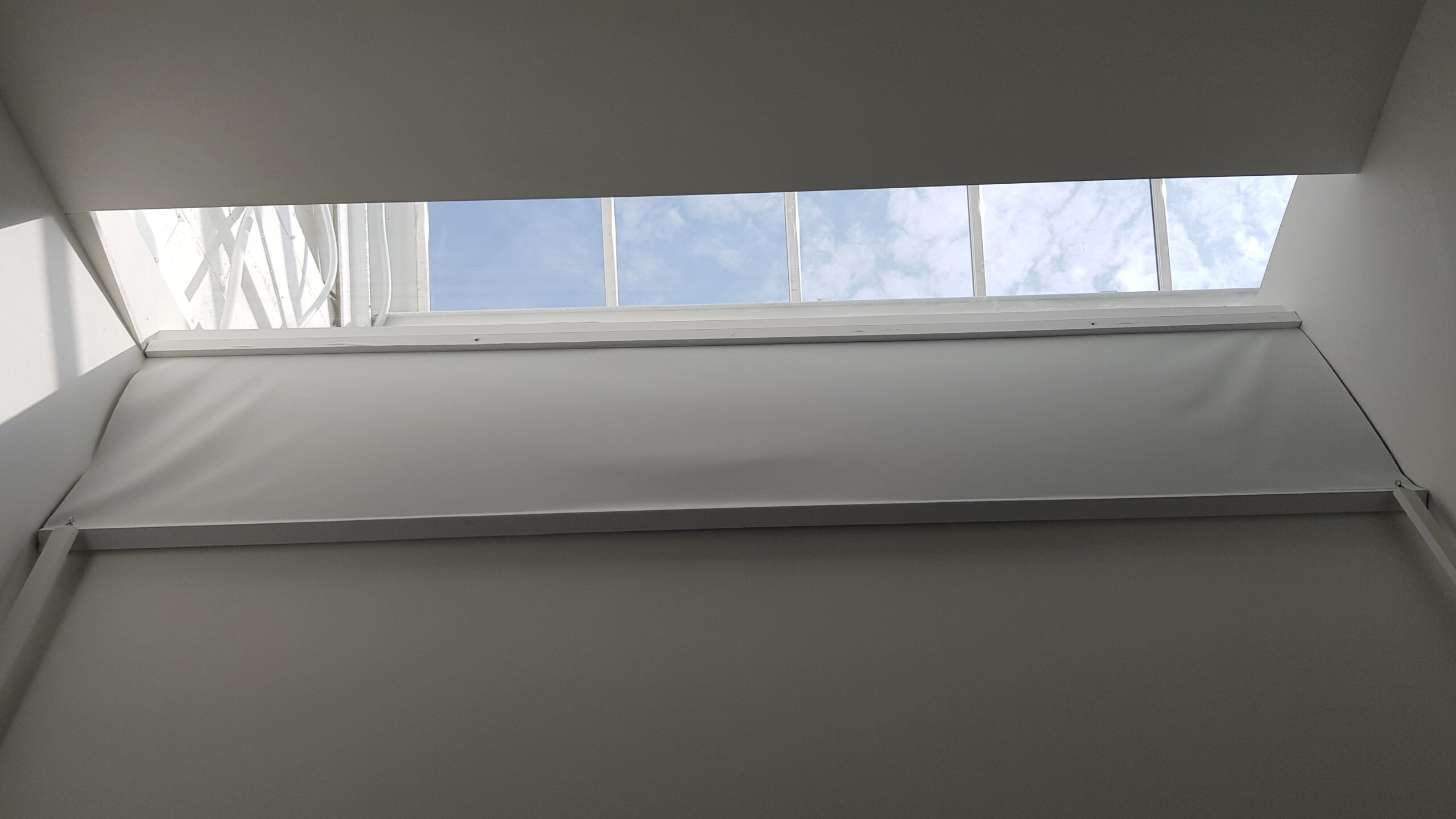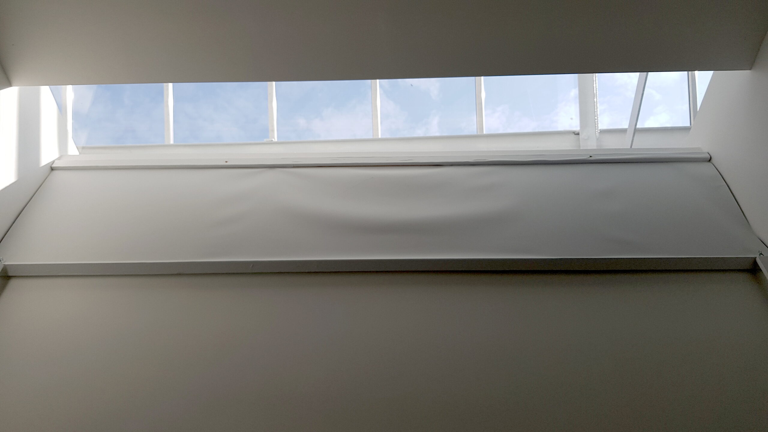A huge open area / workspace (with tiled floor), high roof and skylights letting in lots of natural light