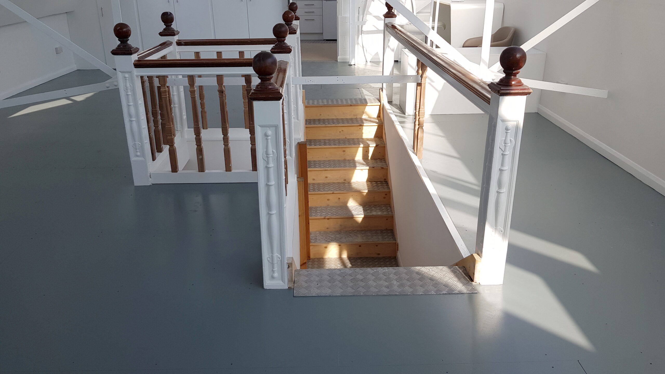 The ground floor open area has a red concrete floor, and the first floor open area has a wooden floor (painted flint grey).