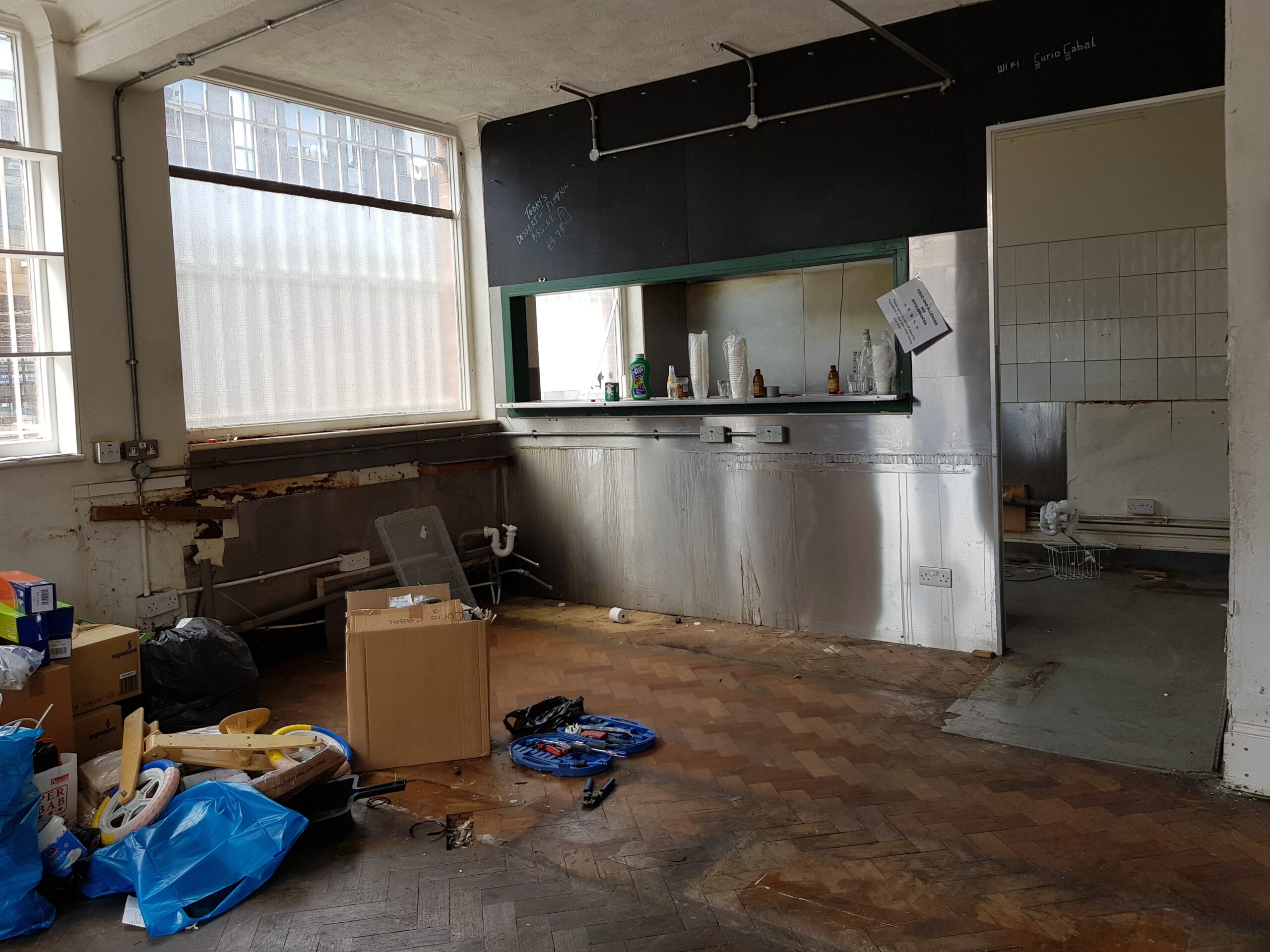 The ground floor consists of two halves, the front is a large open area, approximately 900 sq ft, which was a cafe, and has the remains of a kitchen, and a large seating area. There is also outdoor seating on the ground floor at the front of the building. The second half (rear) of the ground floor has an open area of approx 500 sq ft, plus 4 rooms / art studios / offices.