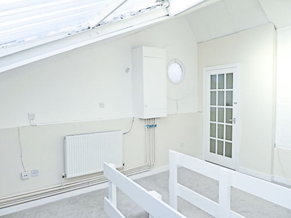 The studio measures 700 sq ft on the ground floor, comprising of a large open area, with high roof (19’00) and glass skylights, plus 1 separate room on the ground floor, an open plan kitchen just off the main area, and a large tiled separate shower / toilet room.