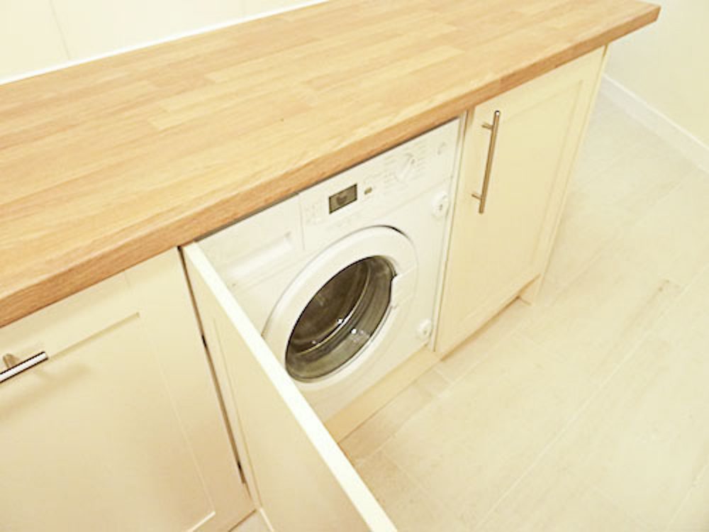 The kitchen area has a kitchen sink, dishwasher, washing machine, cookers, oven and fridge.
