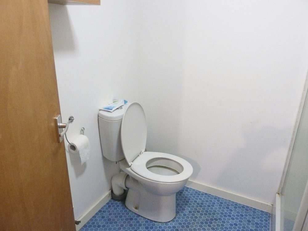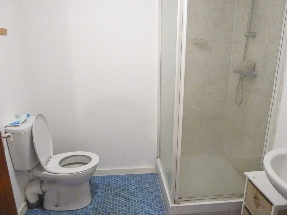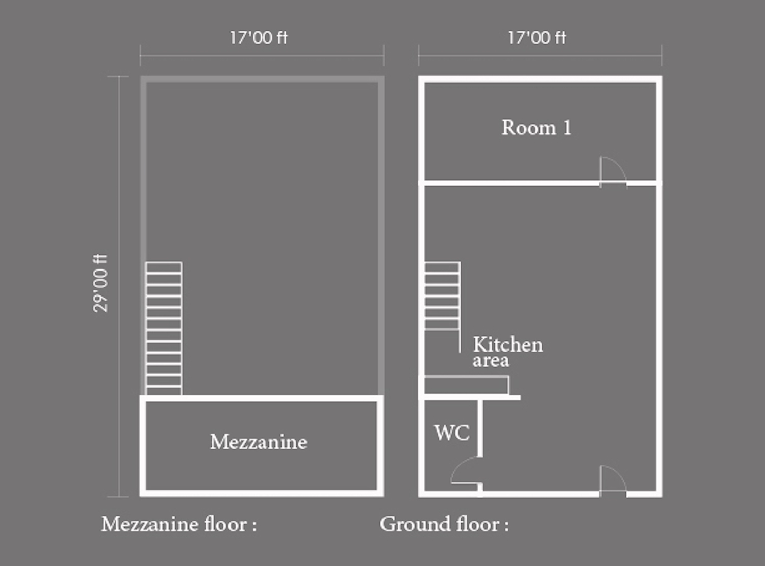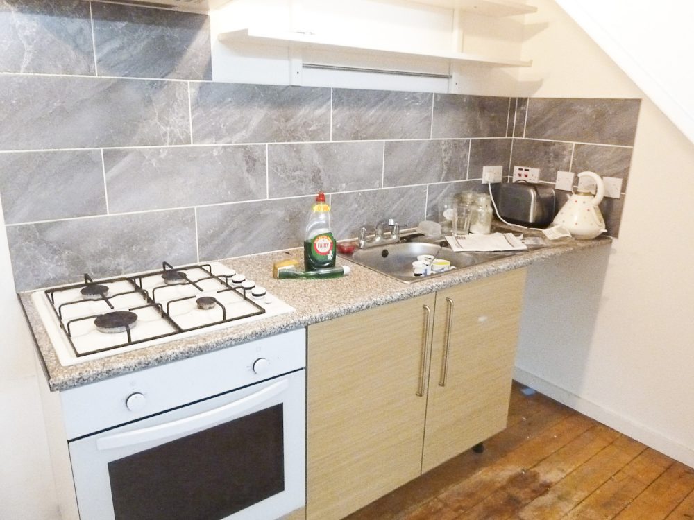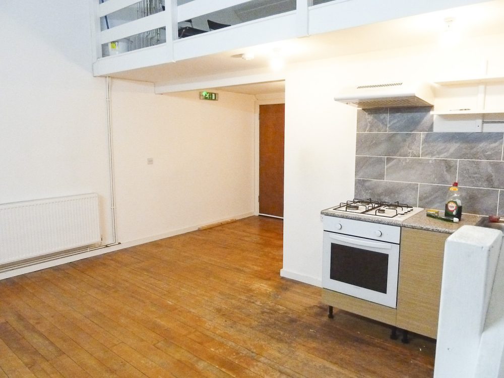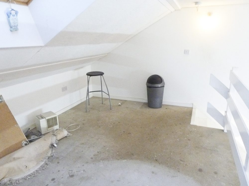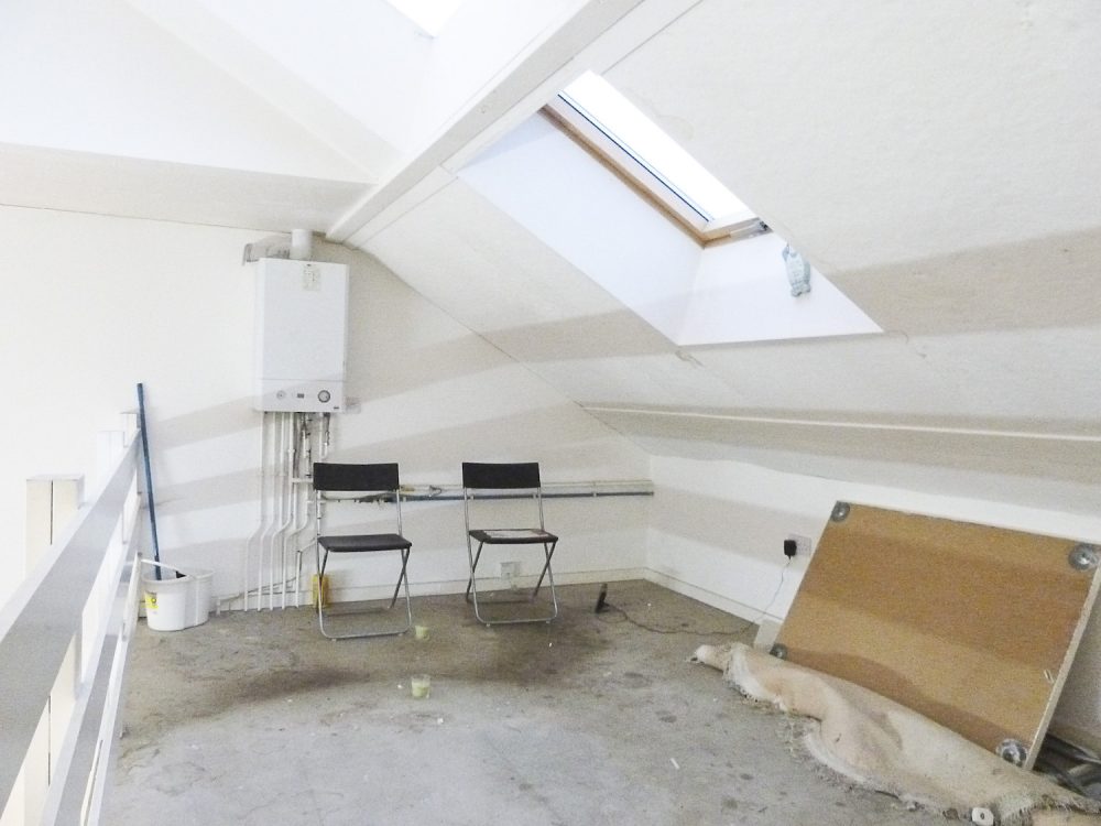The studio has bright white painted walls, laminate flooring and natural light coming in from the windows in the open area and the velux skylight windows in the mezzanine floor.