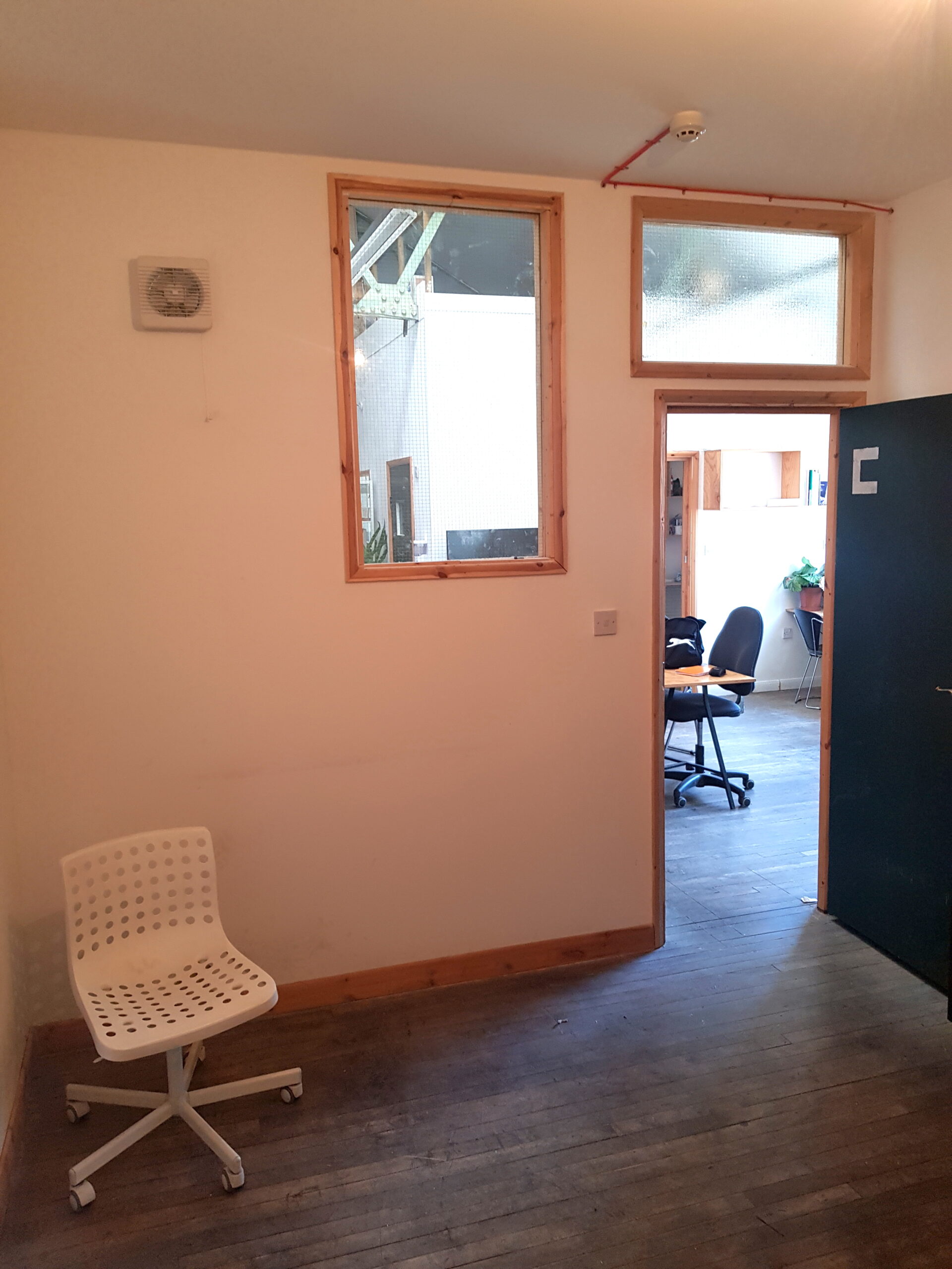 Studio C: is 132 sq ft in size and consists of white painted walls, open studio space, wooden flooring and a roof height of 9ft.