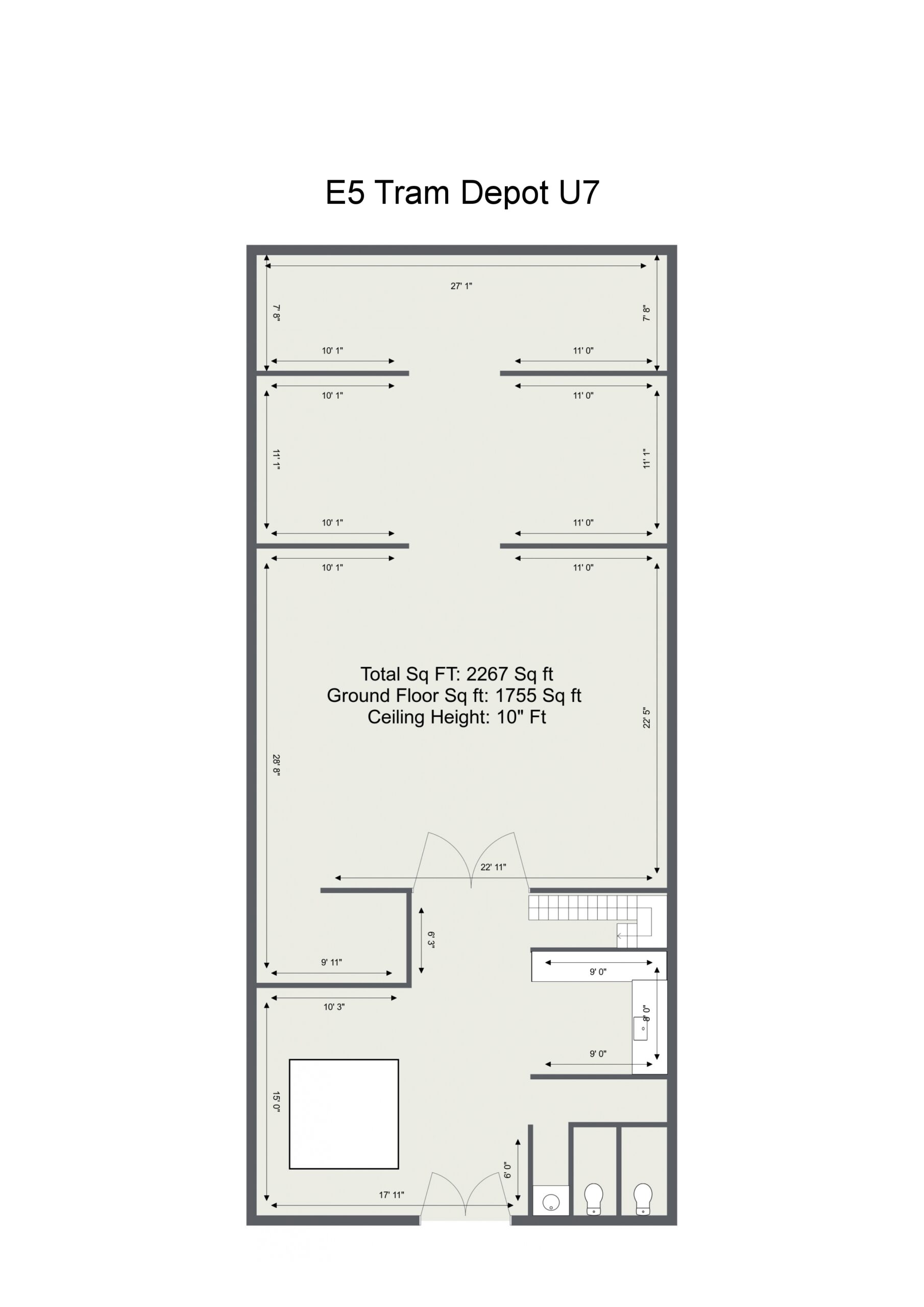 The unit is located on the ground floor and has a ground floor area of 1665 sq ft with a 10’00 ft high ceiling and a second floor area of 912 sq ft with a 7ft high pitched ceiling.