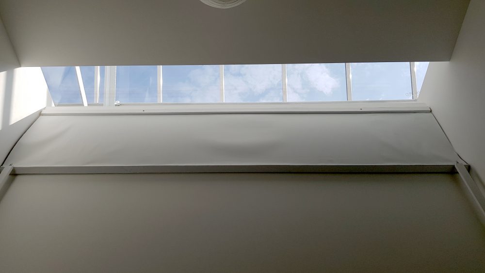 A huge open area / workspace (with tiled floor), high roof and skylights letting in lots of natural light