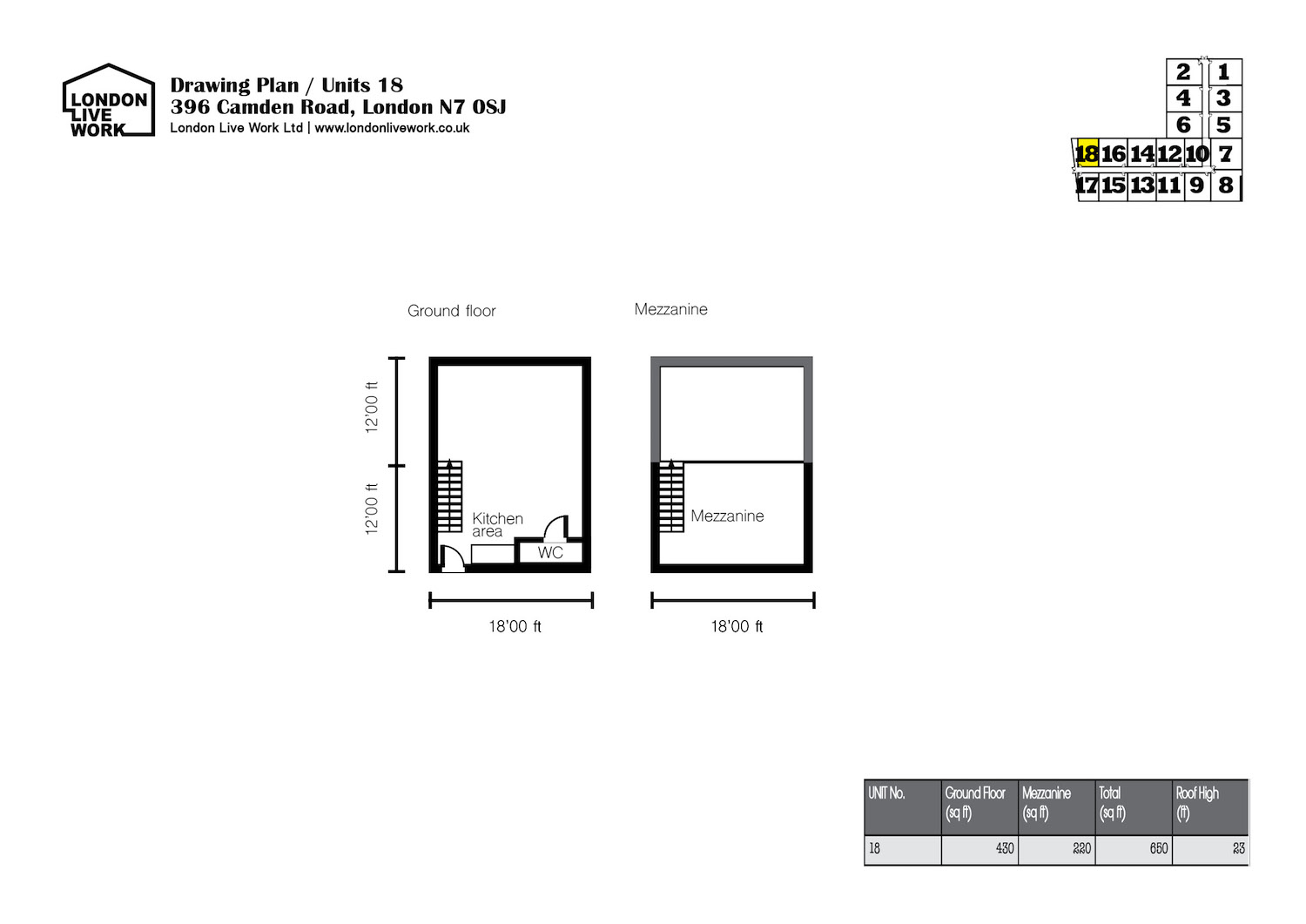 430 sq ft Ground floor and 220 sq ft mezzanine floor, 23 ft high pitched roof