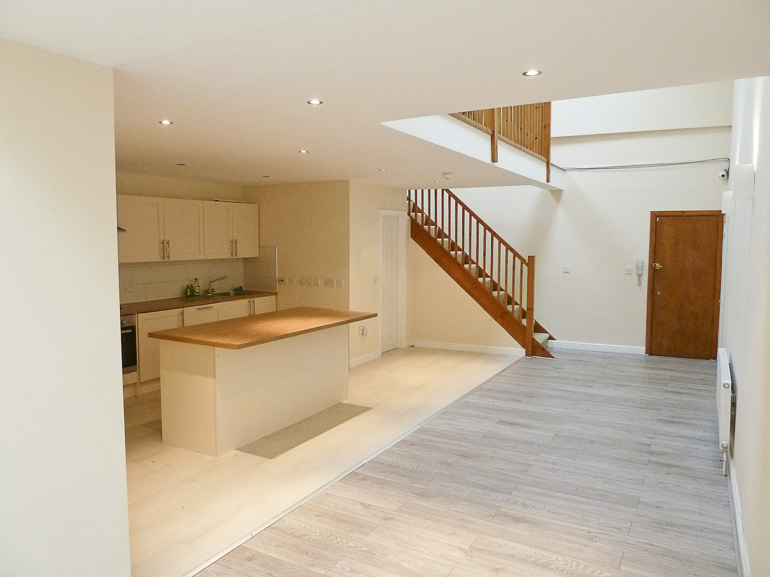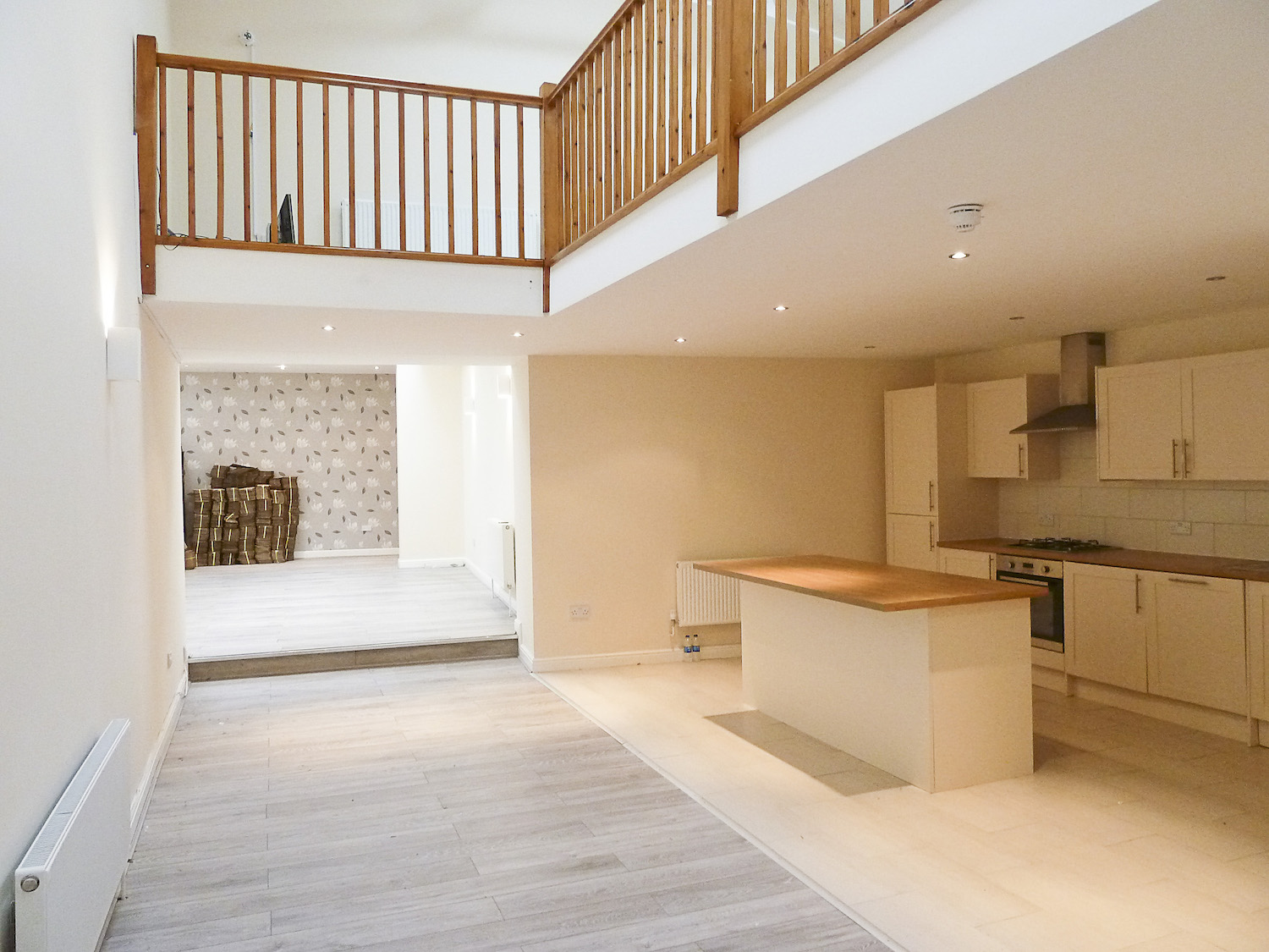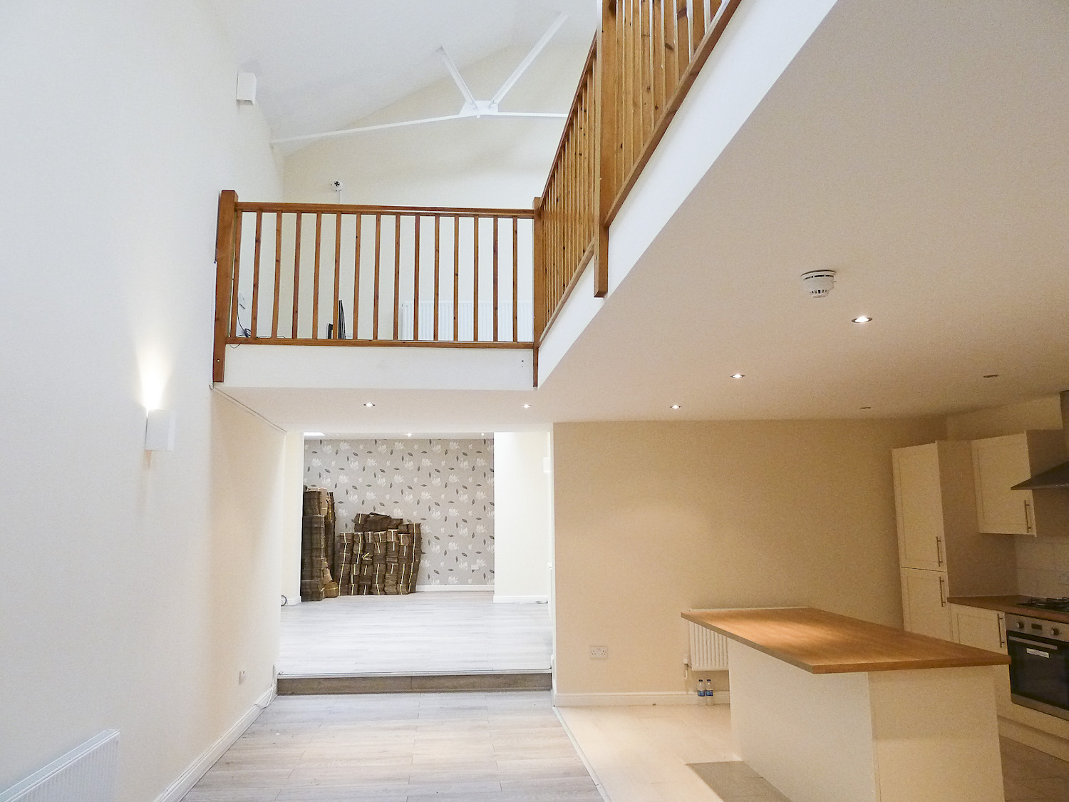 Split level live work unit to rent – 1100 sq ft gallery style unit with high pitched roof and mezzanine floor in warehouse conversion
