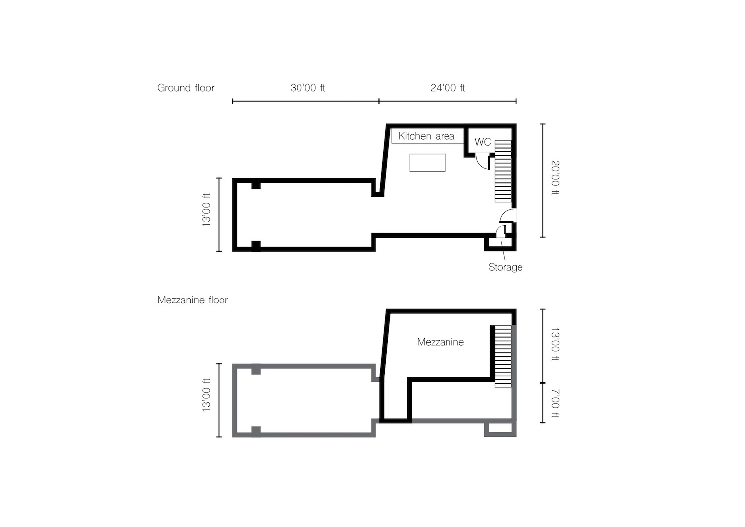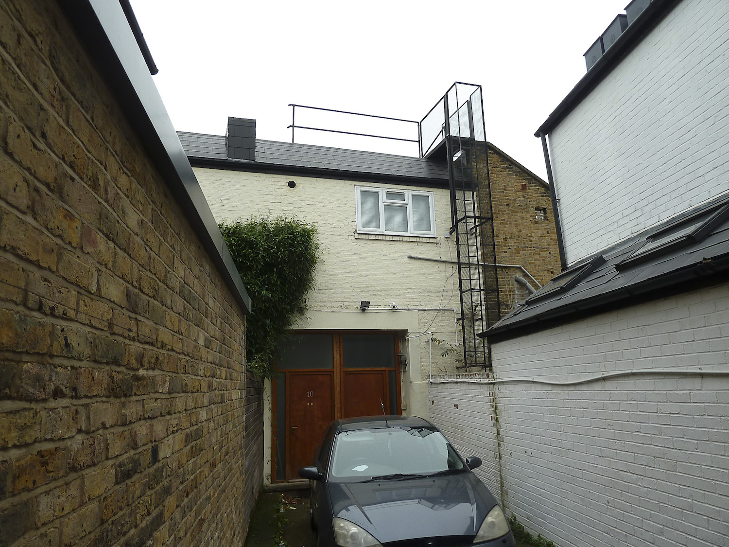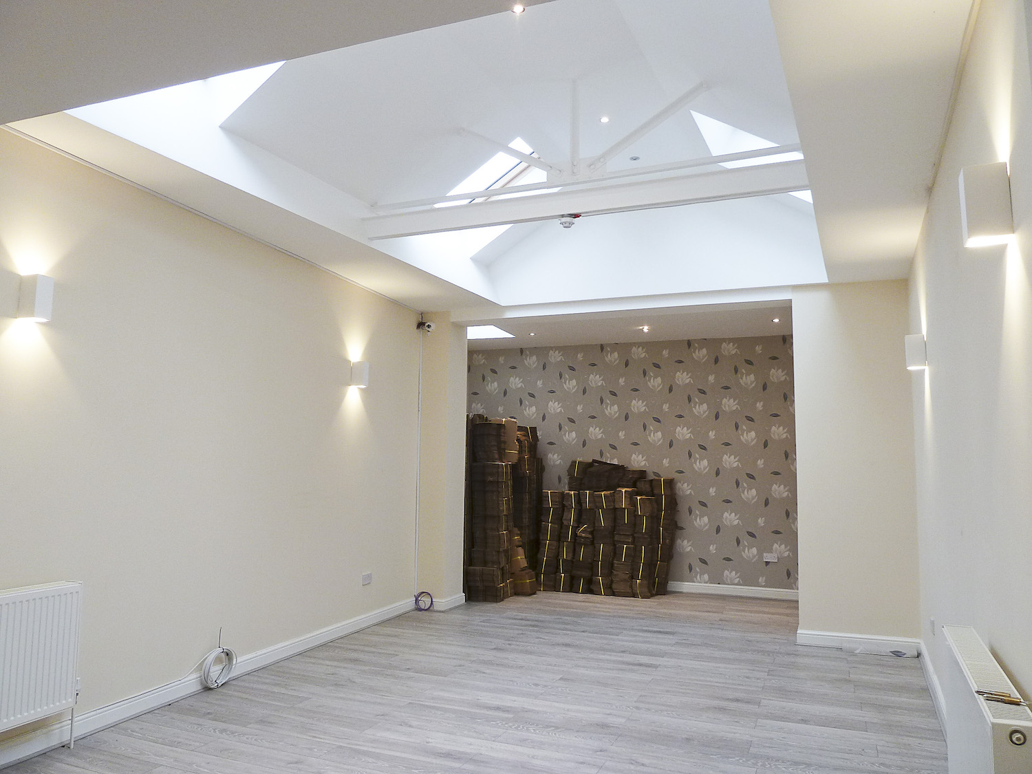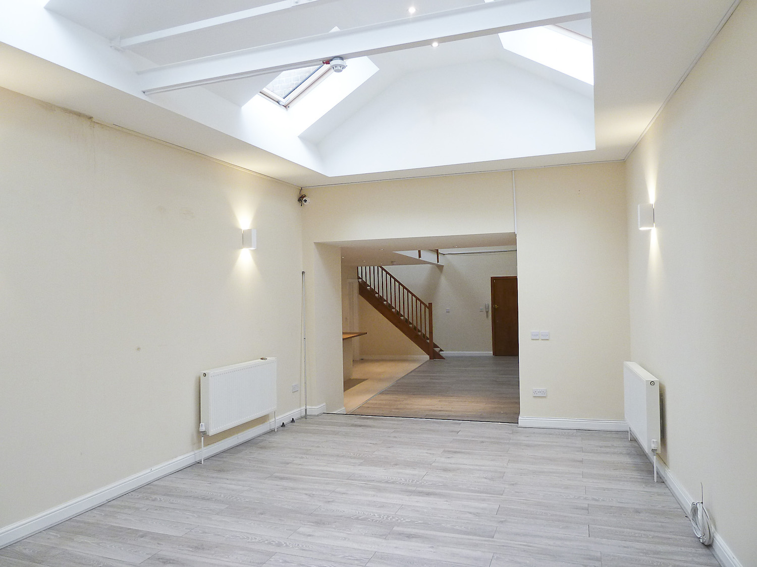 The studio measures 800 sq ft on the ground floor, comprising of a large open area, with high pitched roof (19’00) and glass skylights, plus an open plan kitchen area, and a bath/shower/toilet room.