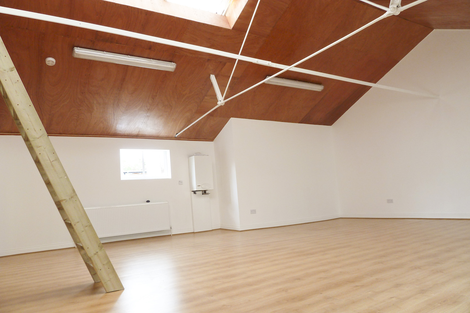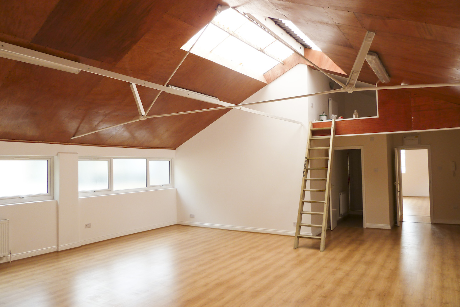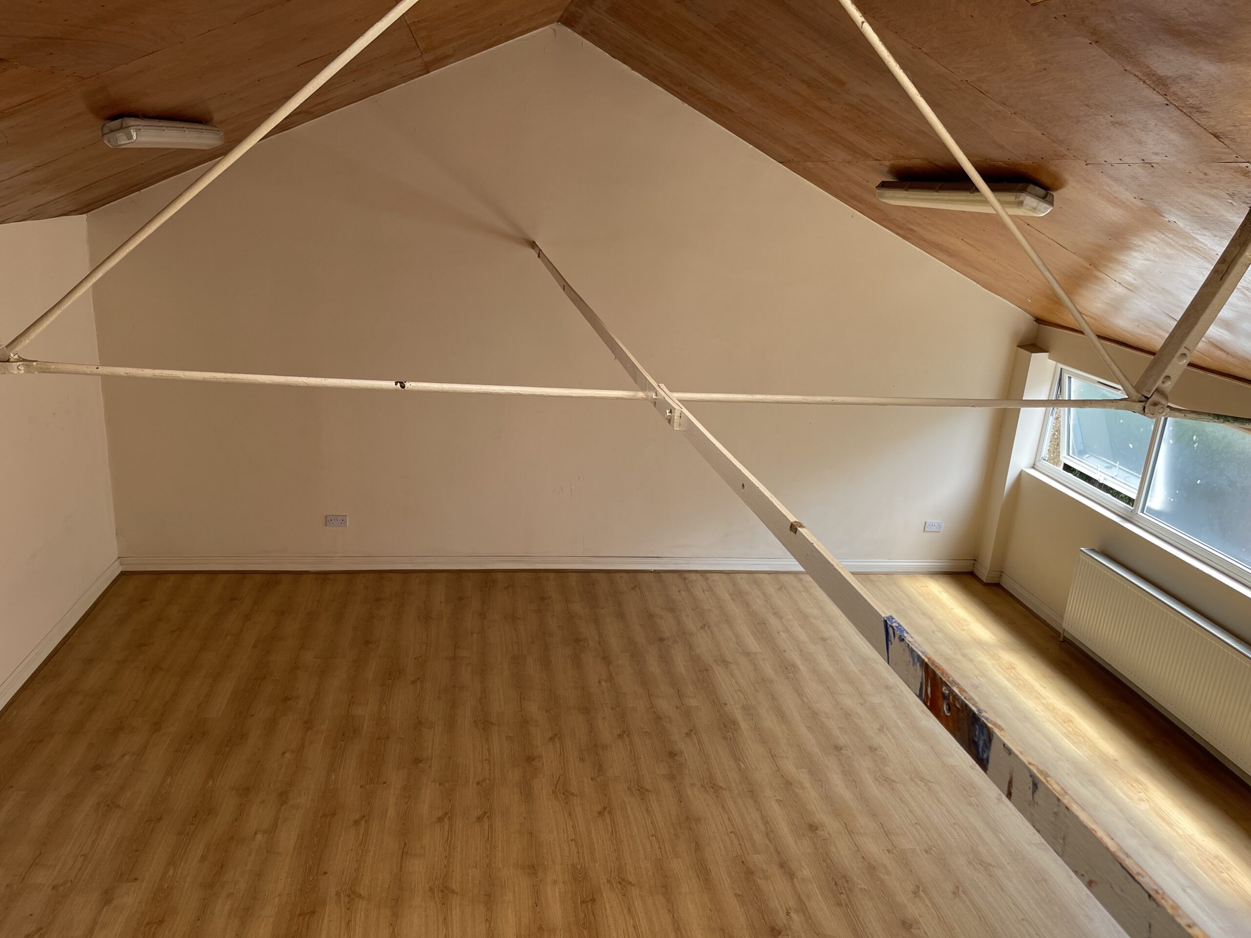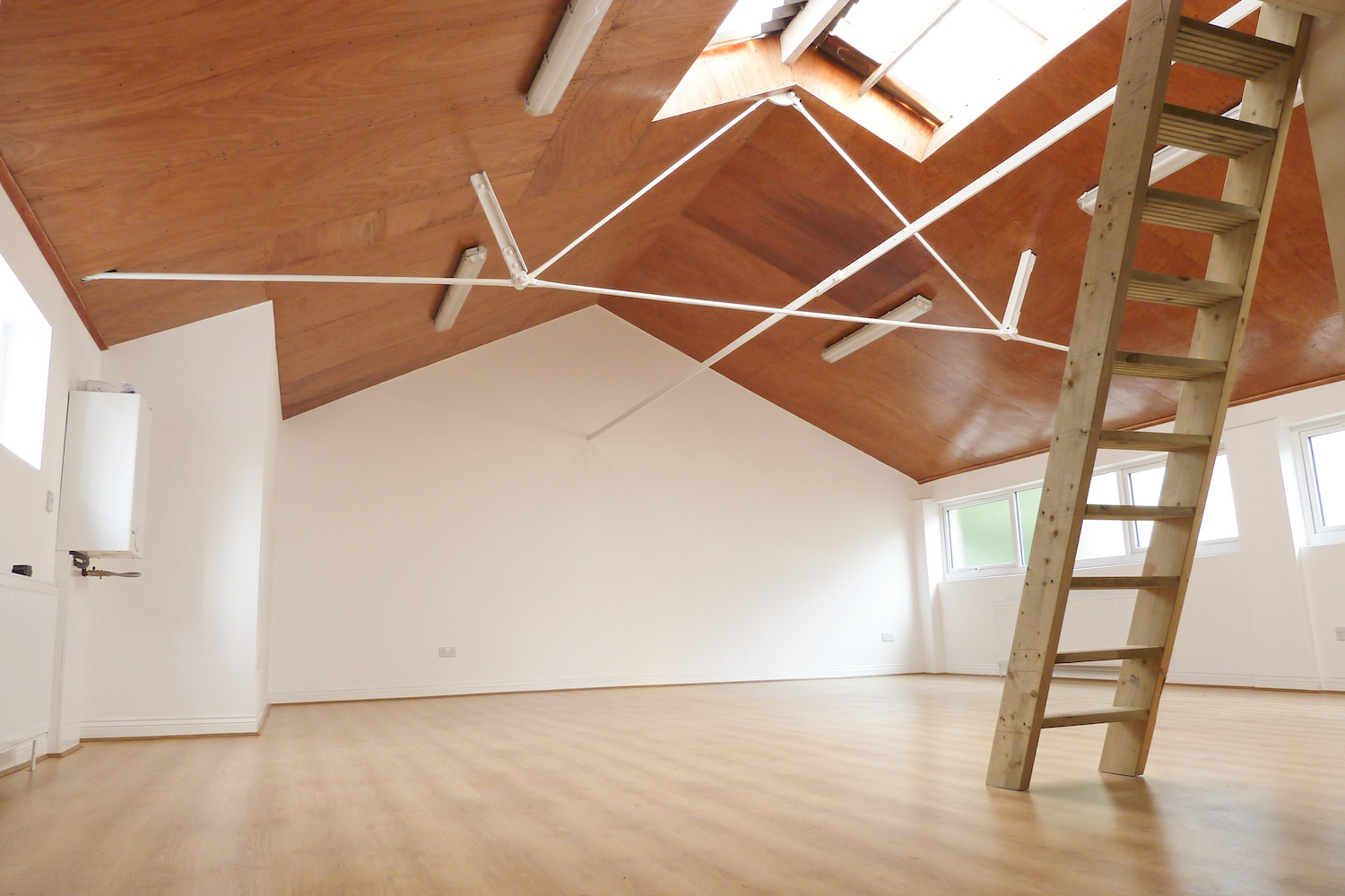 Beautiful open plan studio with pitched roof, wood floor, skylights and lots of natural light.