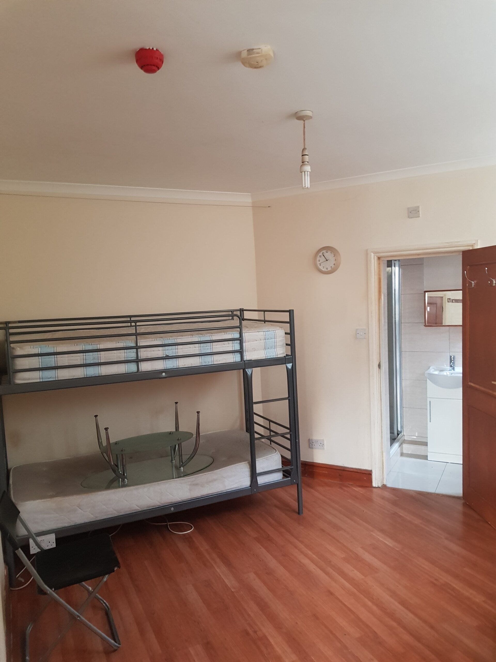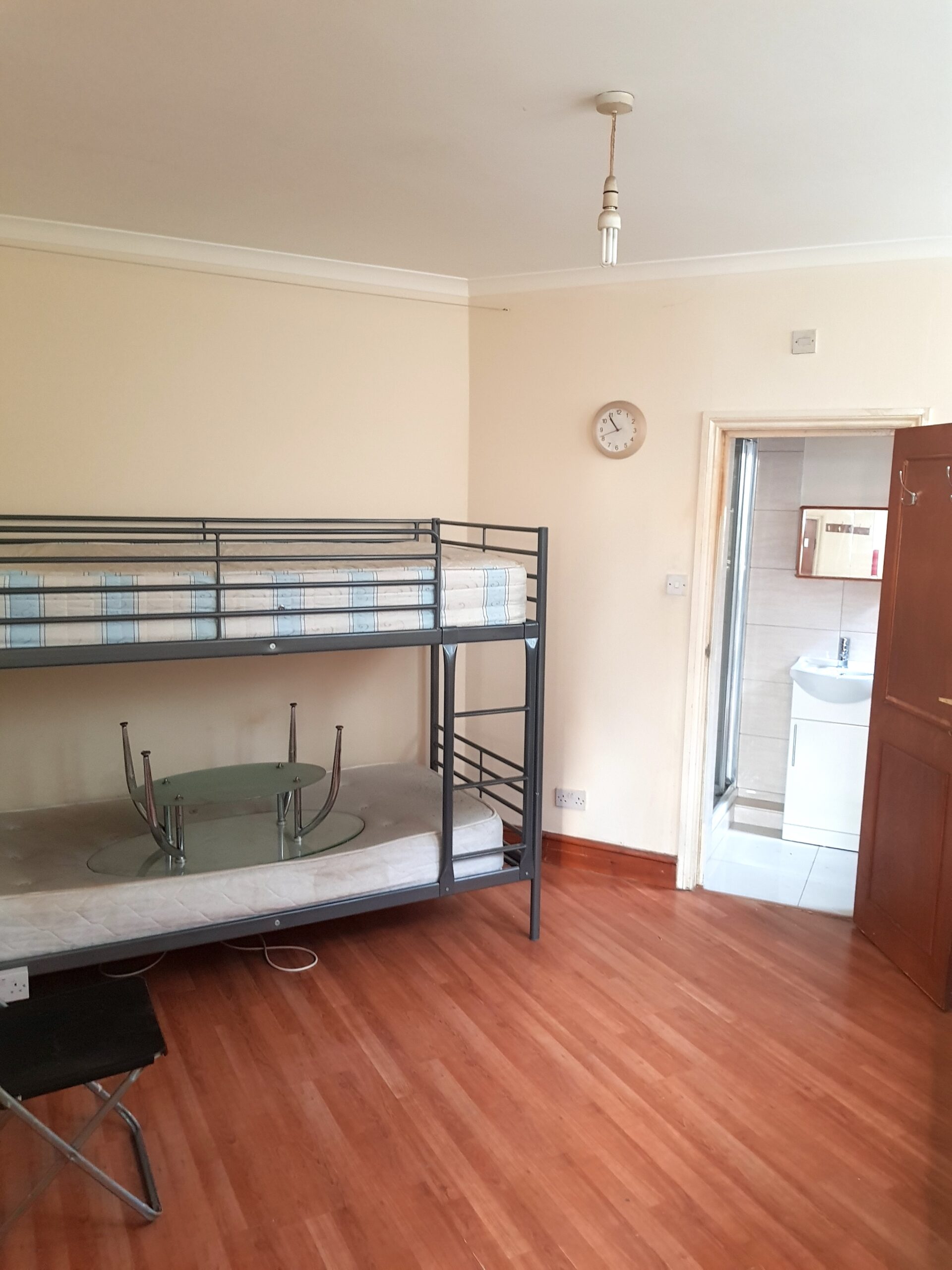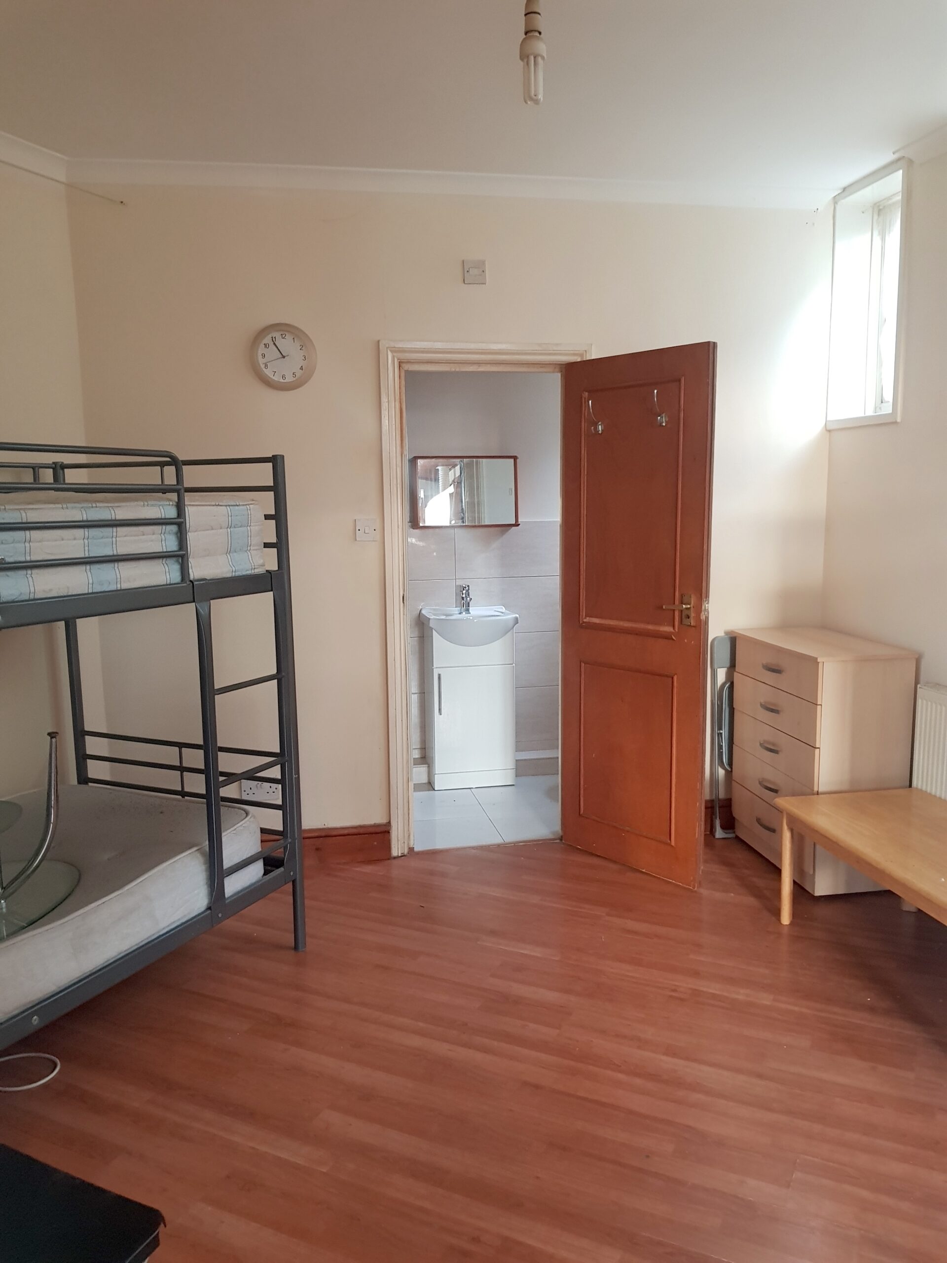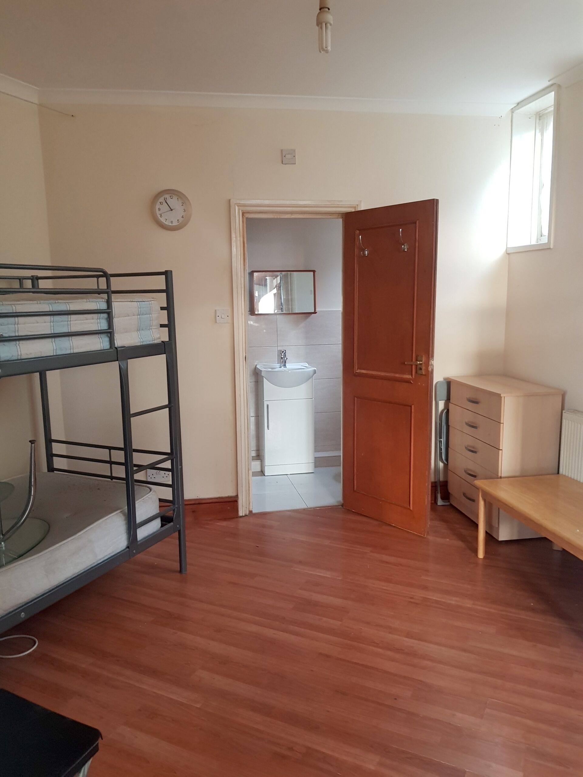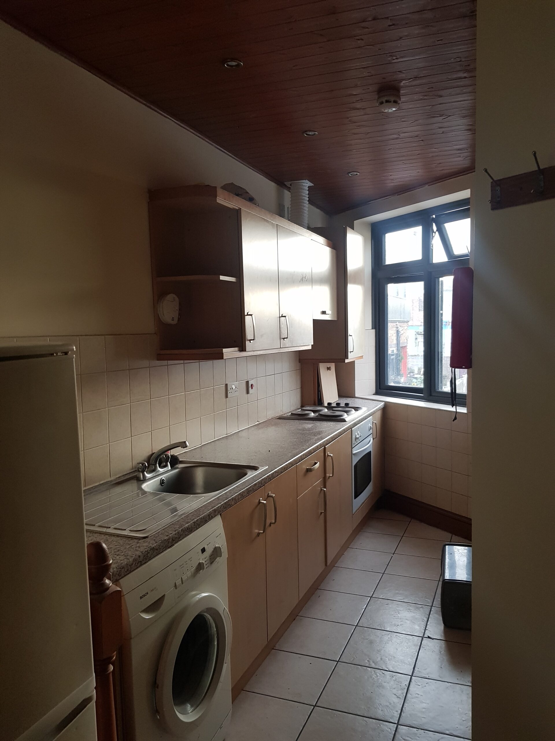 The whole flat has white painted walls, tiled kitchen, tiled bathroom and dark wooden laminate floors throughout the rest.