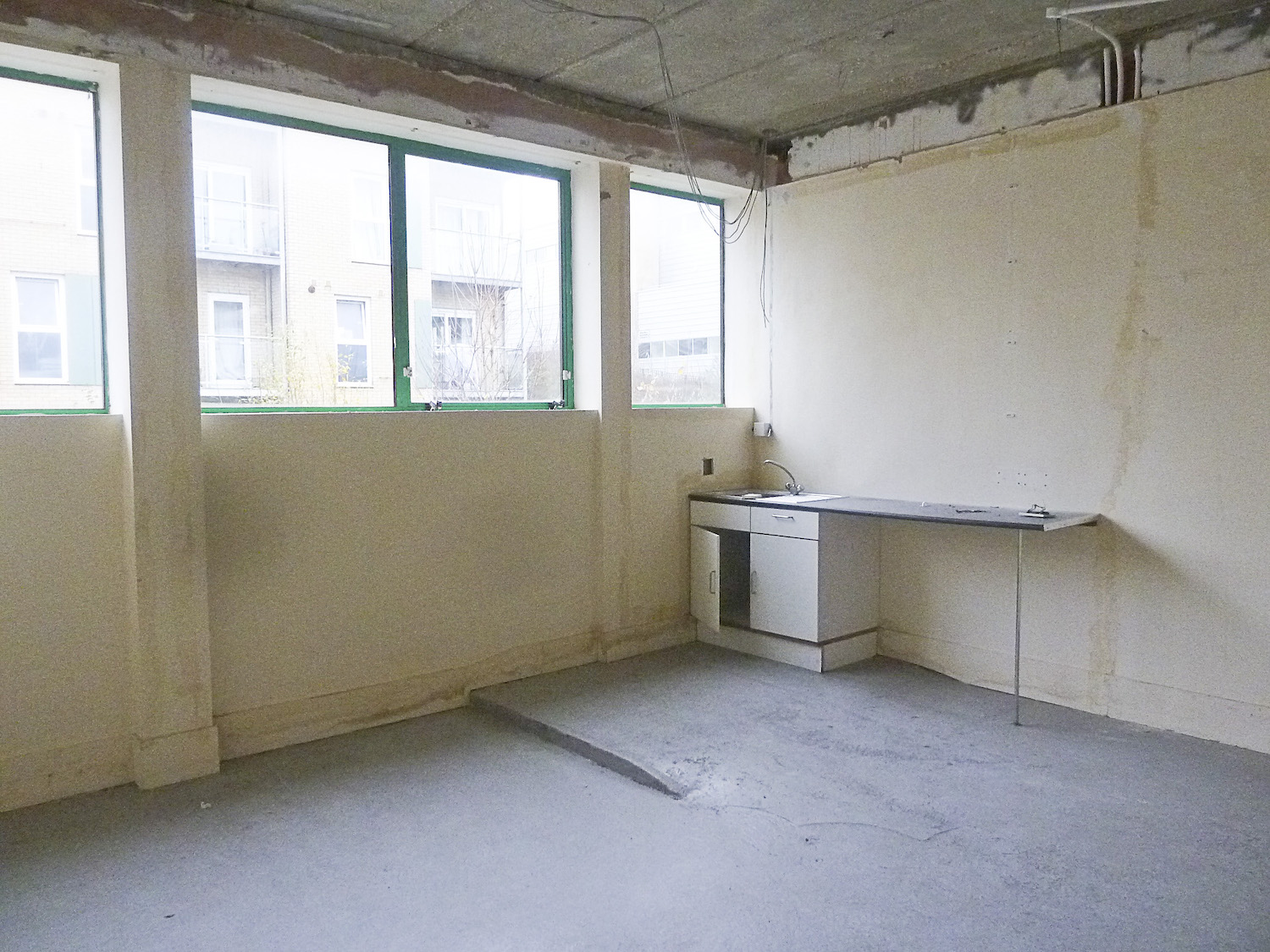The walls have been painted bright white, the concrete floor is flint grey and there are lots of windows to let in natural light.