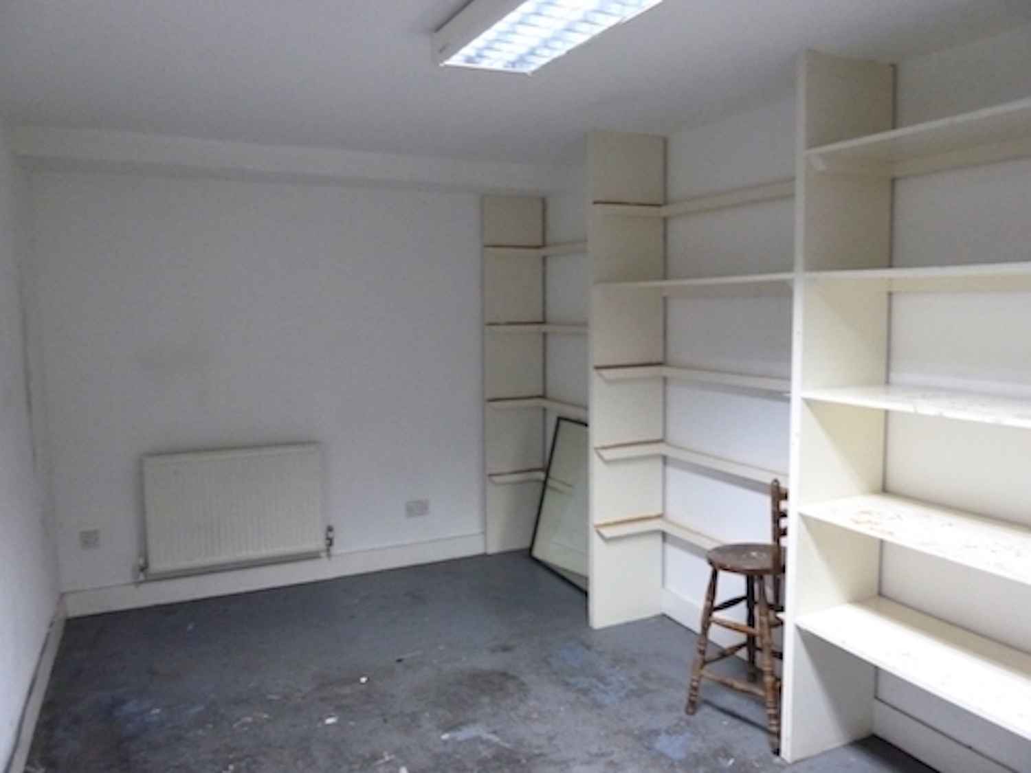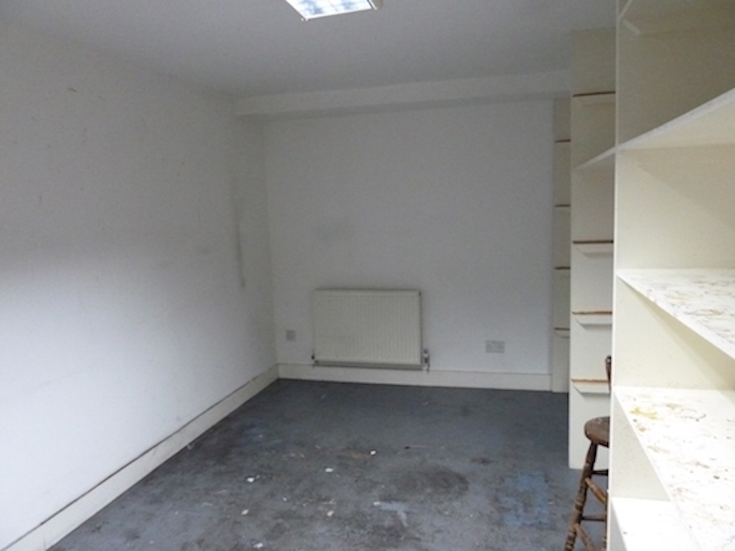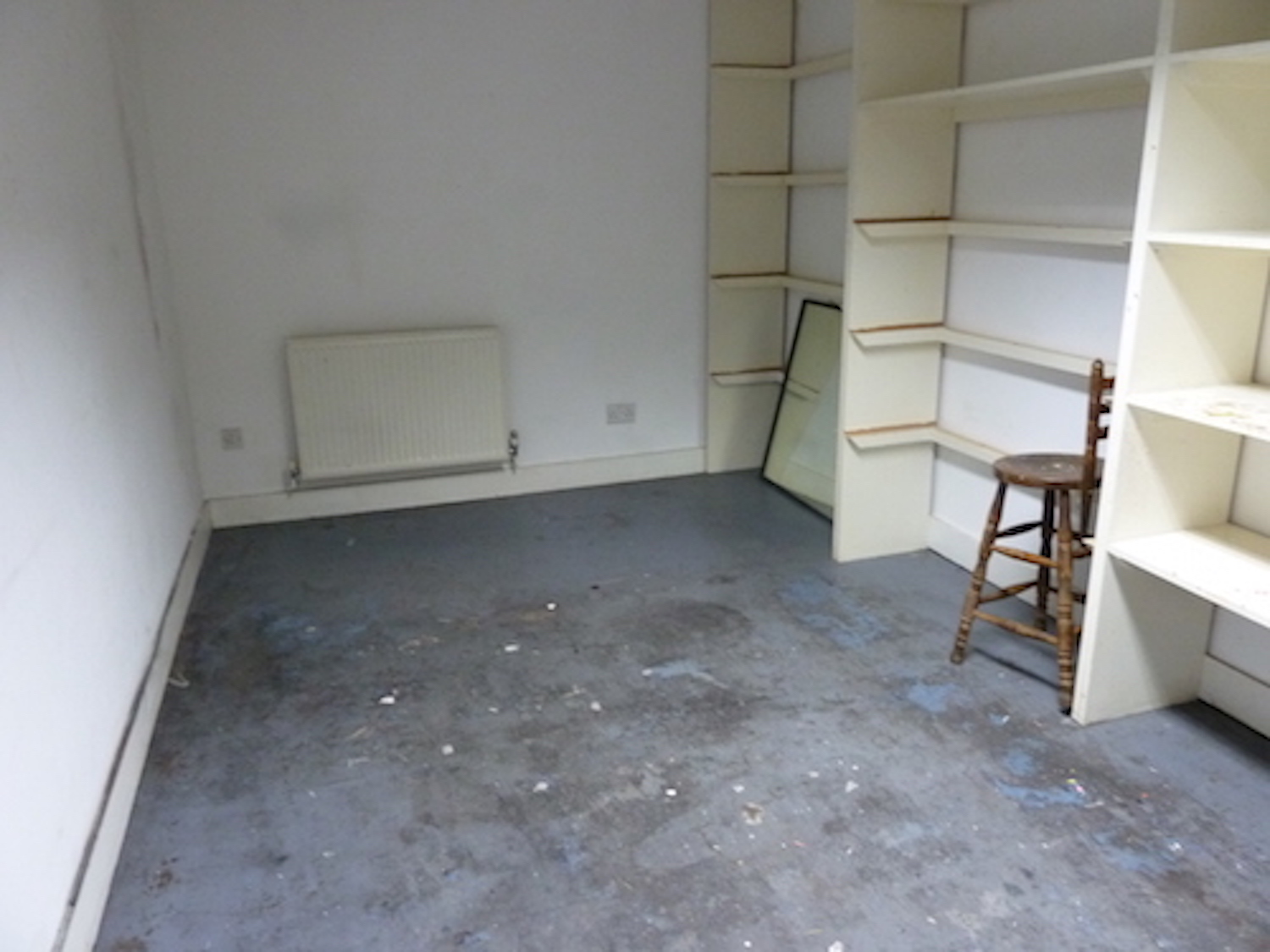 Studio is completely open and has a concrete floor painted light blue, large windows (facing into the hallway) and is gas centrally heated.