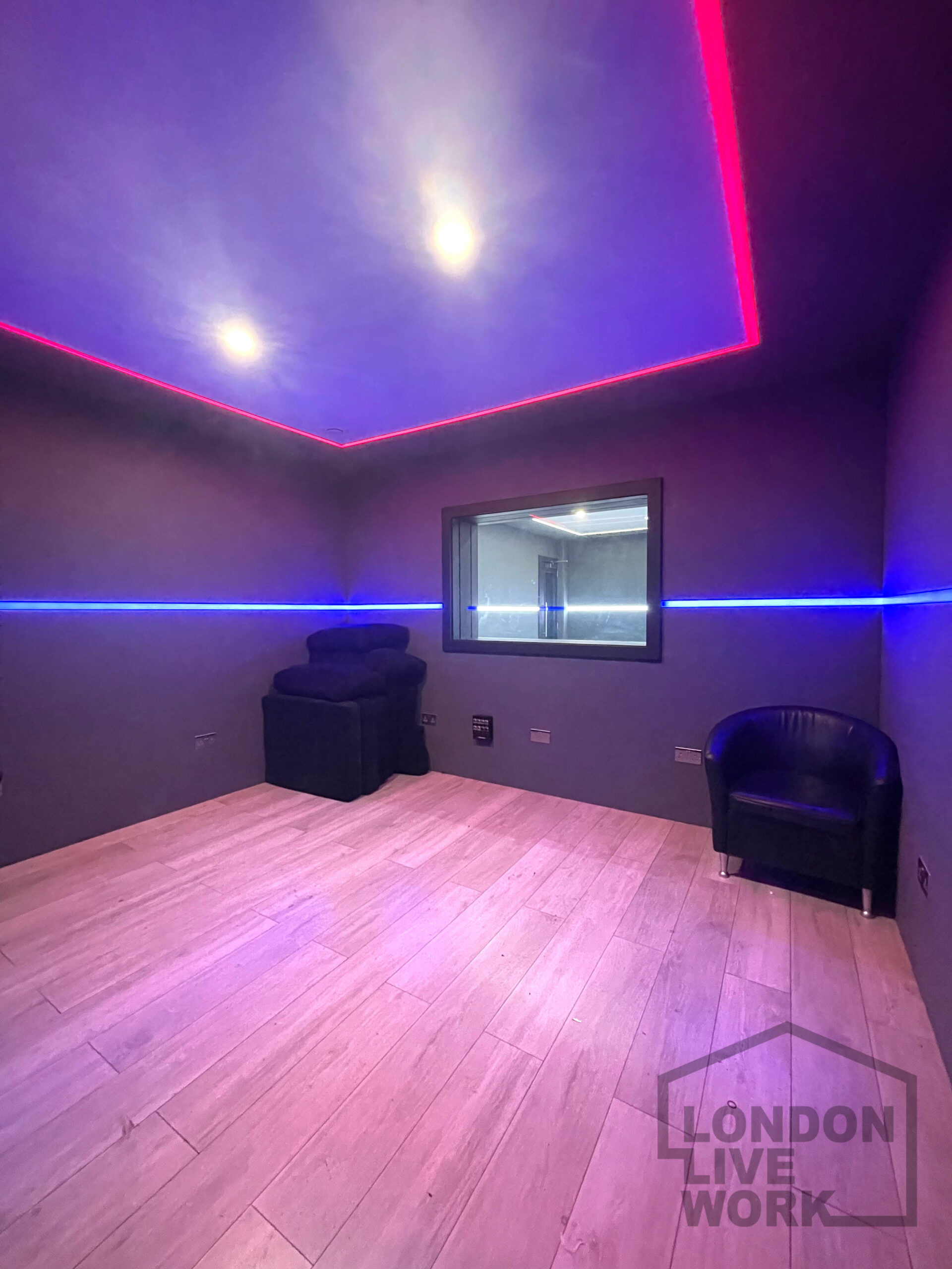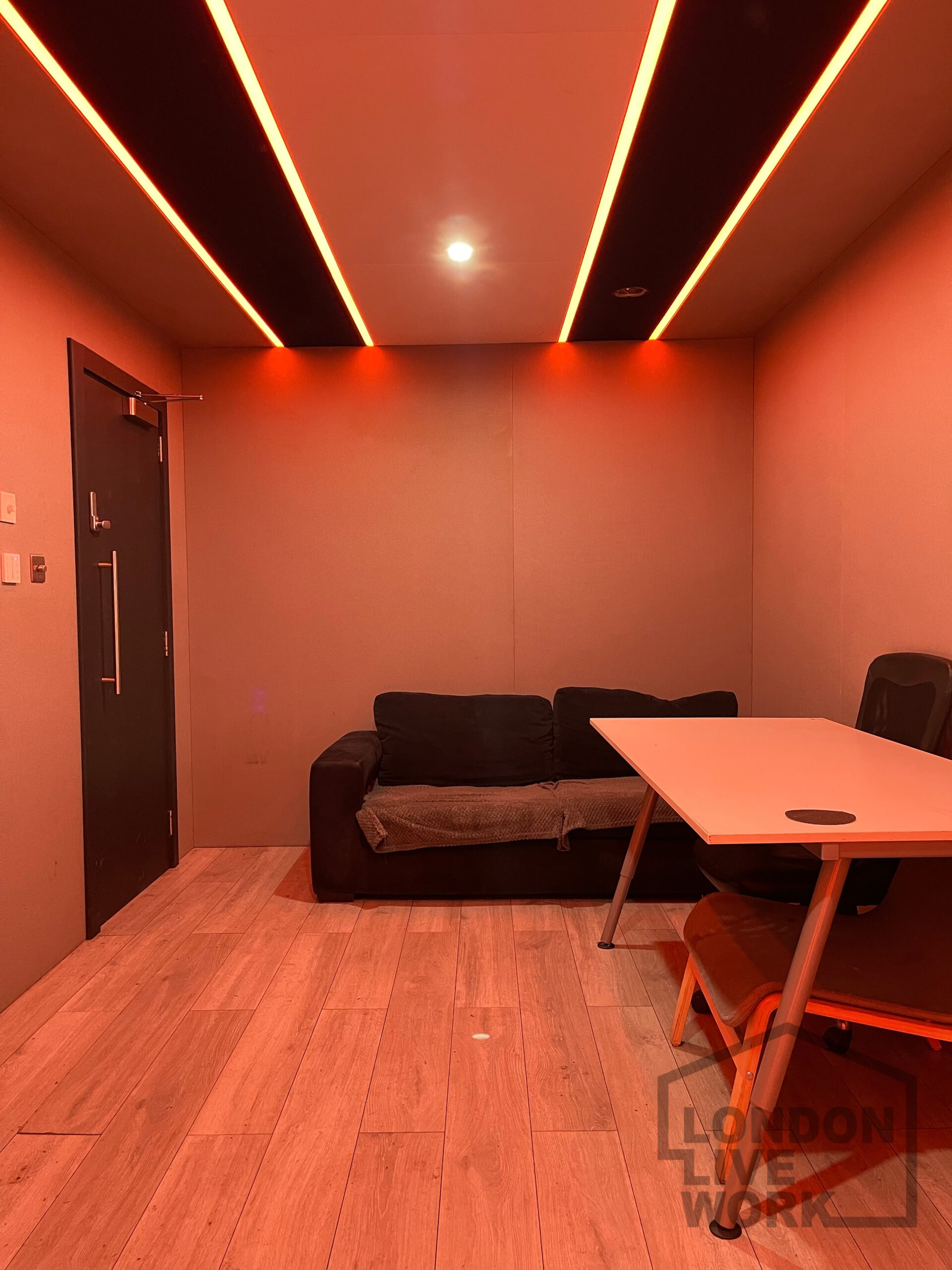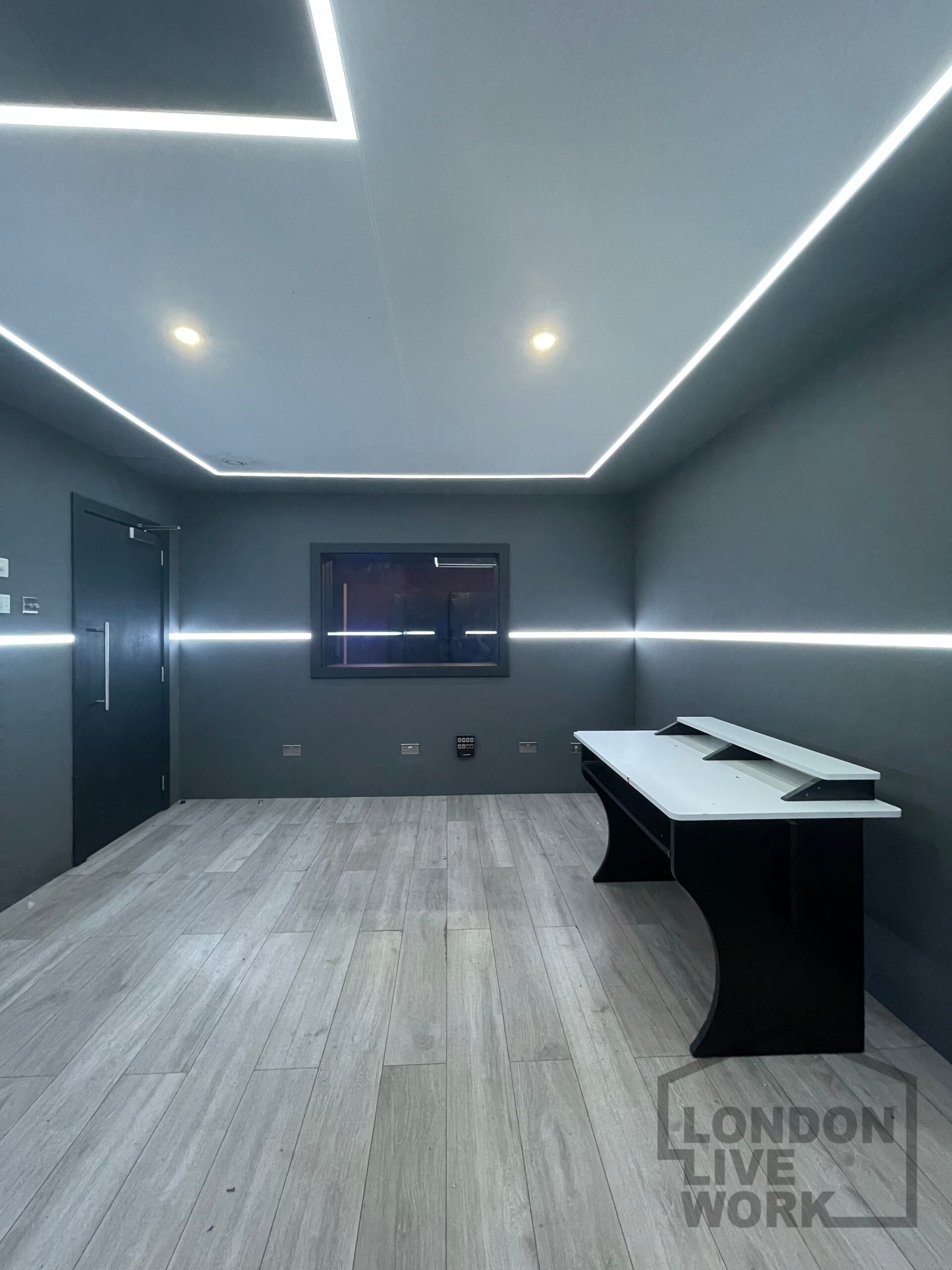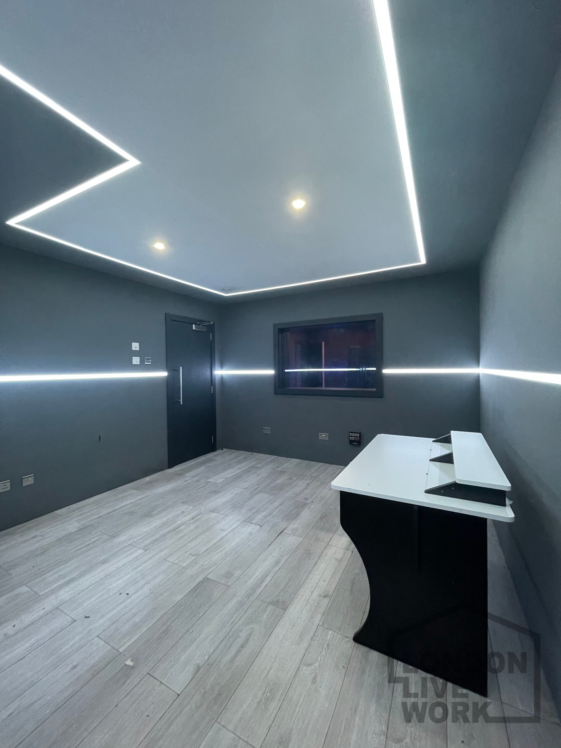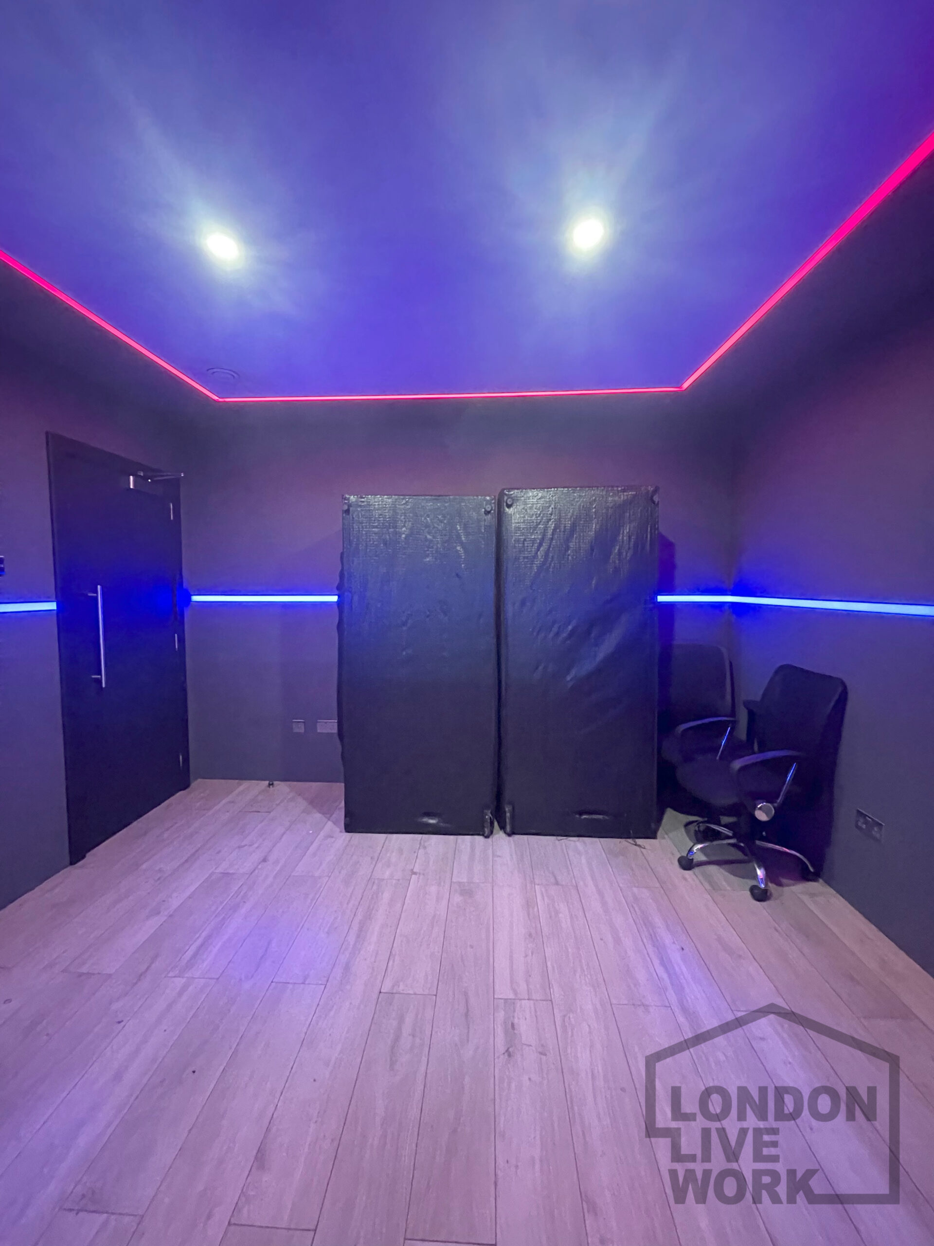 The studios are all soundproofed, have ventilation, electric sockets and led lights with neon backlights (both sets of lights can be turned on or off separately).