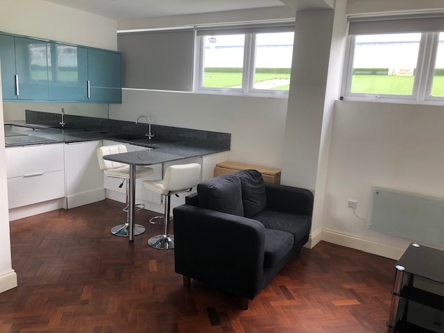 The flat has bright white painted walls, wooden laminate flooring and large double glazed windows throughout.