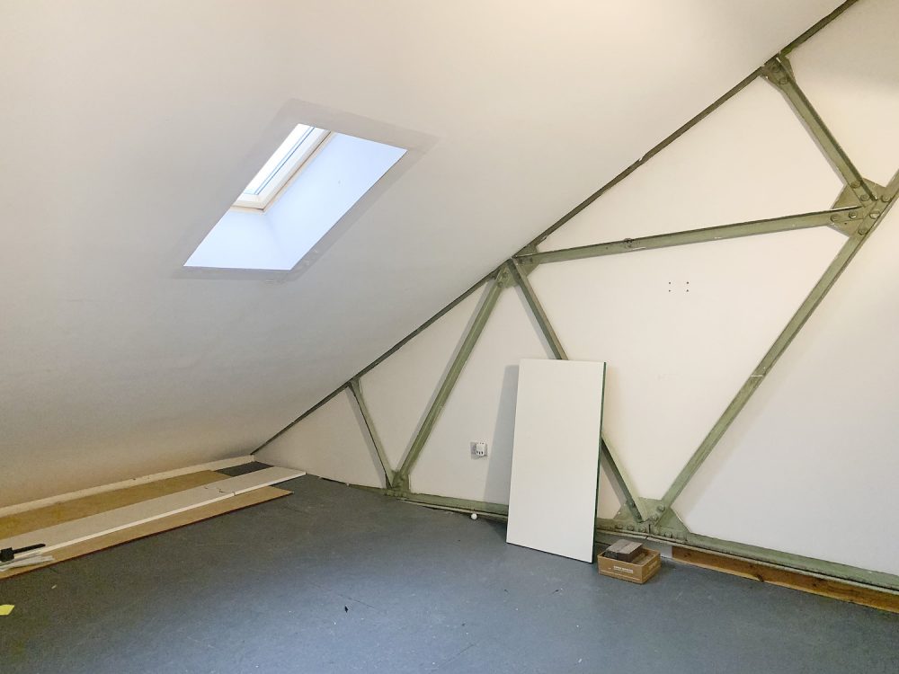 Studio: 1 consists of bright white walls, an open work space area with shelves, skylights for lots of natural light and a flint grey wooden floor.